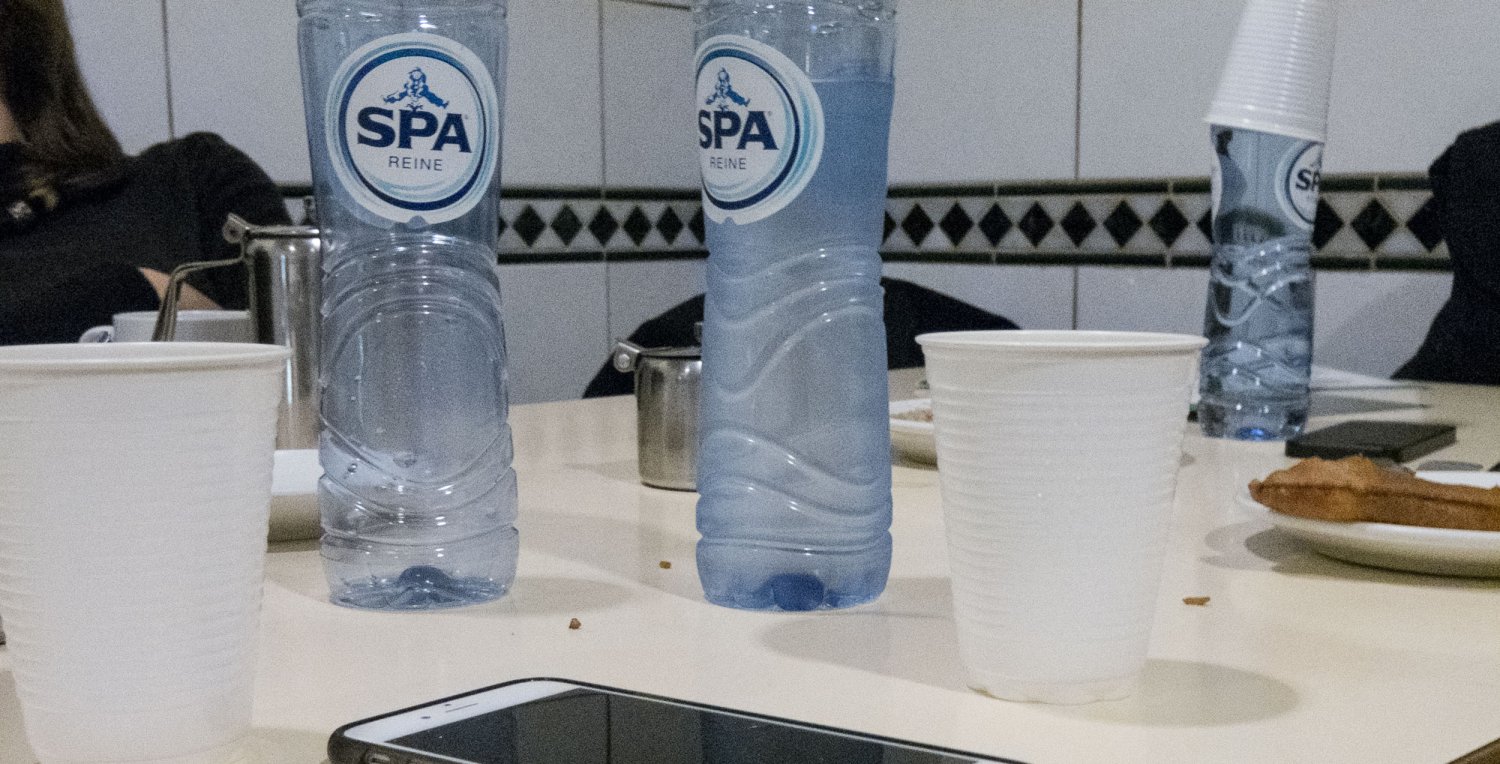 The titles and images are collaged together in a poetic way. The immediate and lo-fi aesthetic captures groups of people, zoomed in faces or the backs of heads, as well as empty hotel rooms, restaurants, a butcher shop, a theatre and city skyline. In some, text is pasted on in a clunky way, while others are read through the titles that remix their content: