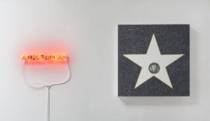 His most recent exhibition at Los Angeles Contemporary Exhibitions (LACE), The Palinopsic Field, is a further elaboration on his ideas of presence, the mind and perception. In this show, various empty templates of stars are hung along a wall alongside illuminated neon names of blacklisted screenwriters. Dalton Trumbo, Lester Cole, Ring Lardner Jr. and Alvah Bessie glow brightly in red, which, as the viewer looks at the light for a short duration, will continue to see each name as a perceptual afterimage, or ‘phantom’, upon the empty star. Like the afterimage produced when staring at the lighting, our conversation gradually departs from these neon works and begins to address the neurobiological and cognitive realm in which so much of Neidich’s practice is based.