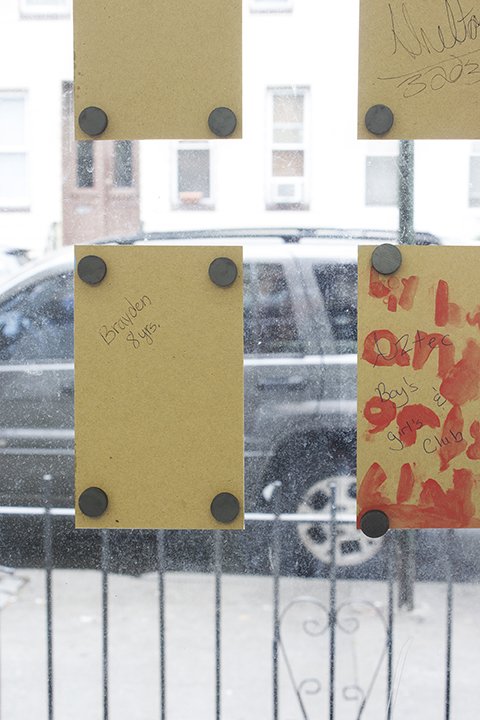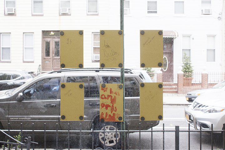 Handicraft elicits a minor-key sentimentality throughout Four Corners Properties that counteracts the top-down iconography sewn into the textile book lying at the center of the exhibition space’s floor. Peel’s book, Le Troupeau solitaire reads as a collection of bad bovine humor —there is at lease one ‘udder’ pun —that ultimately emphasizes the ways in which the flora and fauna of the American West have stood as icons variously humorous and powerful but always in service of humankind. Cleverly installed on the gallery’s large street-facing window, Peel’s own ‘paint by numbers’ coloring pages, completed by children attending a horse rehabilitation educational program, address passersby with spirited expressions of the loving relationships possible between humans and animals. The backs of the coloring pages bearing the names and ages of the young artists face the gallery’s interior as pragmatic if cheeky reminders that new conceptions of nature are yet to be imagined.**