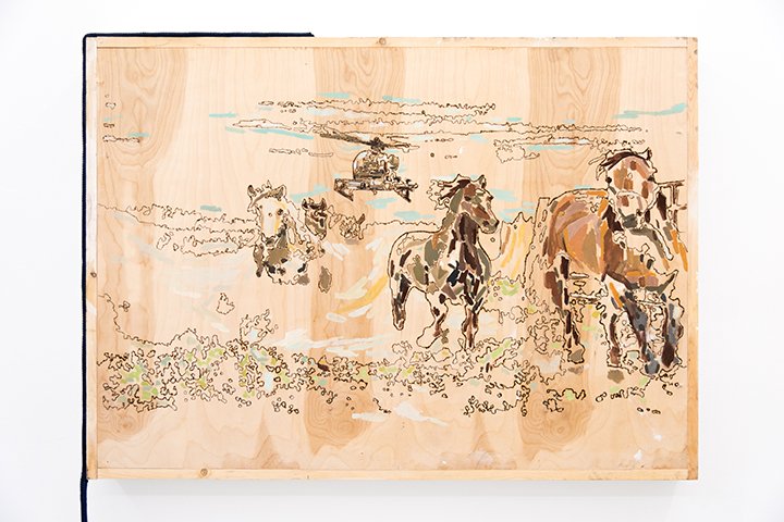 Colorado-born Peel’s journalistic report —the BLM really does manage the nation’s wild horse population with helicopters —unfolds across the three burnished and painted wood panels hung on each of the gallery’s walls. The ‘Wild Horse Catch, Treat and Release Gather’ is a program that seeks to maintain the number of feral horses grazing on public land. Peel recreates images from this program by burning lines into pine planks and applying a painterly scattering of pastel marks, the colored segments overlapping the scorched edges of etched lines. Images such as the ones re-interpreted through the artist’s handicraft have played a large part in the scrutiny of the Bureau of Land Management’s policy of removing quotas of grazing animals from public land. An infamous video shows a stallion in a containment pen experiencing such immense psychological distress that it smashes its head into the walls of its enclosure until breaking its neck and falling over, paralyzed. In Peel’s work, these disconcerting scenes of man versus beast are conceived using the same nostalgia that has induced the look and feel of farm-to-table restaurants and boutique consumerism.