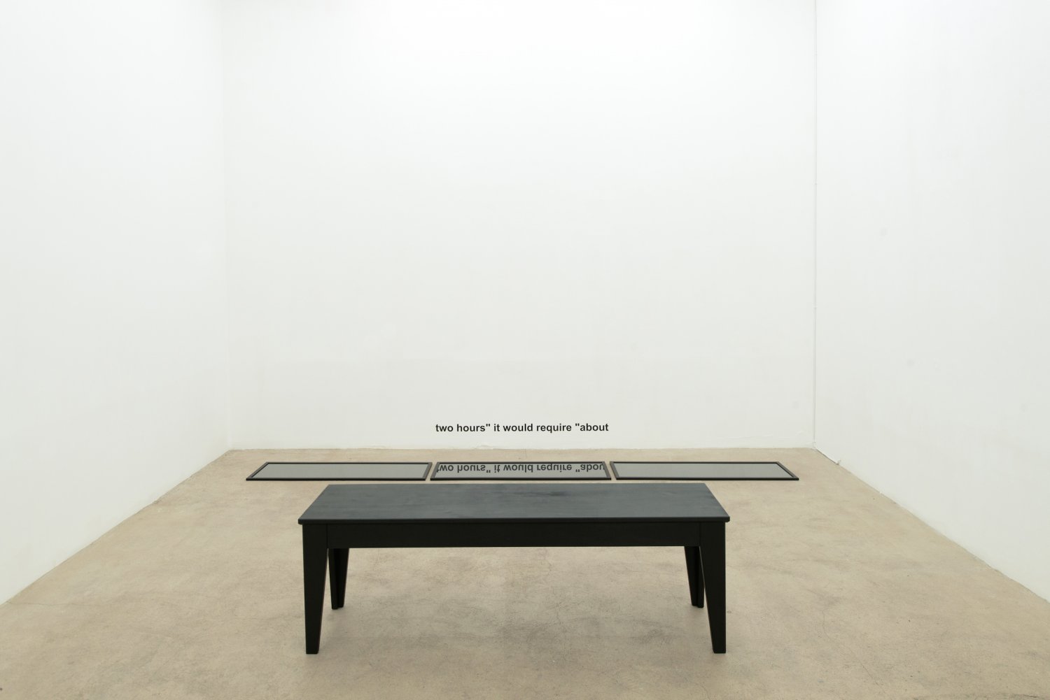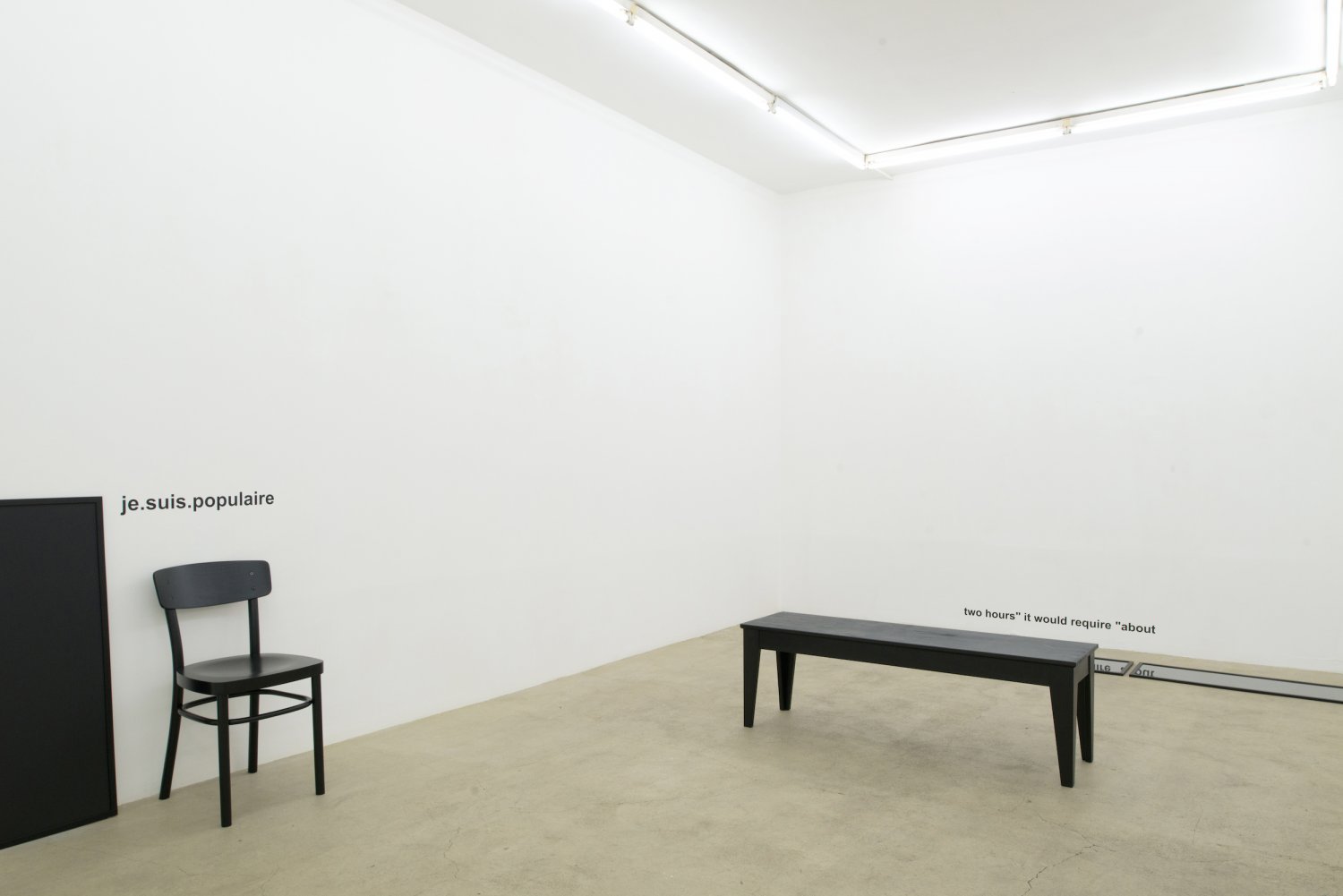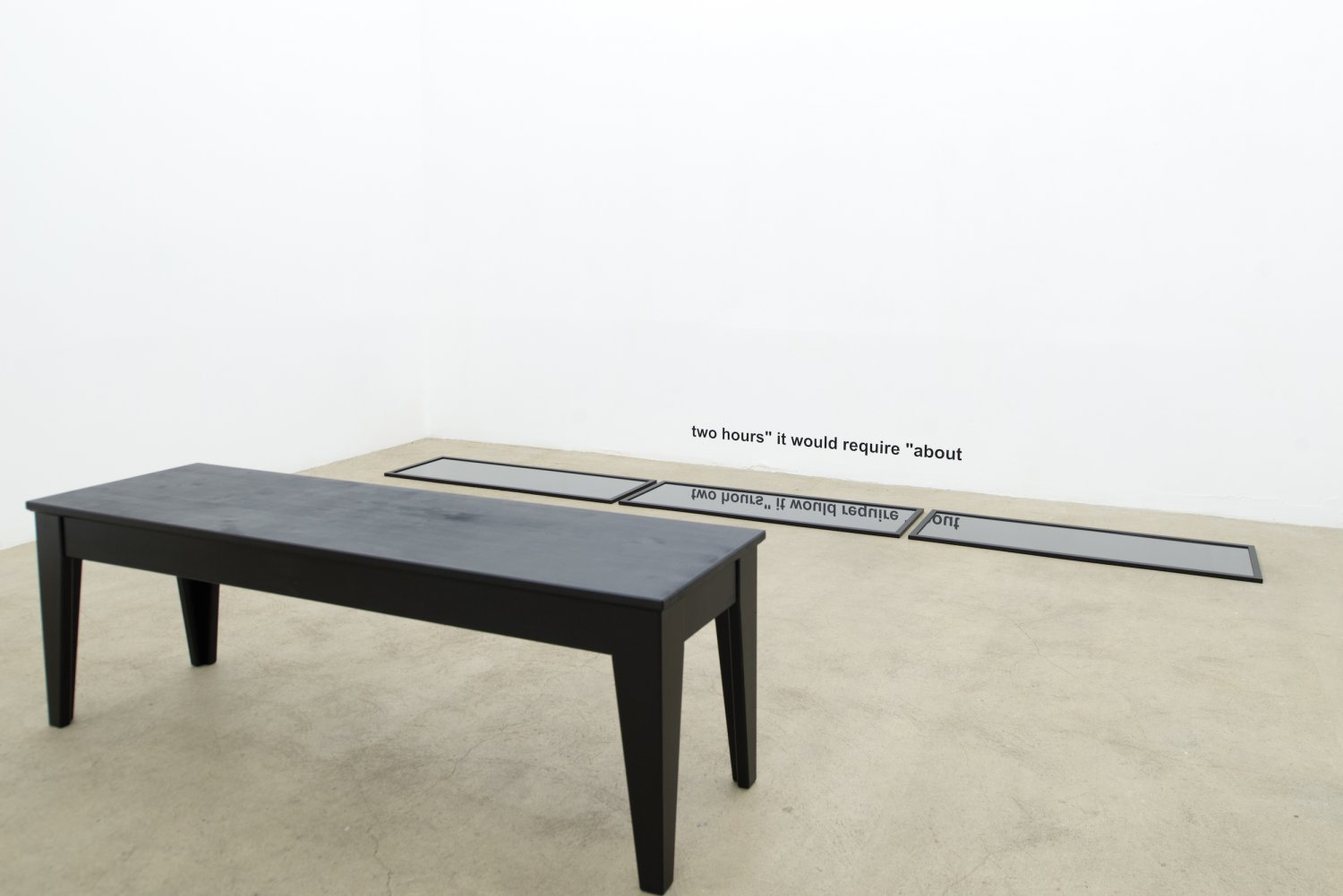 The installation consists of wood frames, black cardboard, glass, vinyl lettering, chairs and a bench that make up a delicate and minimal aesthetic, where fragments of sentences and lone words converse with the static objects placed beside.**