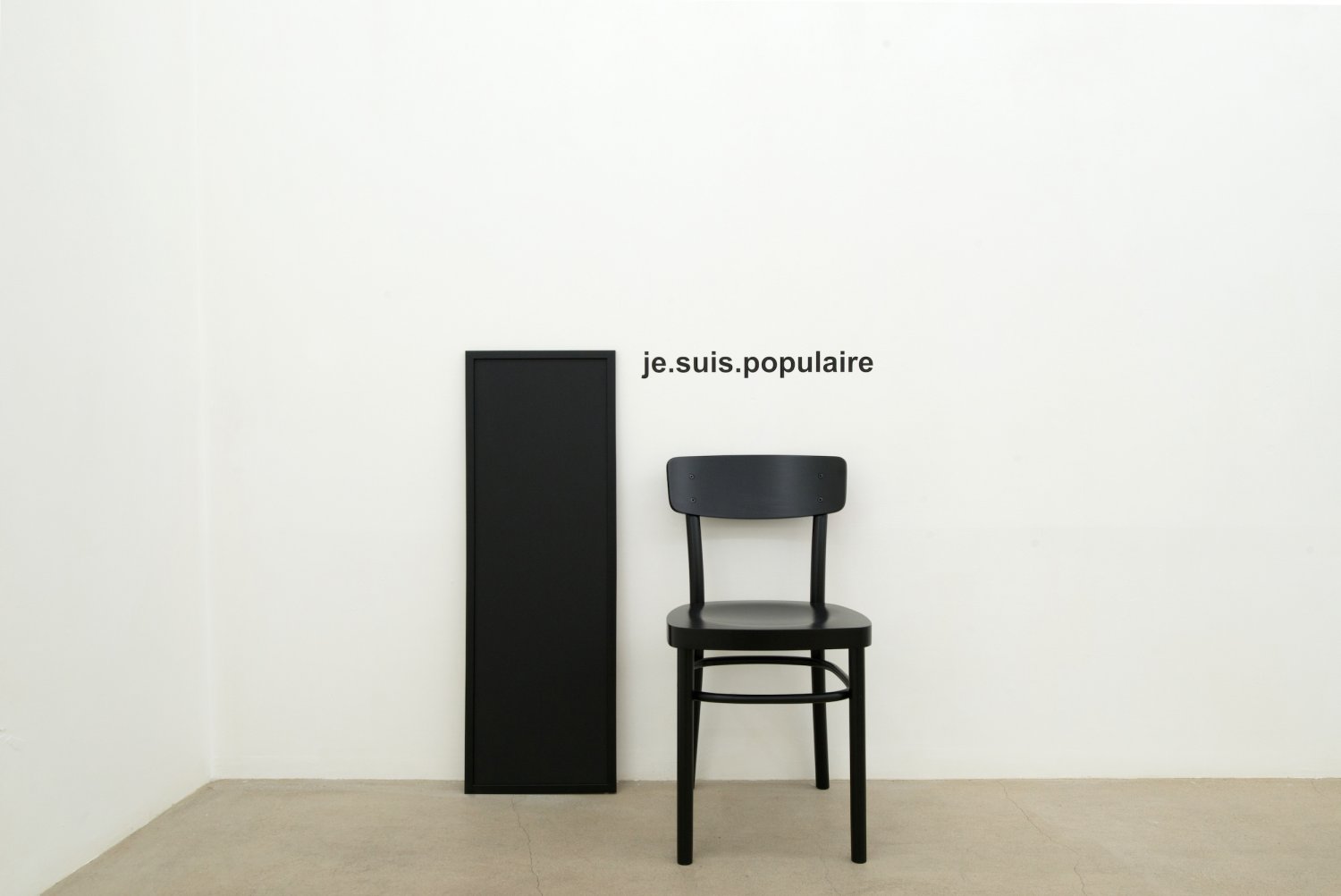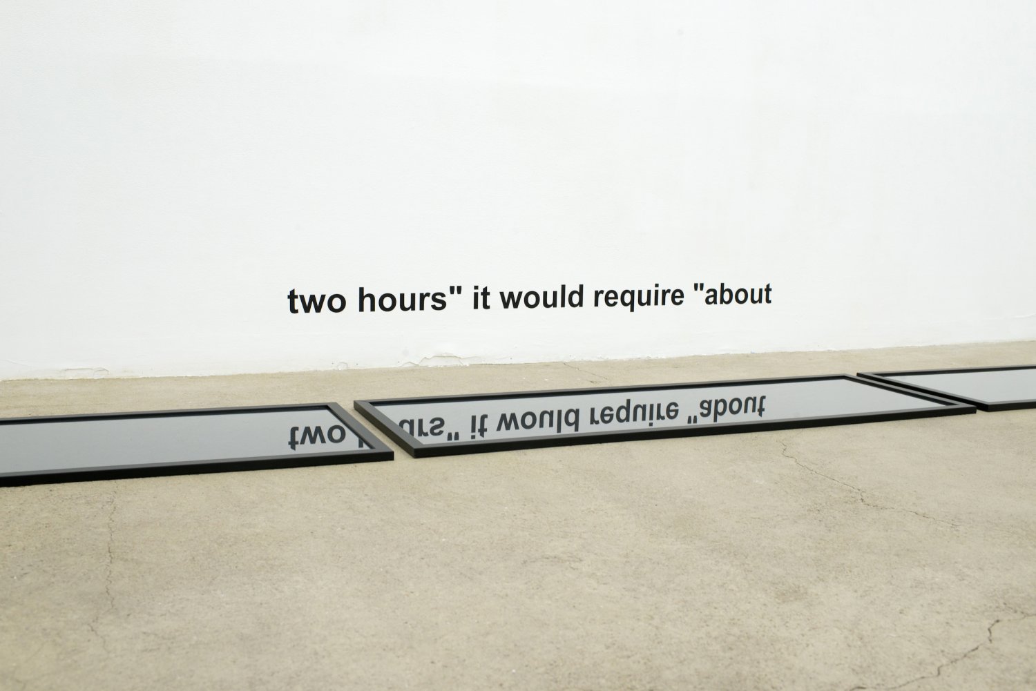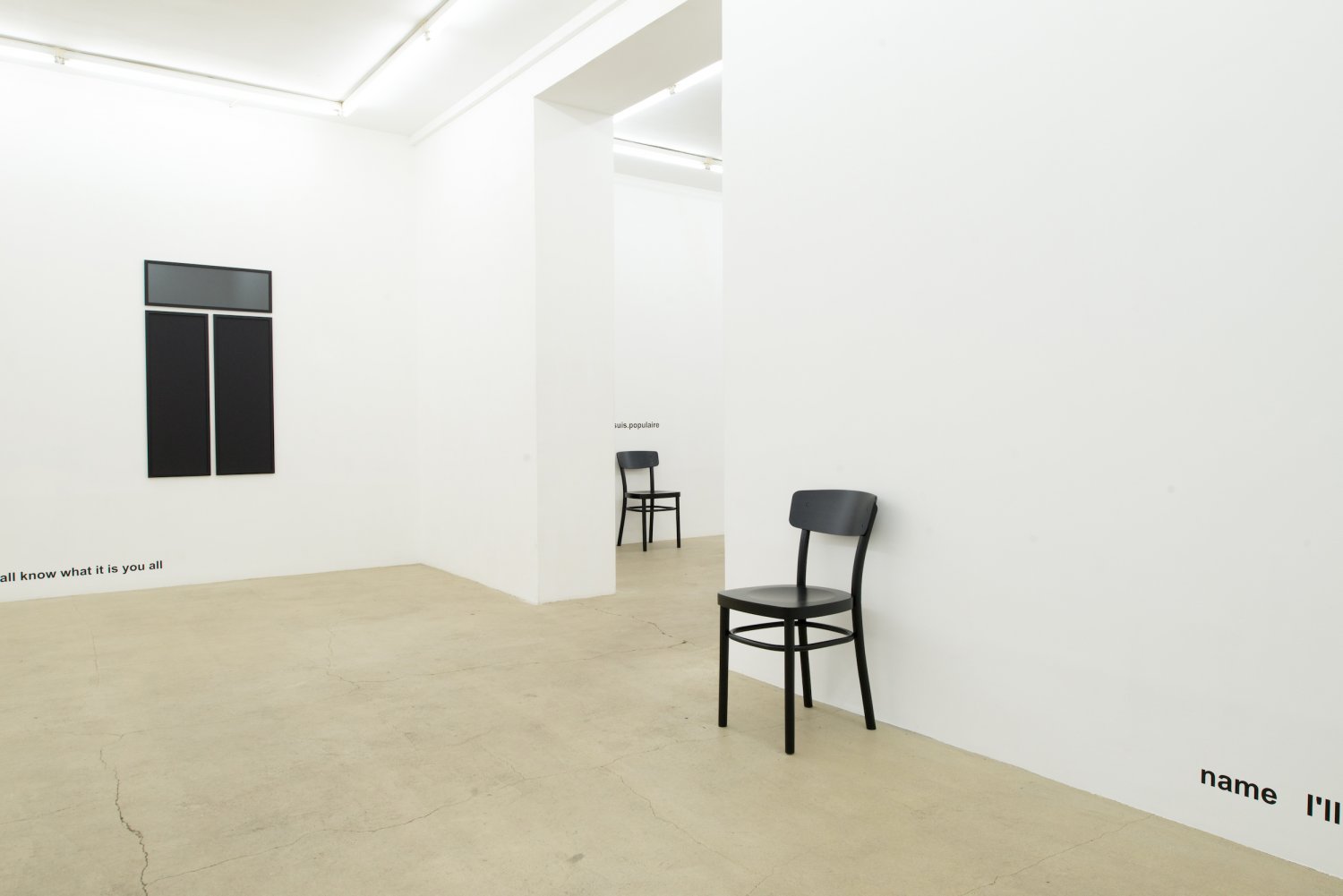 The installation consists of wood frames, black cardboard, glass, vinyl lettering, chairs and a bench that make up a delicate and minimal aesthetic, where fragments of sentences and lone words converse with the static objects placed beside.**