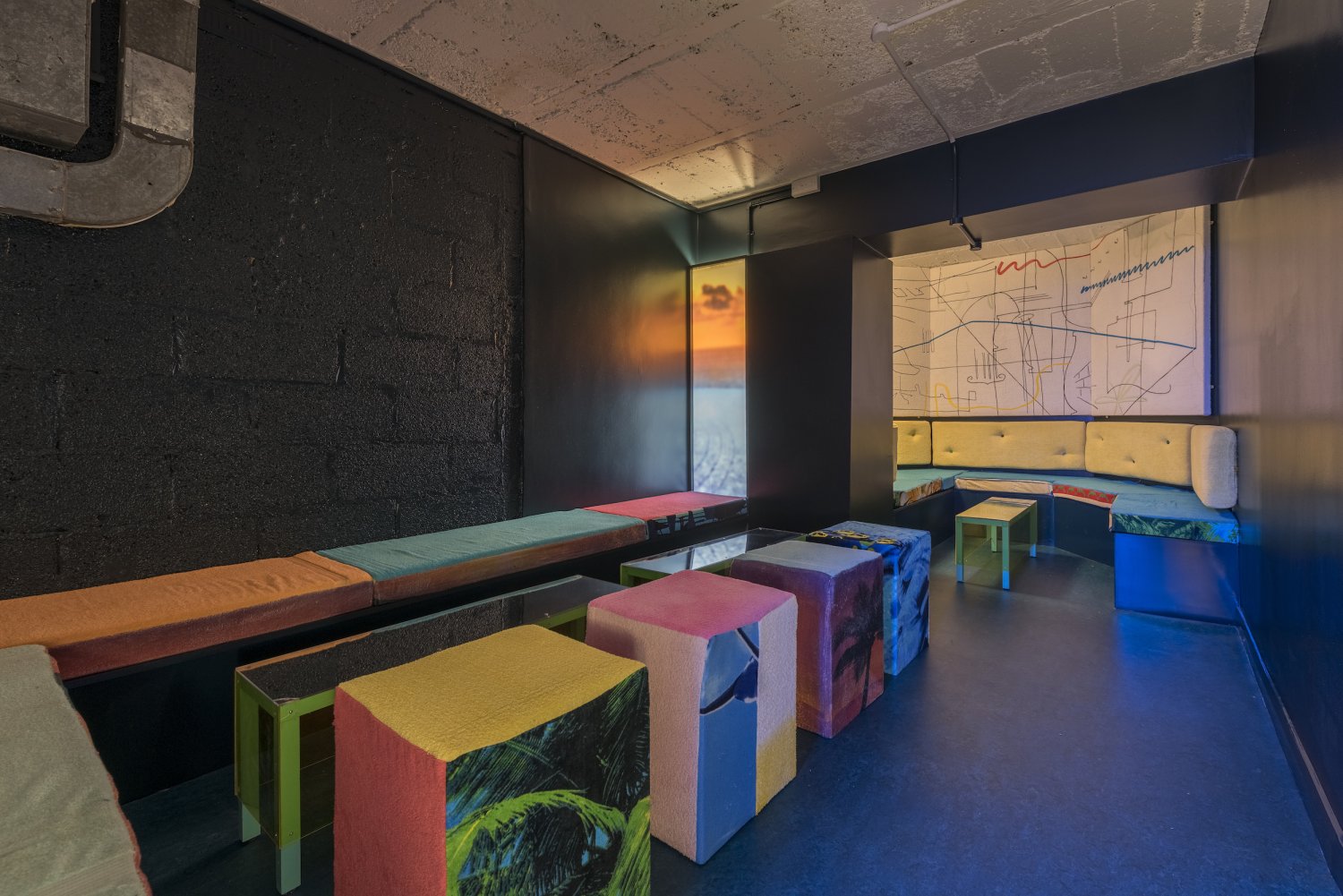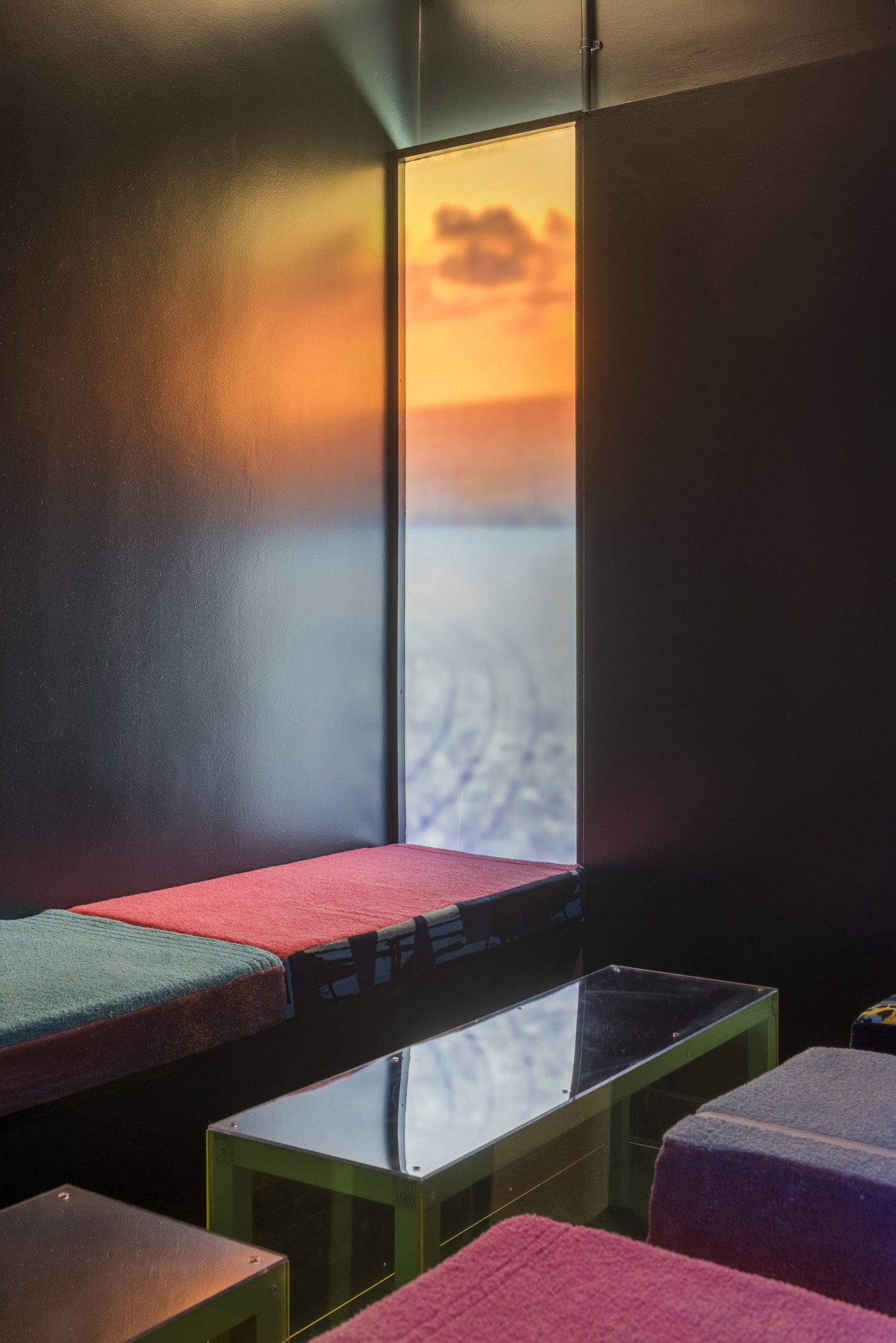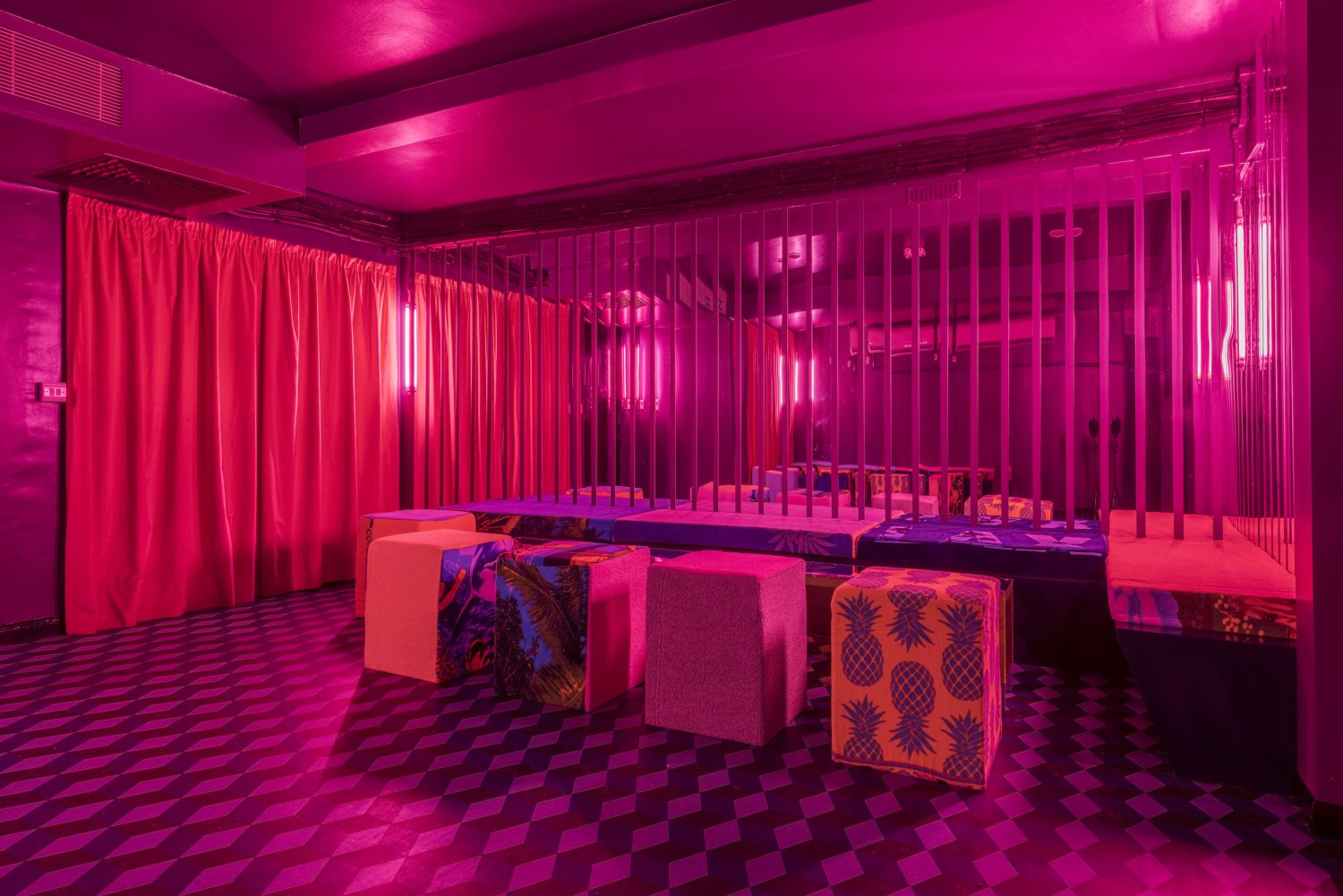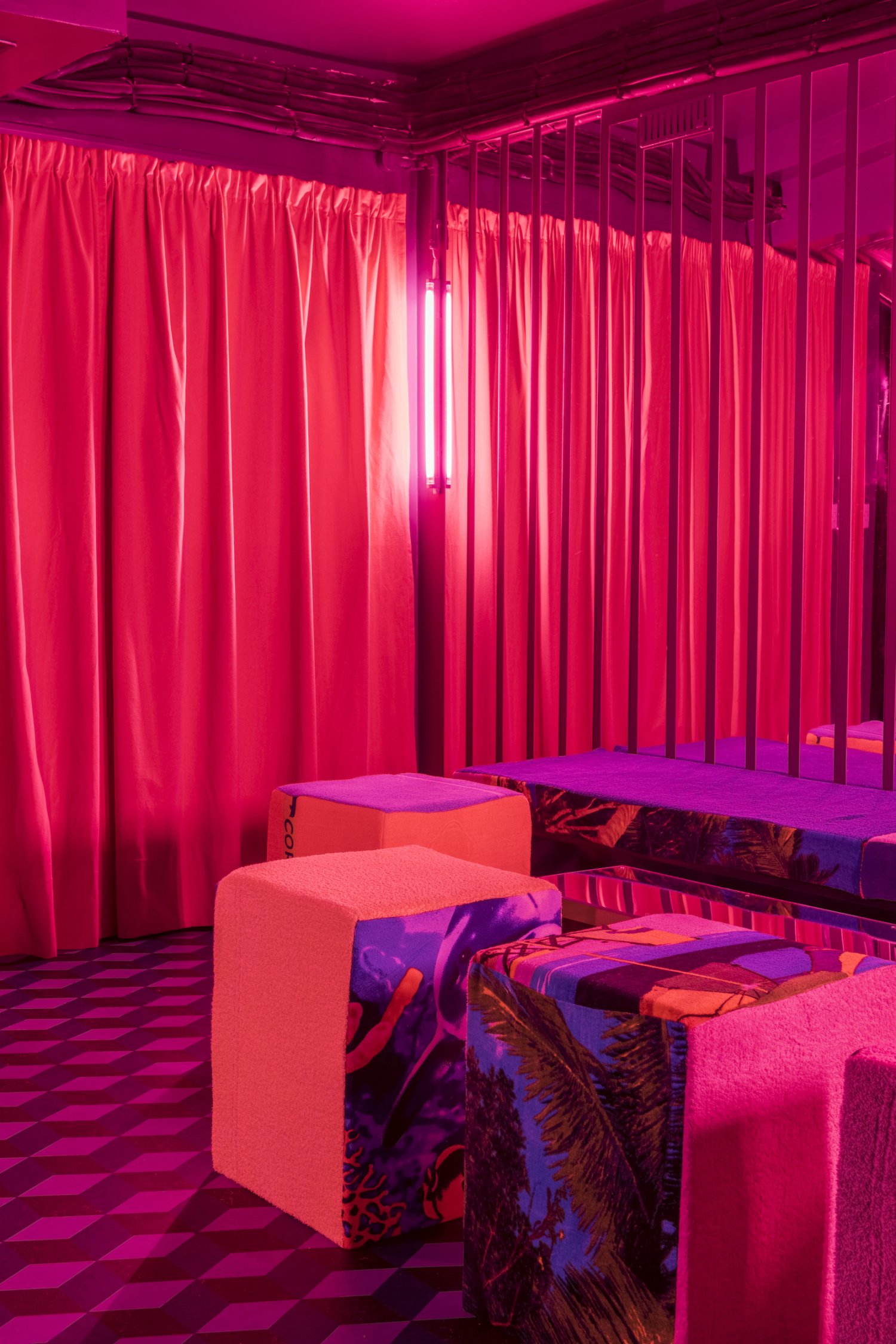 The stools and benches are softened by upholstered beach towels and pink and blue hues flood the space. Tuppen scripted the design to “reveal the historical narratives of the building, as well as layering in his own fabricated fictions exploring the human relationship with escapism and hedonism.”