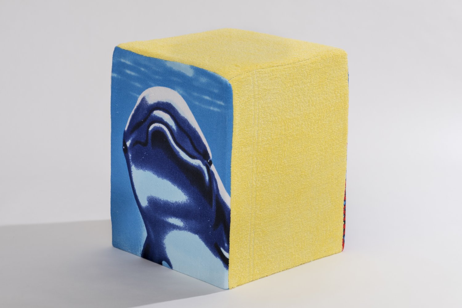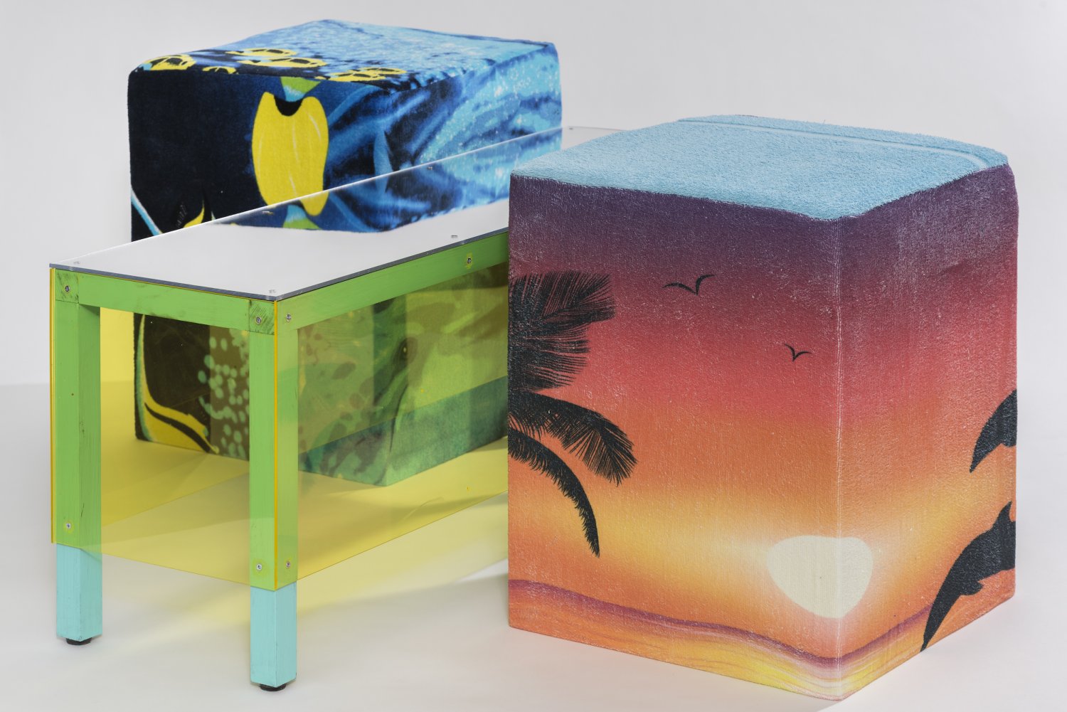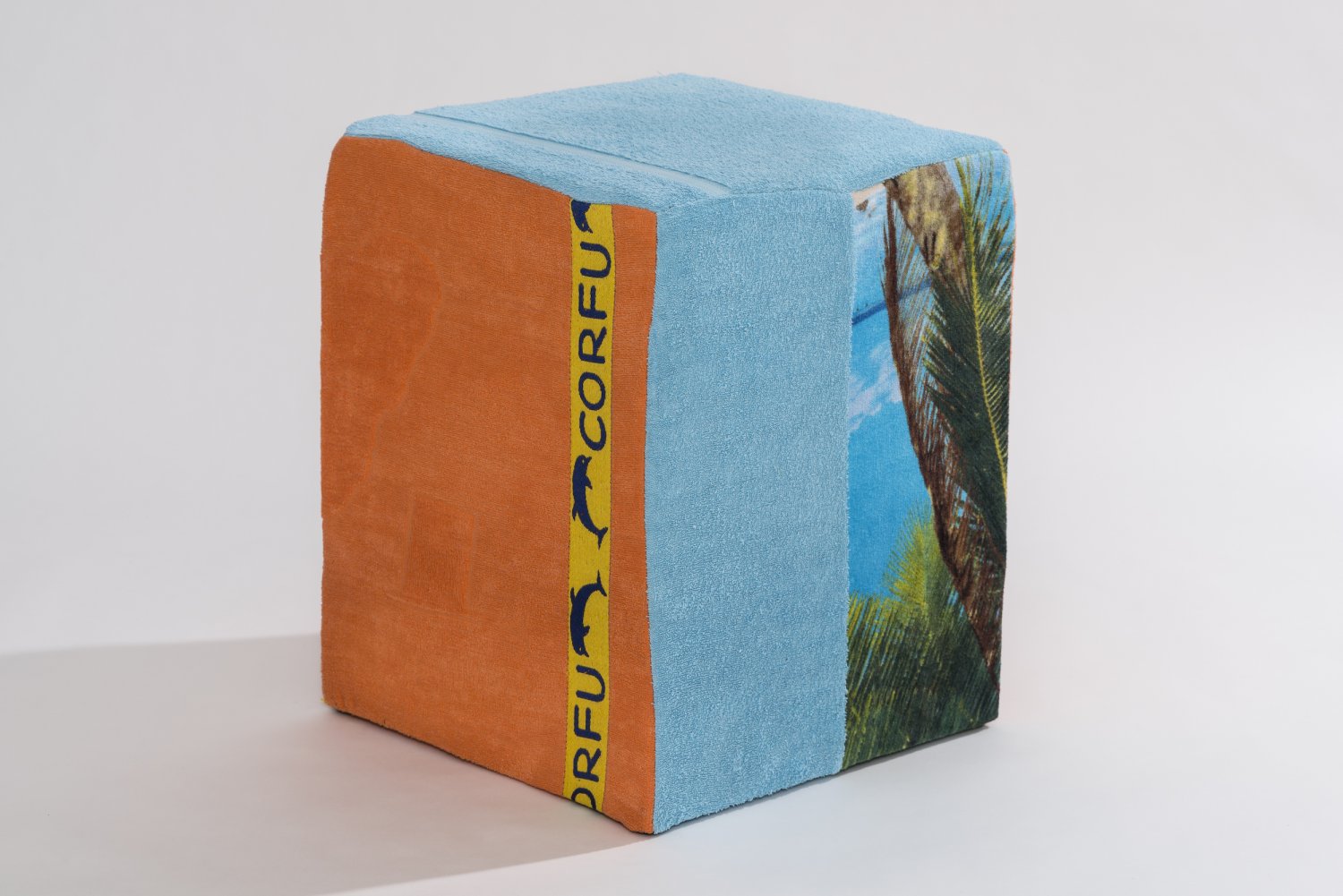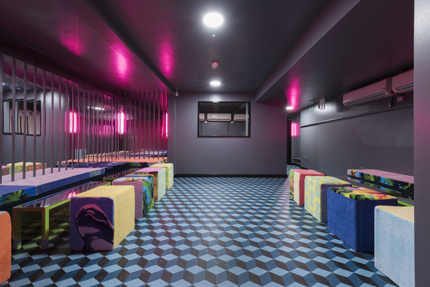 The stools and benches are softened by upholstered beach towels and pink and blue hues flood the space. Tuppen scripted the design to “reveal the historical narratives of the building, as well as layering in his own fabricated fictions exploring the human relationship with escapism and hedonism.”