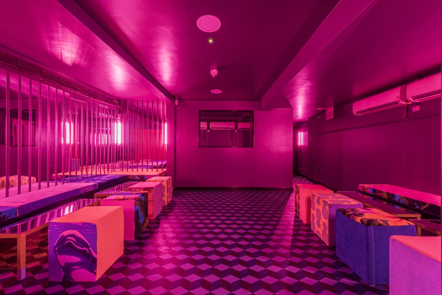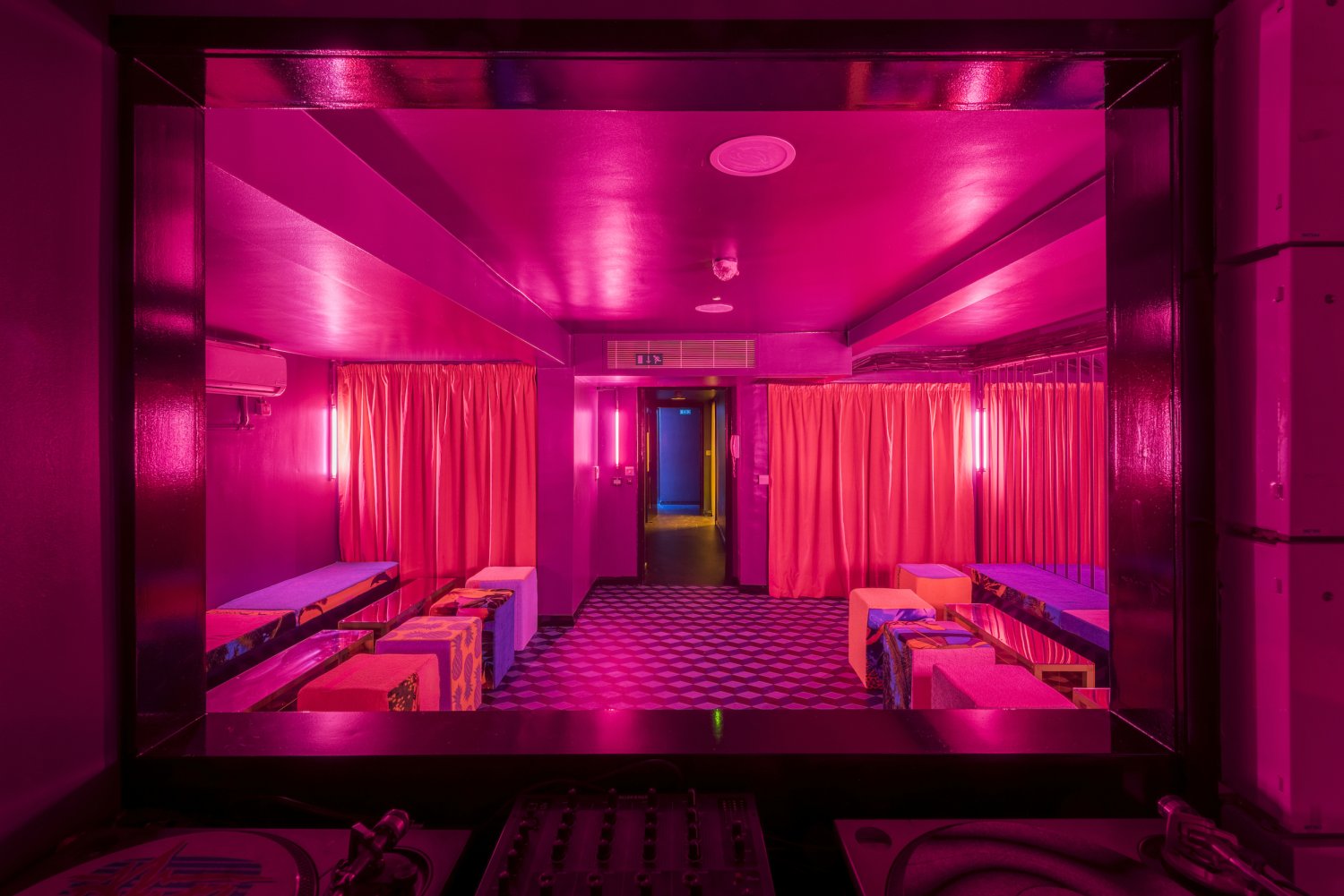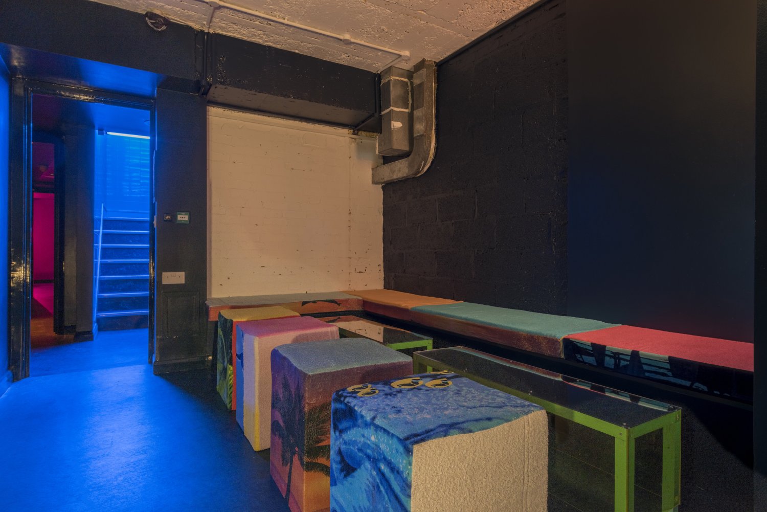 In the basement of the gallery, the London-based artist created a site-specific installation that converted a series of rooms into a nightclub, which will run until the end of the year. The mixed-media work incorporates architectural and furniture design, as well as wall-based embroidery and lighting.