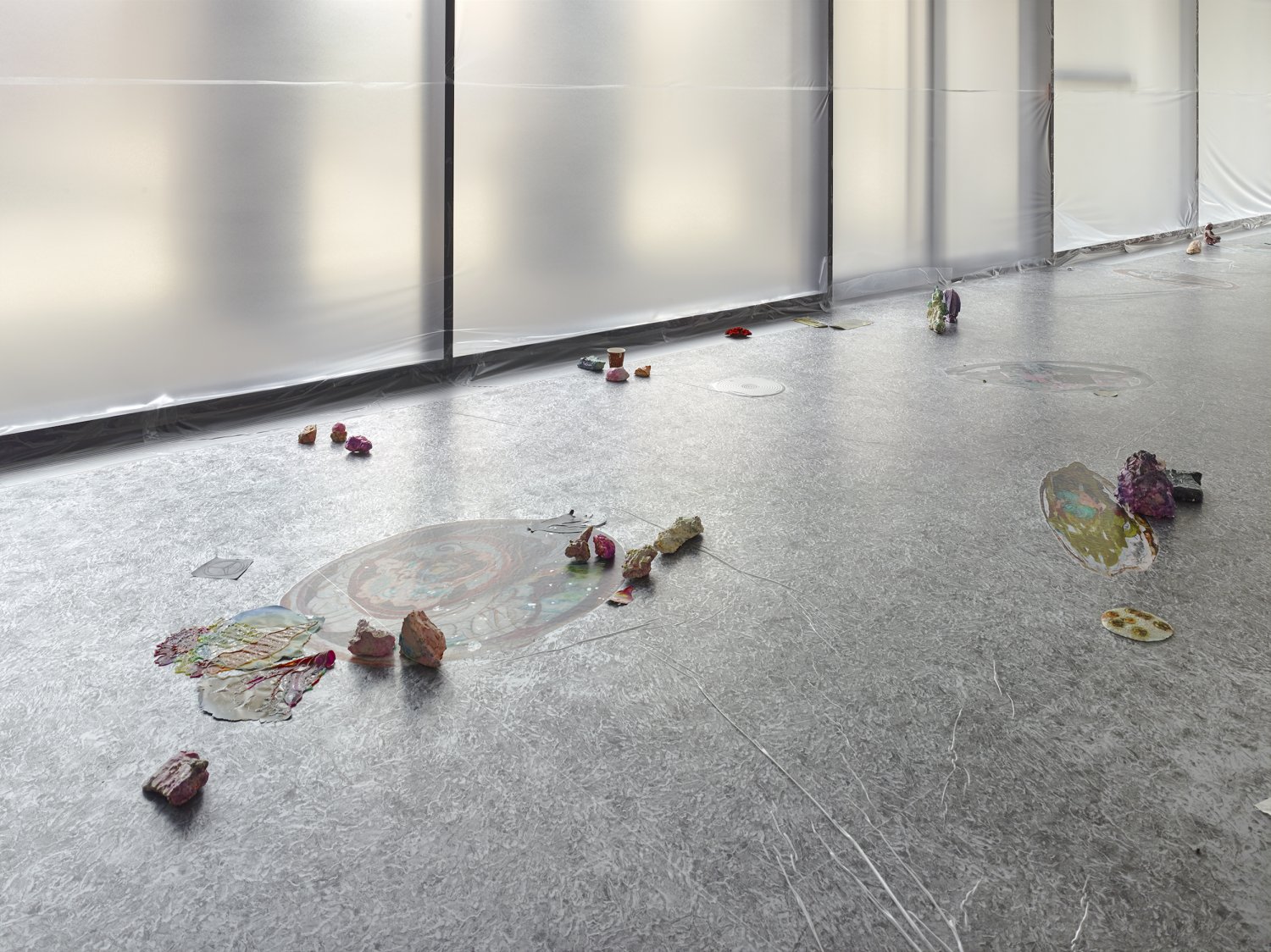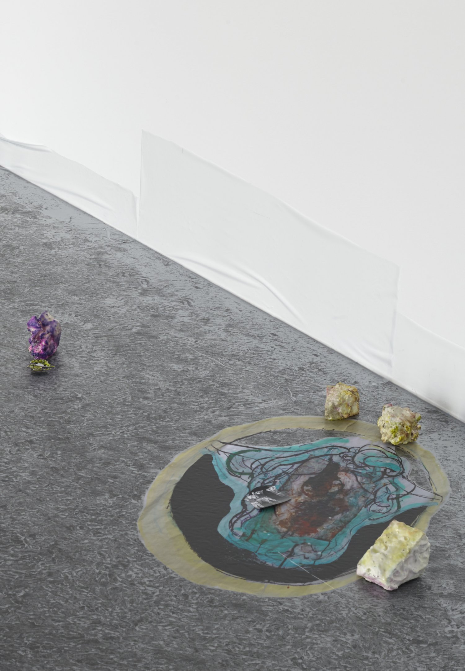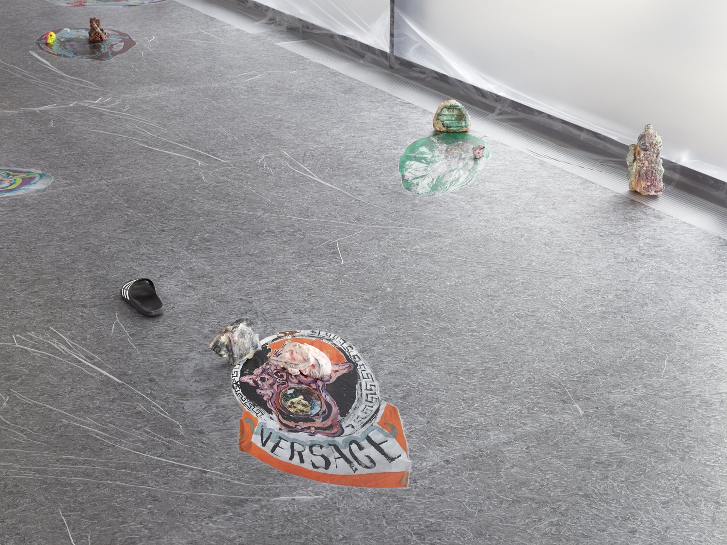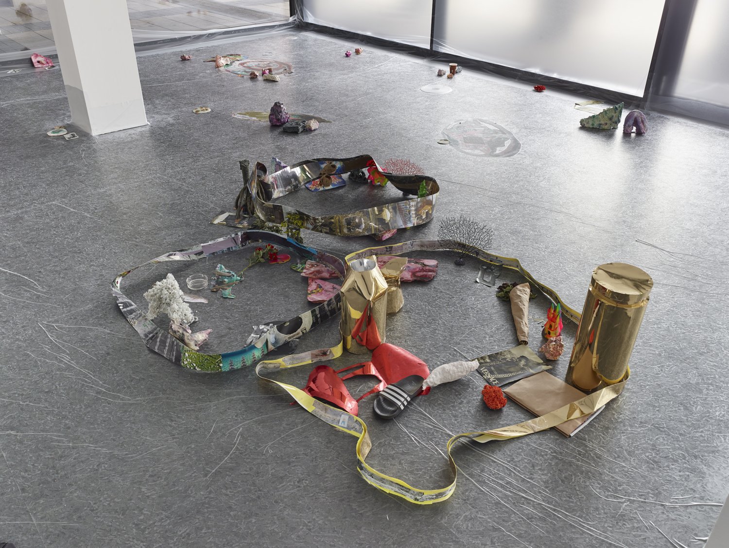 Curated by Oriane Durand, the solo exhibition threads the murder of Versace, police helicopters and the red marble clad lobby of Dortmund’s Unique Hotel in an site-specific installation of drawings, sculpture and performance as video. The arrangement of objects (including plastic, foil, plaster, Jesmonite, acrylic varnish, papier-mâché, found objects and aquarium decoration) are scattered across the gallery floor and elliptical forms float beneath a layer of transparent plastic.