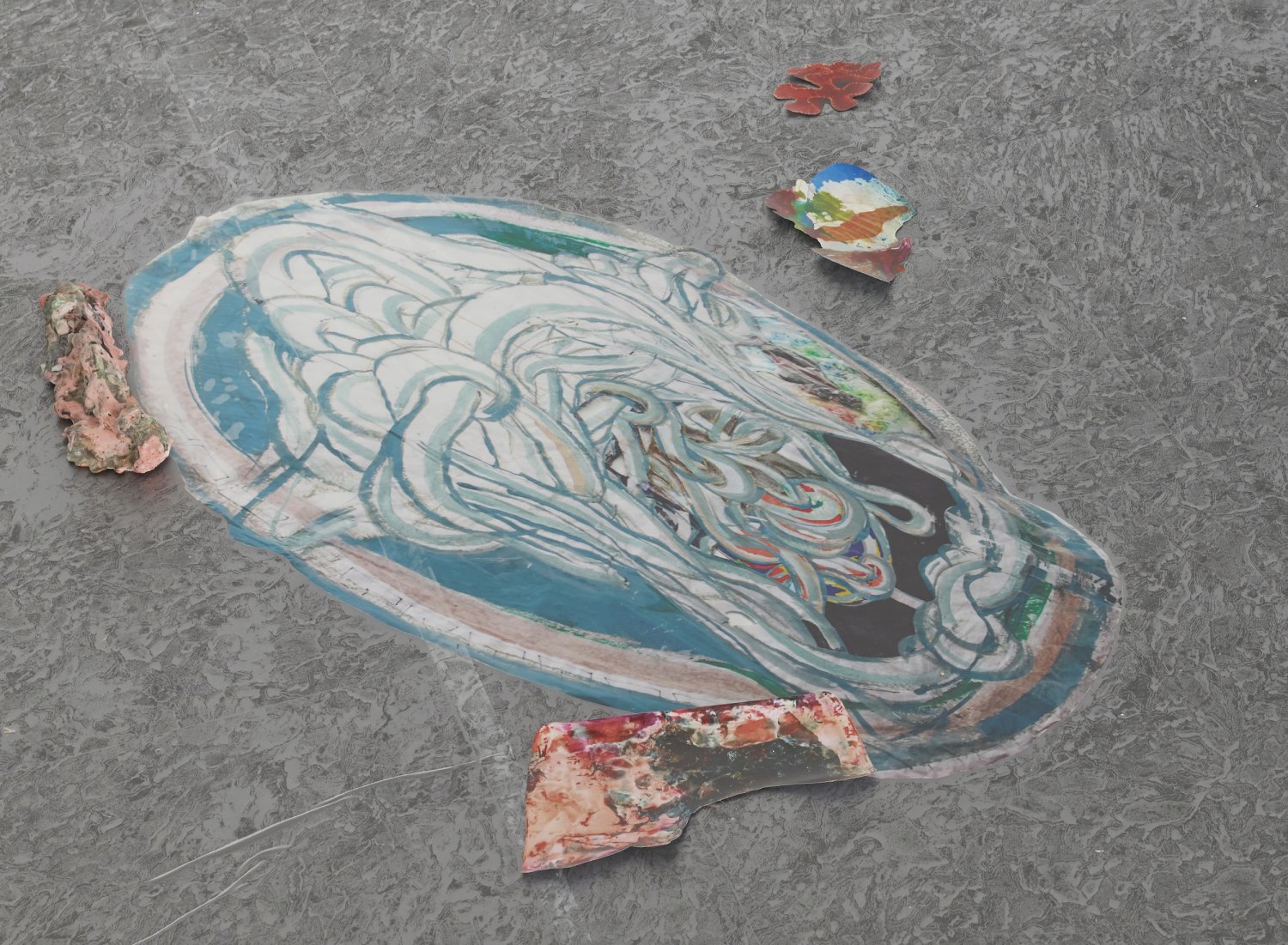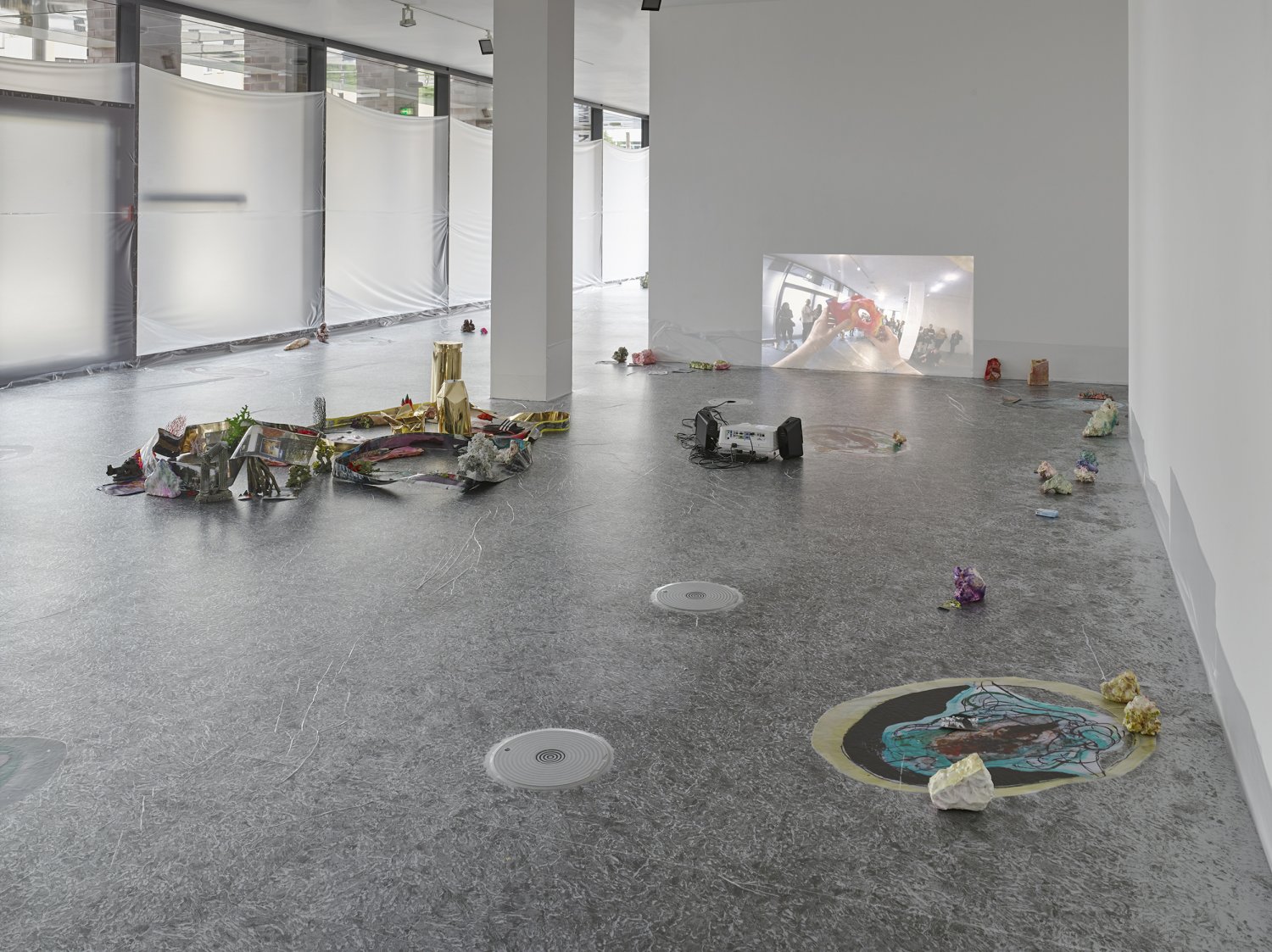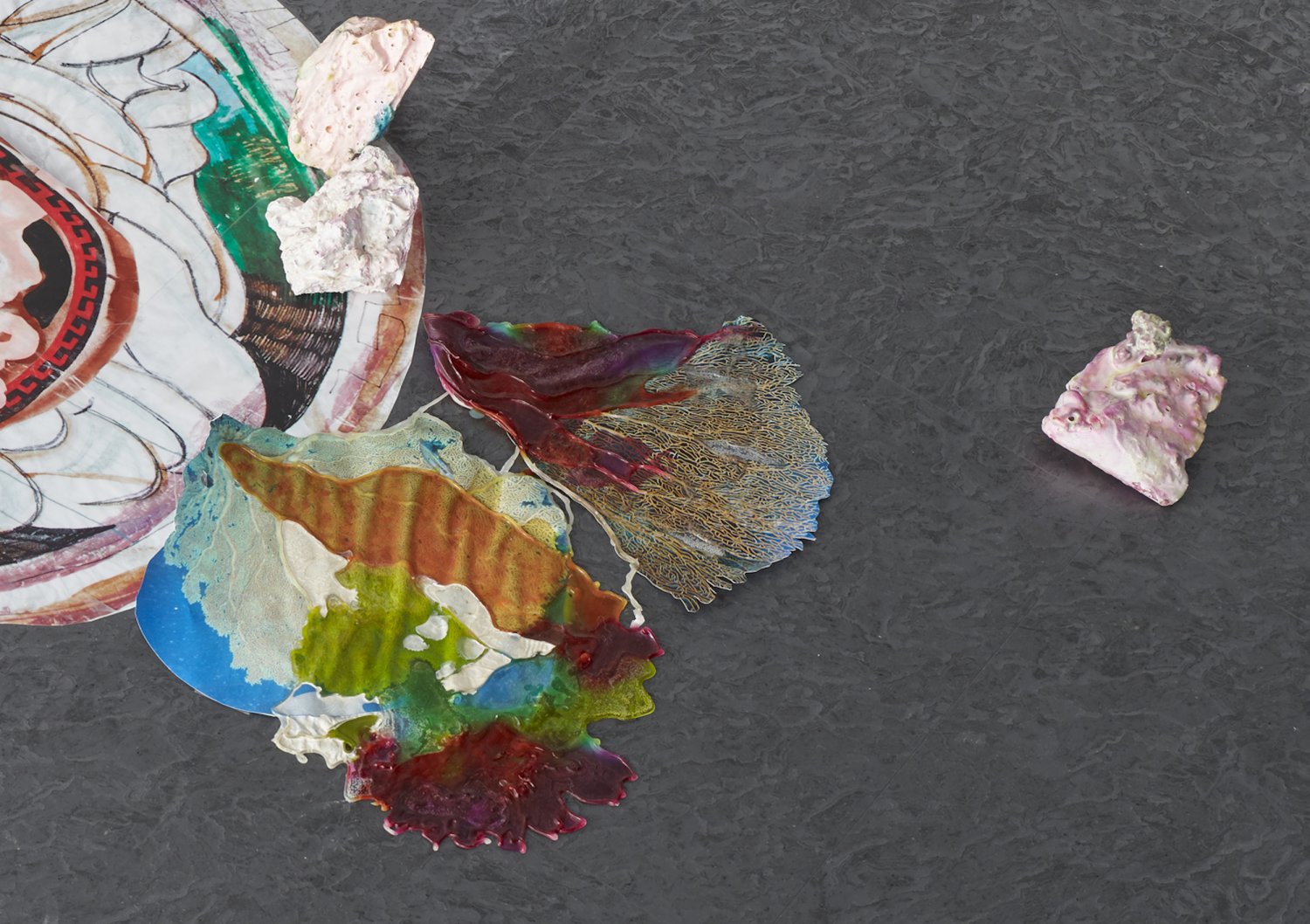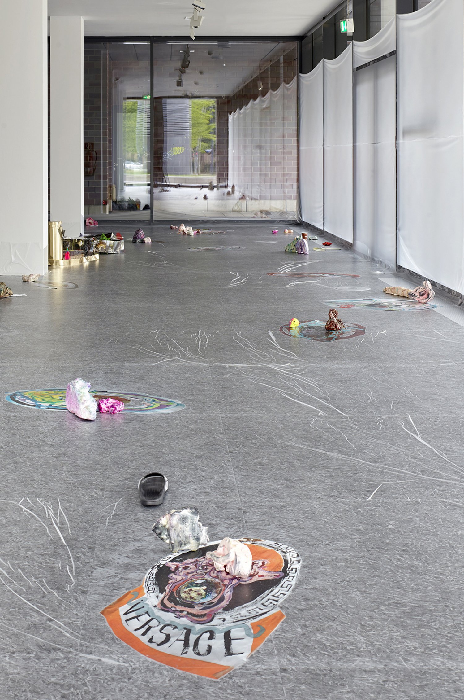 Curated by Oriane Durand, the solo exhibition threads the murder of Versace, police helicopters and the red marble clad lobby of Dortmund’s Unique Hotel in an site-specific installation of drawings, sculpture and performance as video. The arrangement of objects (including plastic, foil, plaster, Jesmonite, acrylic varnish, papier-mâché, found objects and aquarium decoration) are scattered across the gallery floor and elliptical forms float beneath a layer of transparent plastic.