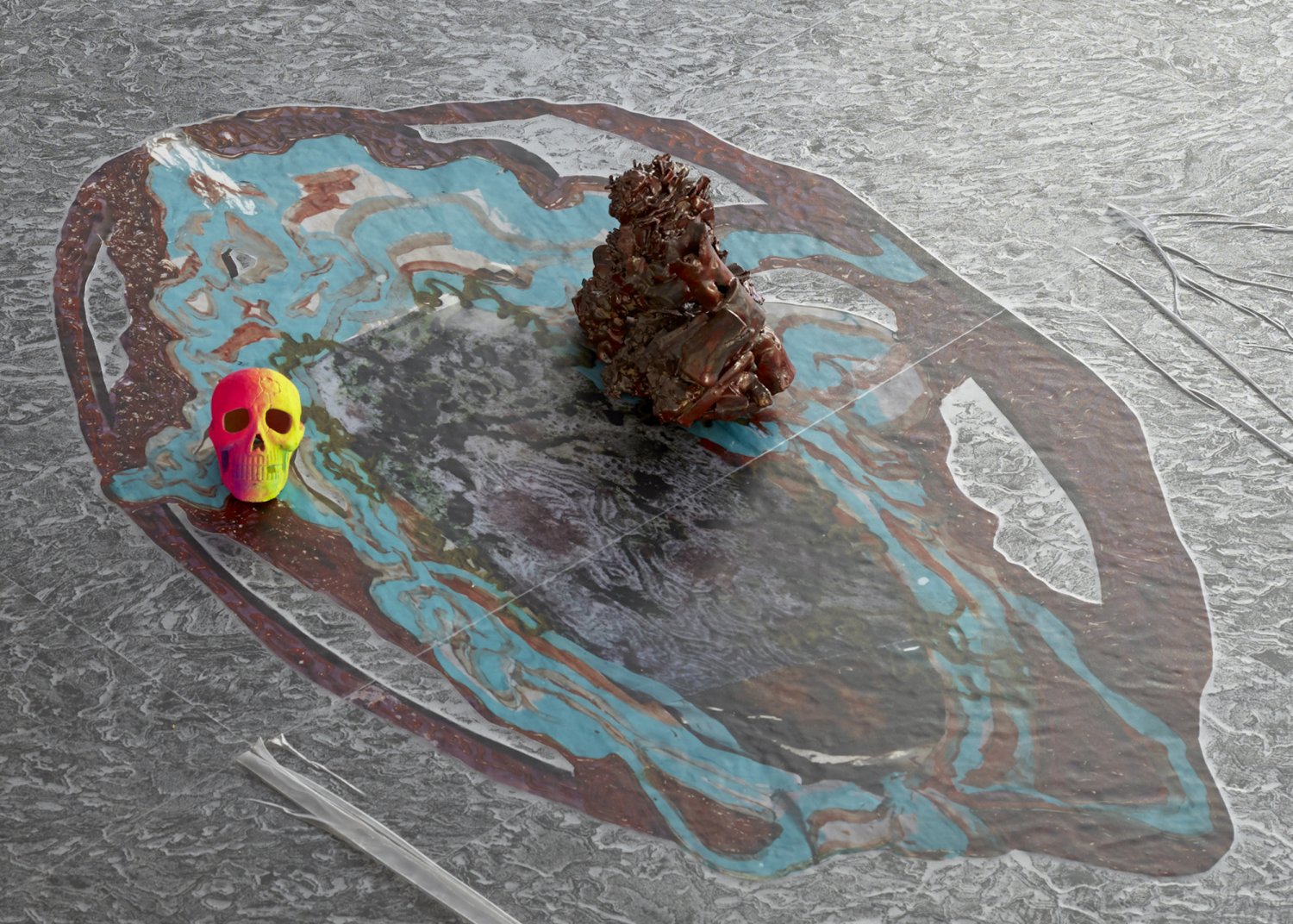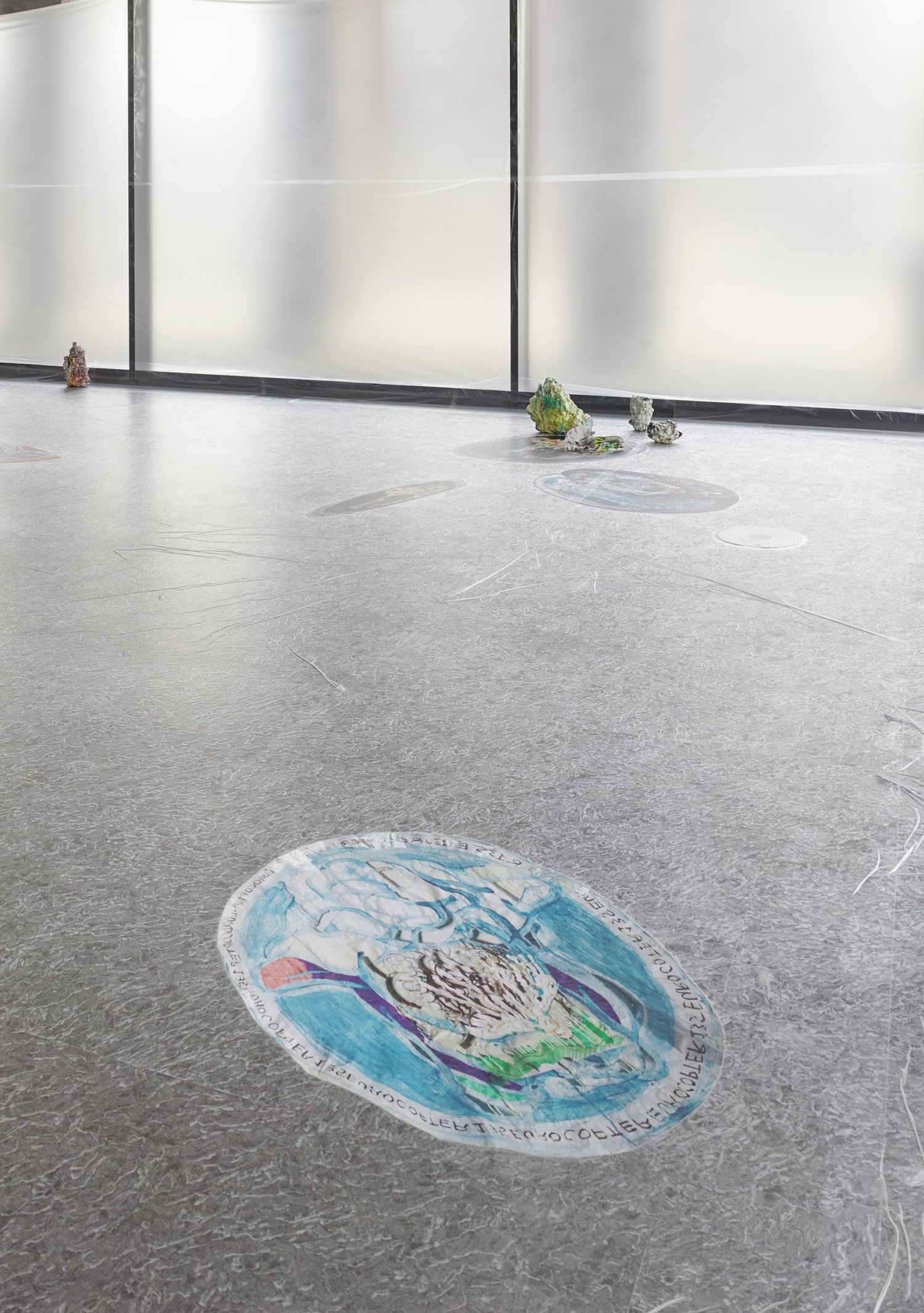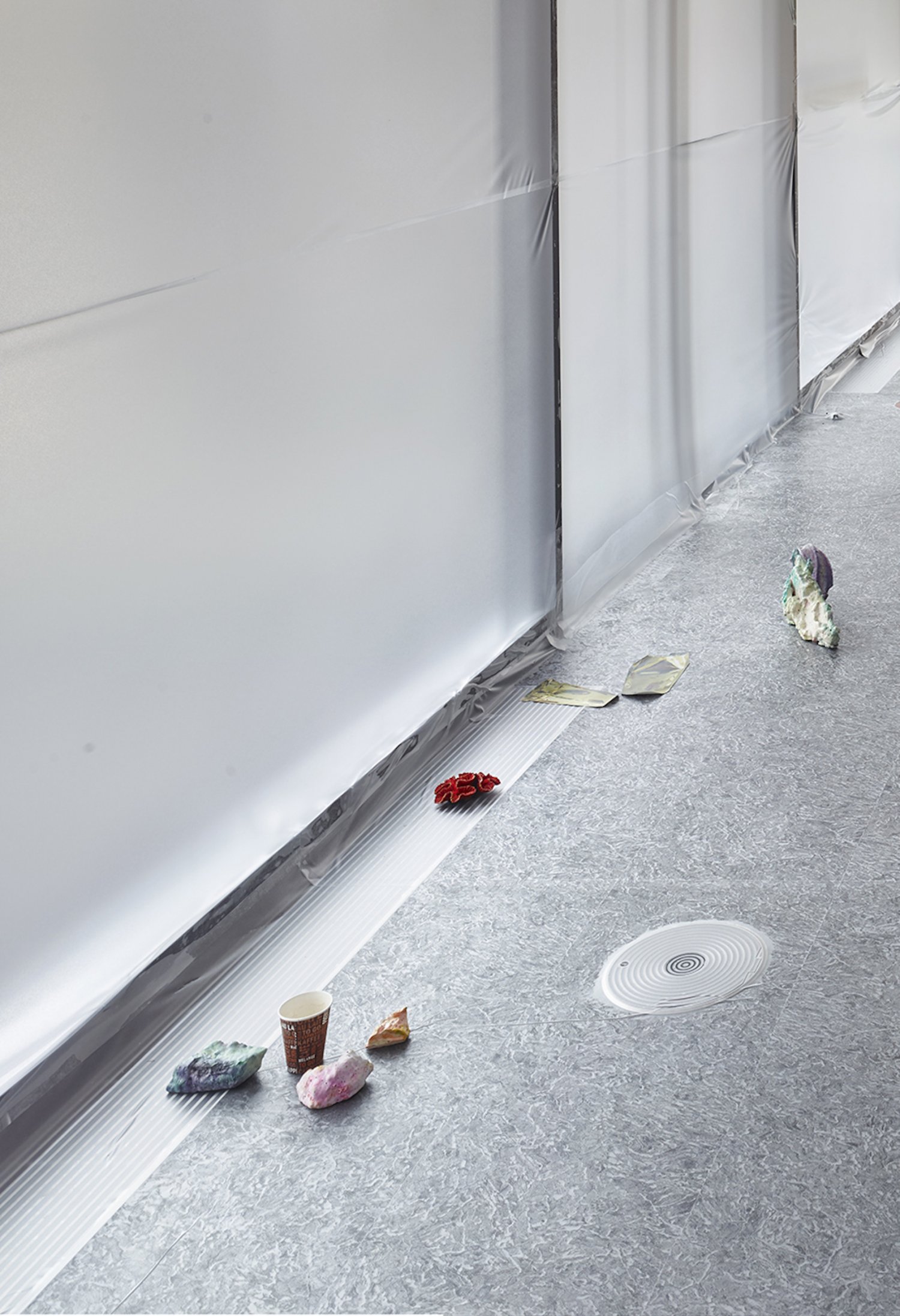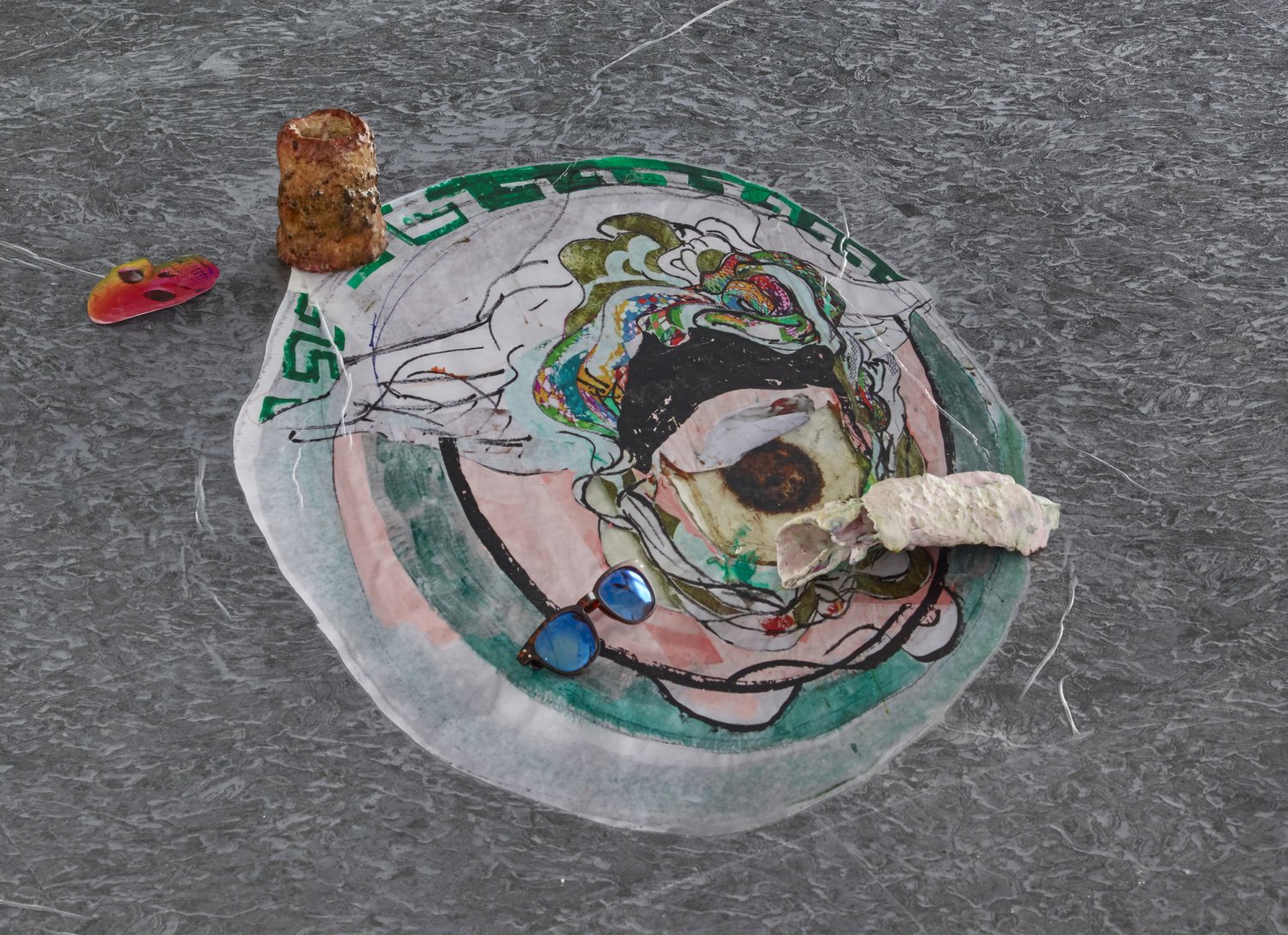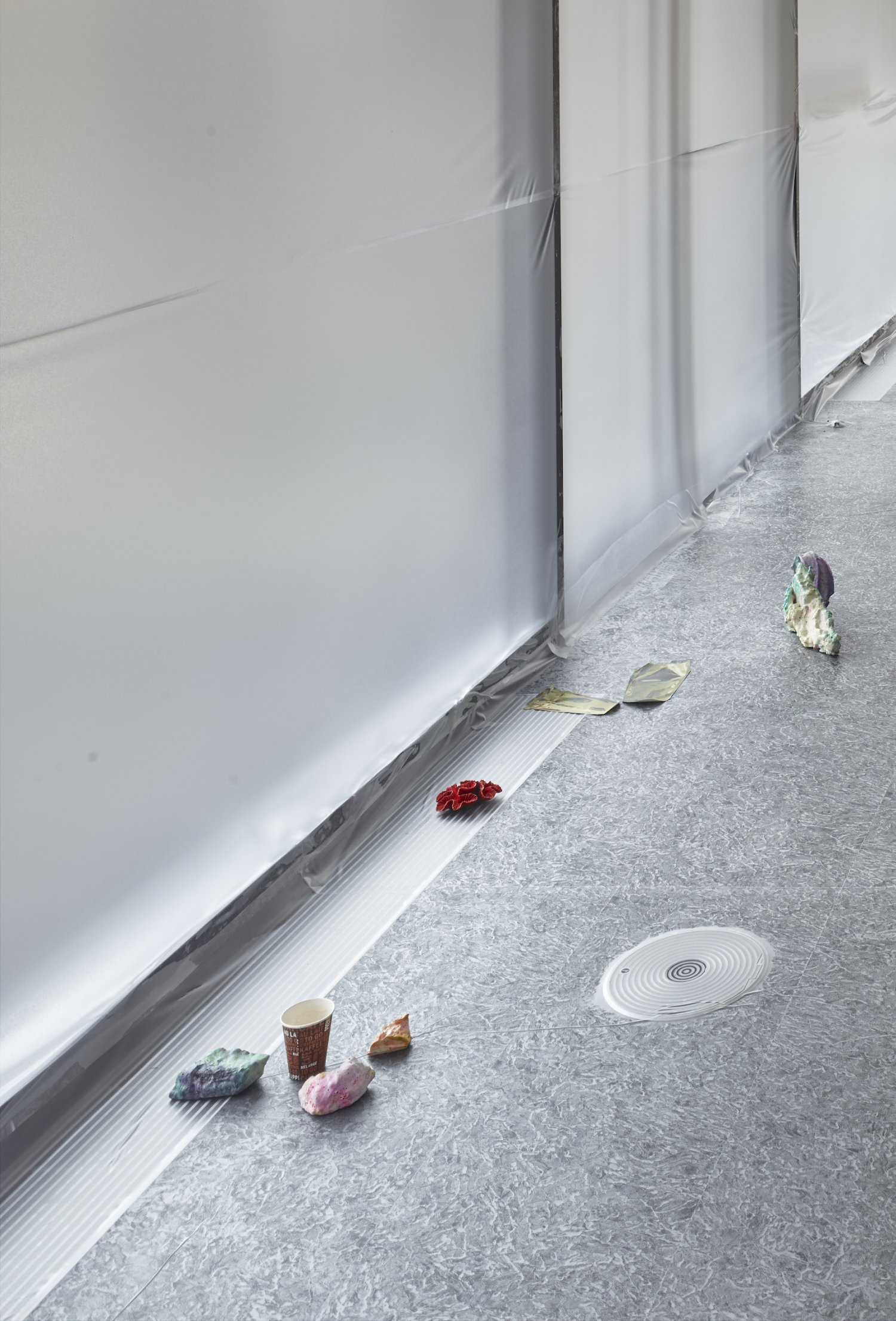 Curated by Oriane Durand, the solo exhibition threads the murder of Versace, police helicopters and the red marble clad lobby of Dortmund’s Unique Hotel in an site-specific installation of drawings, sculpture and performance as video. The arrangement of objects (including plastic, foil, plaster, Jesmonite, acrylic varnish, papier-mâché, found objects and aquarium decoration) are scattered across the gallery floor and elliptical forms float beneath a layer of transparent plastic.
