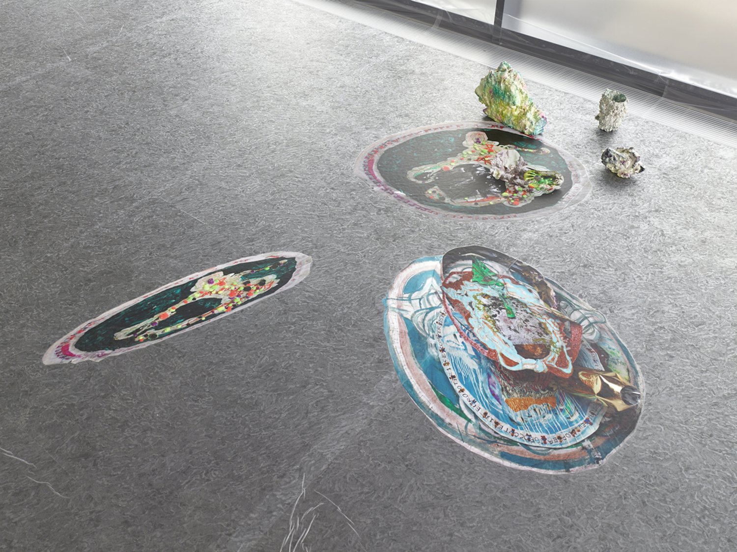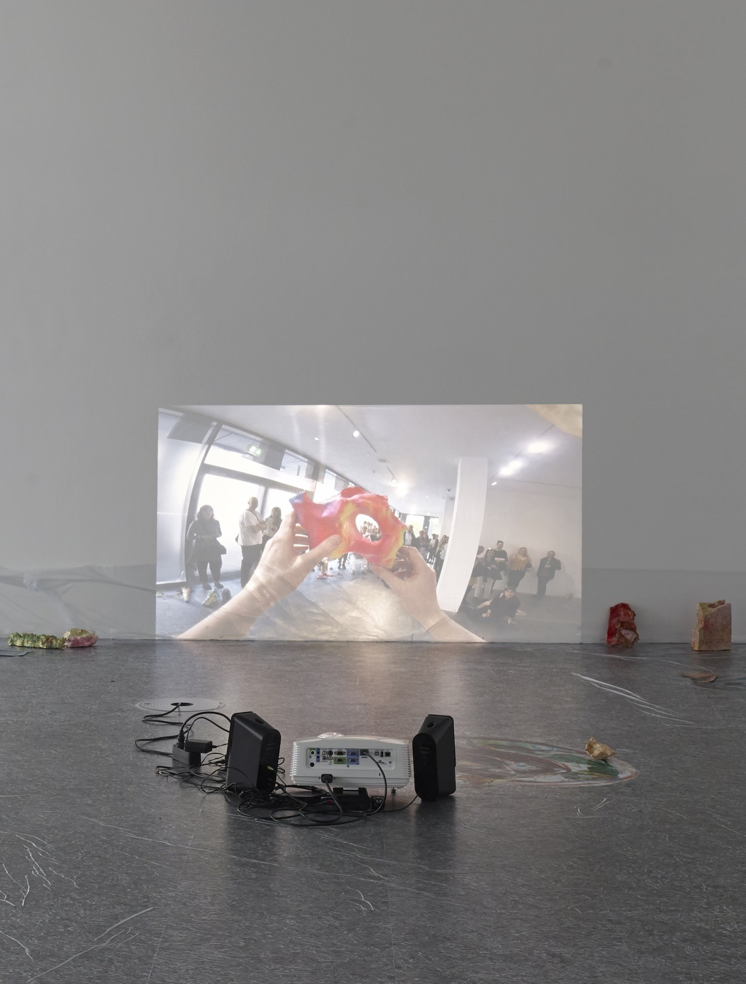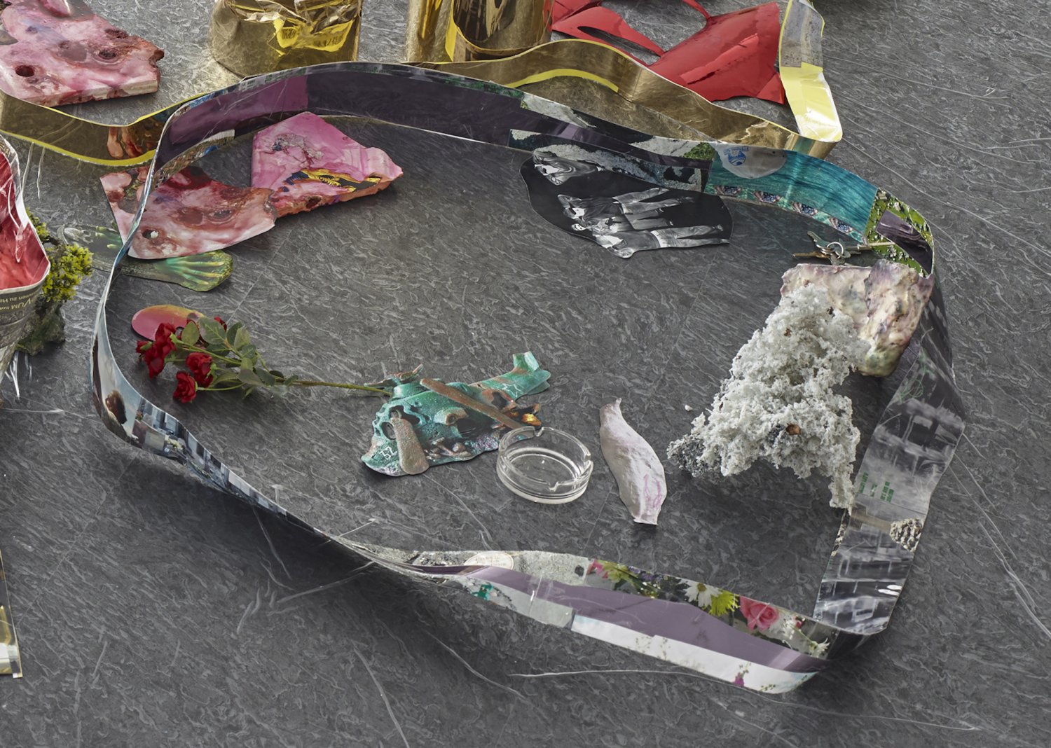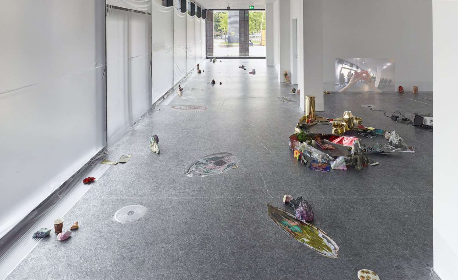Curated by Oriane Durand, the solo exhibition threads the murder of Versace, police helicopters and the red marble clad lobby of Dortmund’s Unique Hotel in an site-specific installation of drawings, sculpture and performance as video. The arrangement of objects (including plastic, foil, plaster, Jesmonite, acrylic varnish, papier-mâché, found objects and aquarium decoration) are scattered across the gallery floor and elliptical forms float beneath a layer of transparent plastic.