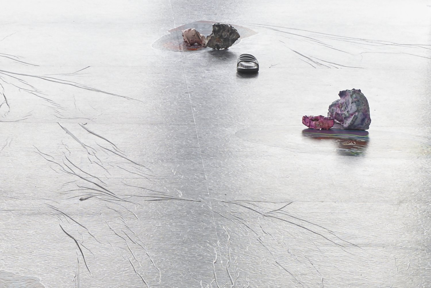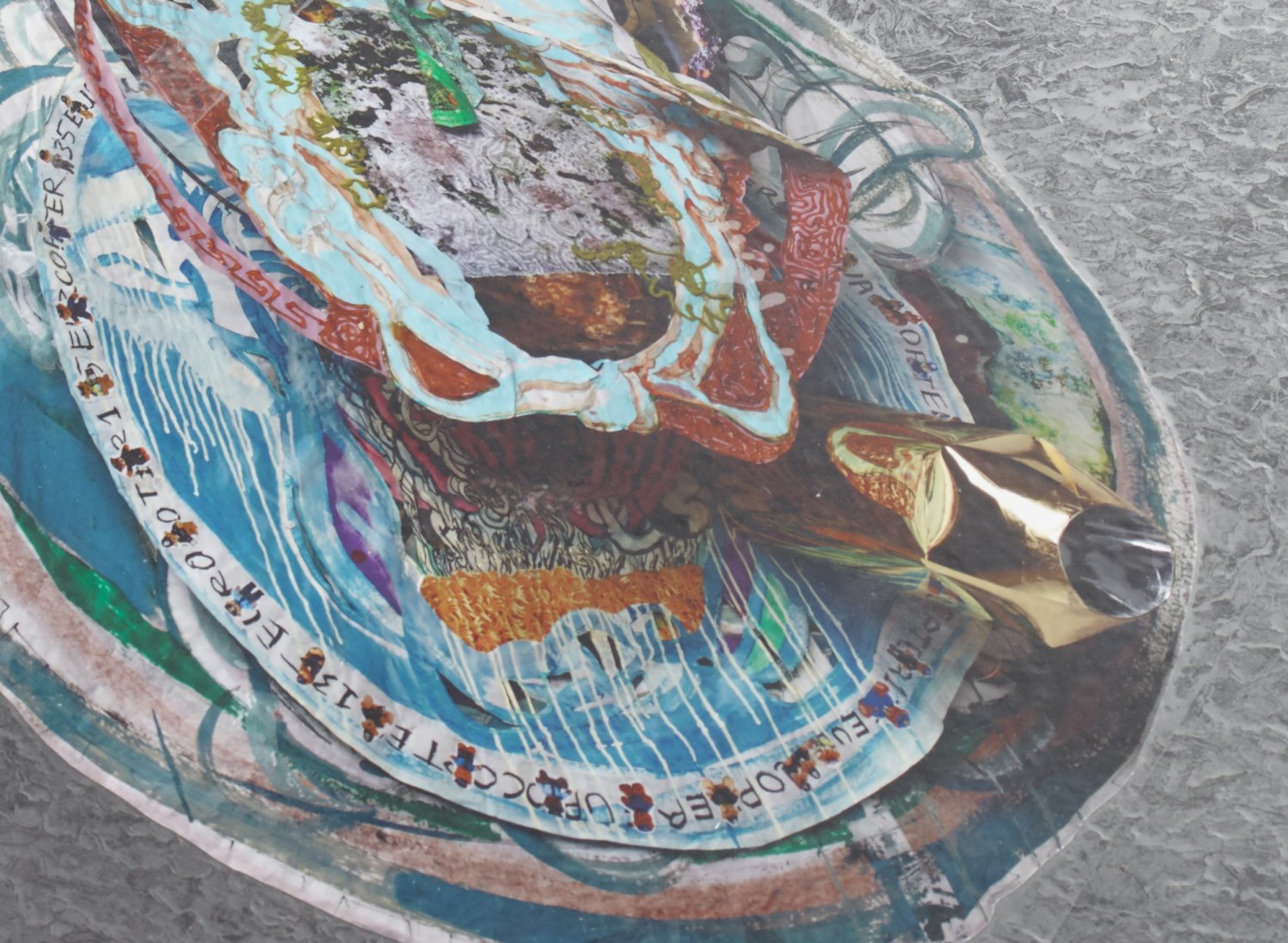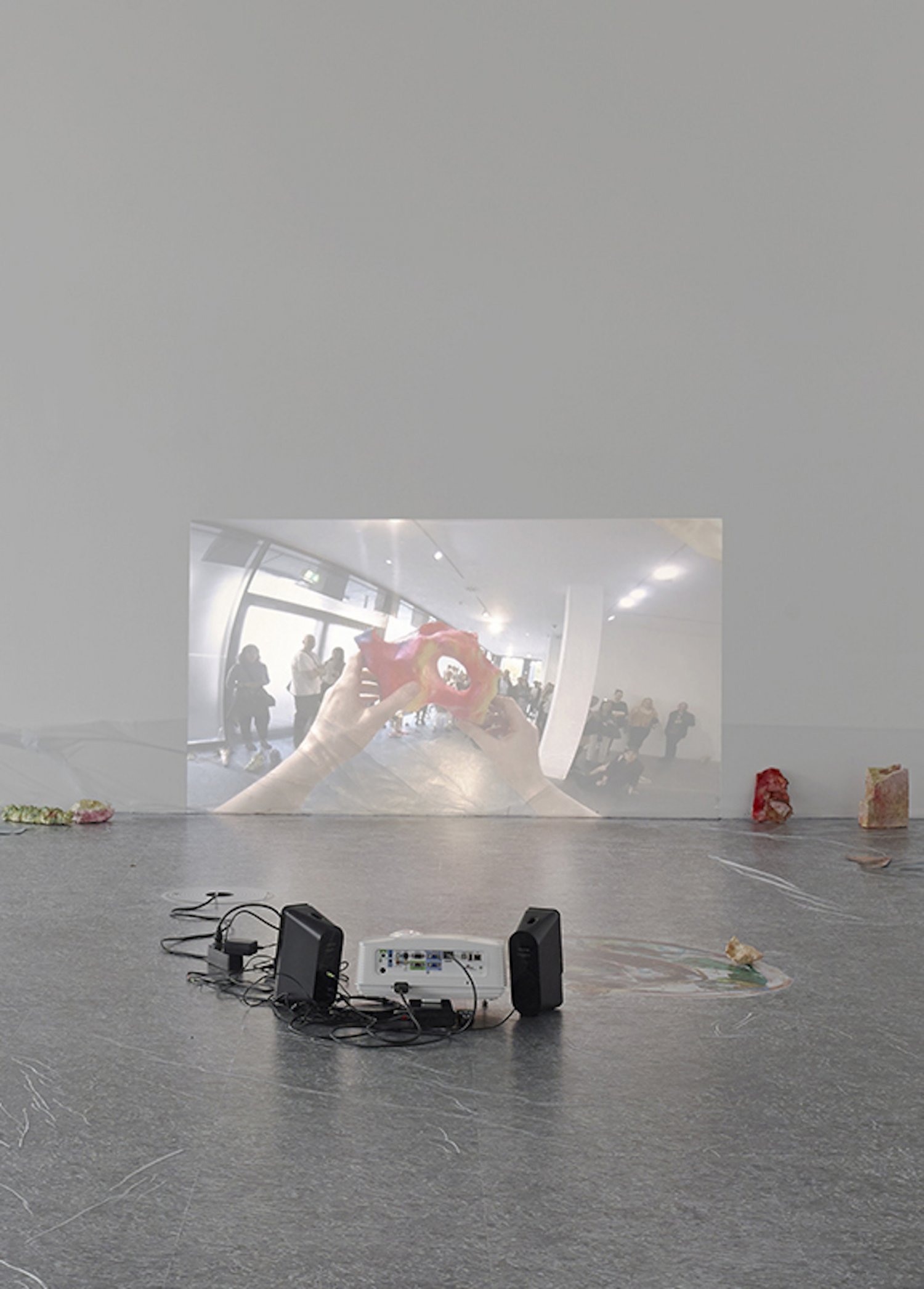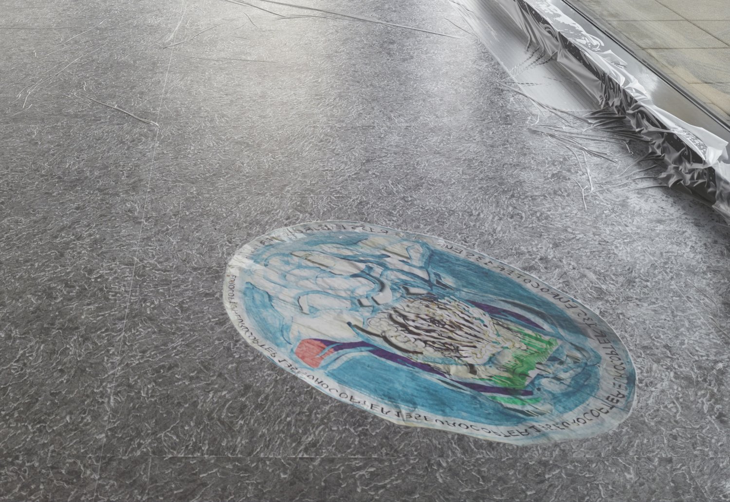 Curated by Oriane Durand, the solo exhibition threads the murder of Versace, police helicopters and the red marble clad lobby of Dortmund’s Unique Hotel in an site-specific installation of drawings, sculpture and performance as video. The arrangement of objects (including plastic, foil, plaster, Jesmonite, acrylic varnish, papier-mâché, found objects and aquarium decoration) are scattered across the gallery floor and elliptical forms float beneath a layer of transparent plastic.