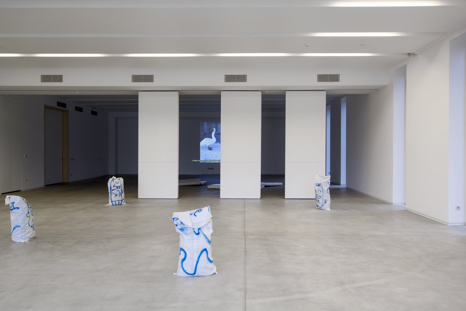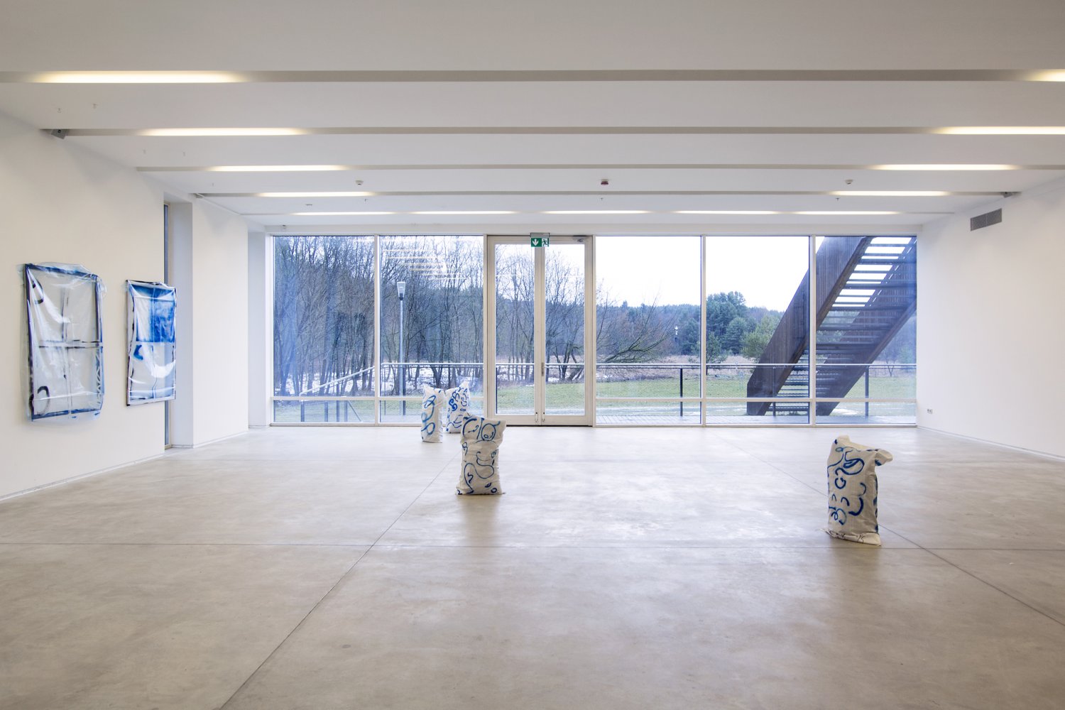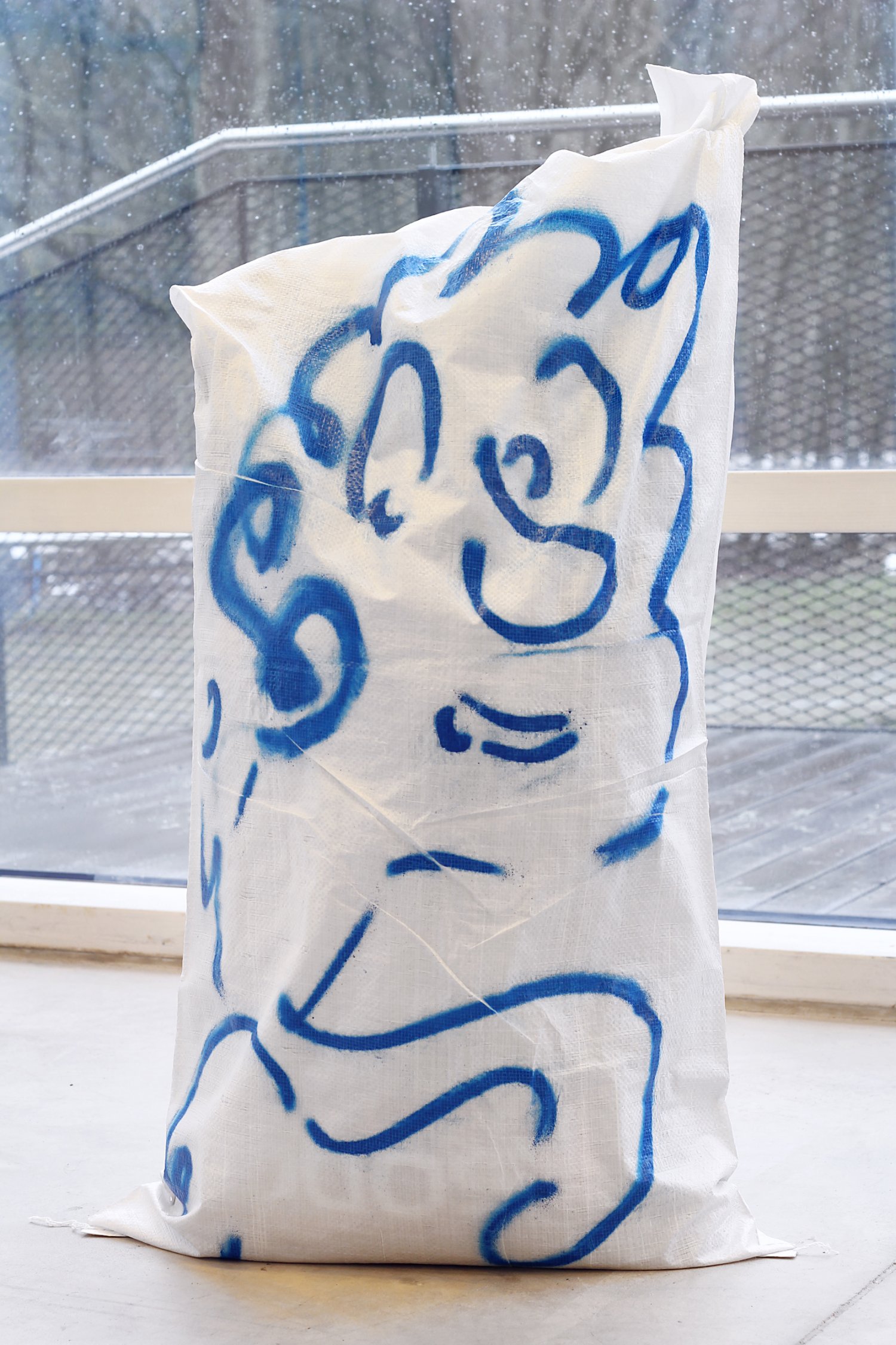 Borrowed pieces of foam from the stripped-down couches of Rupert’s building are wrapped in transparent sprayed polythene and gathered in one spot, like large slices of wall. Some polypropylene bags are scattered across the room, like upright oversized pillowcases with faces scrawled across them. Blueish pieces of tarp hang loosely on frames. A couple of pendants hang on suctions cups, reminiscent of adolescent lucky charms. A flatscreen TV hangs above a dining table, with a short looped video of an artist kicking one of his own works then falling to the ground in a tragicomic manner, and three paintings on paper are wrapped in plastic blown up disfigured earphones.**