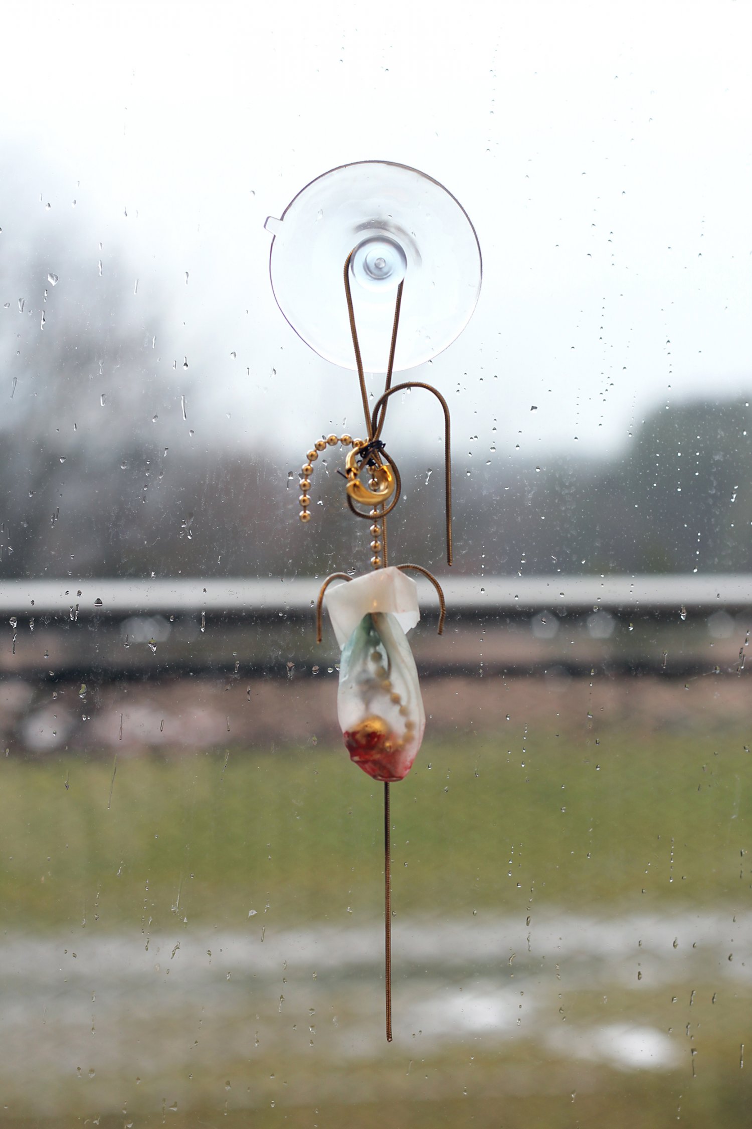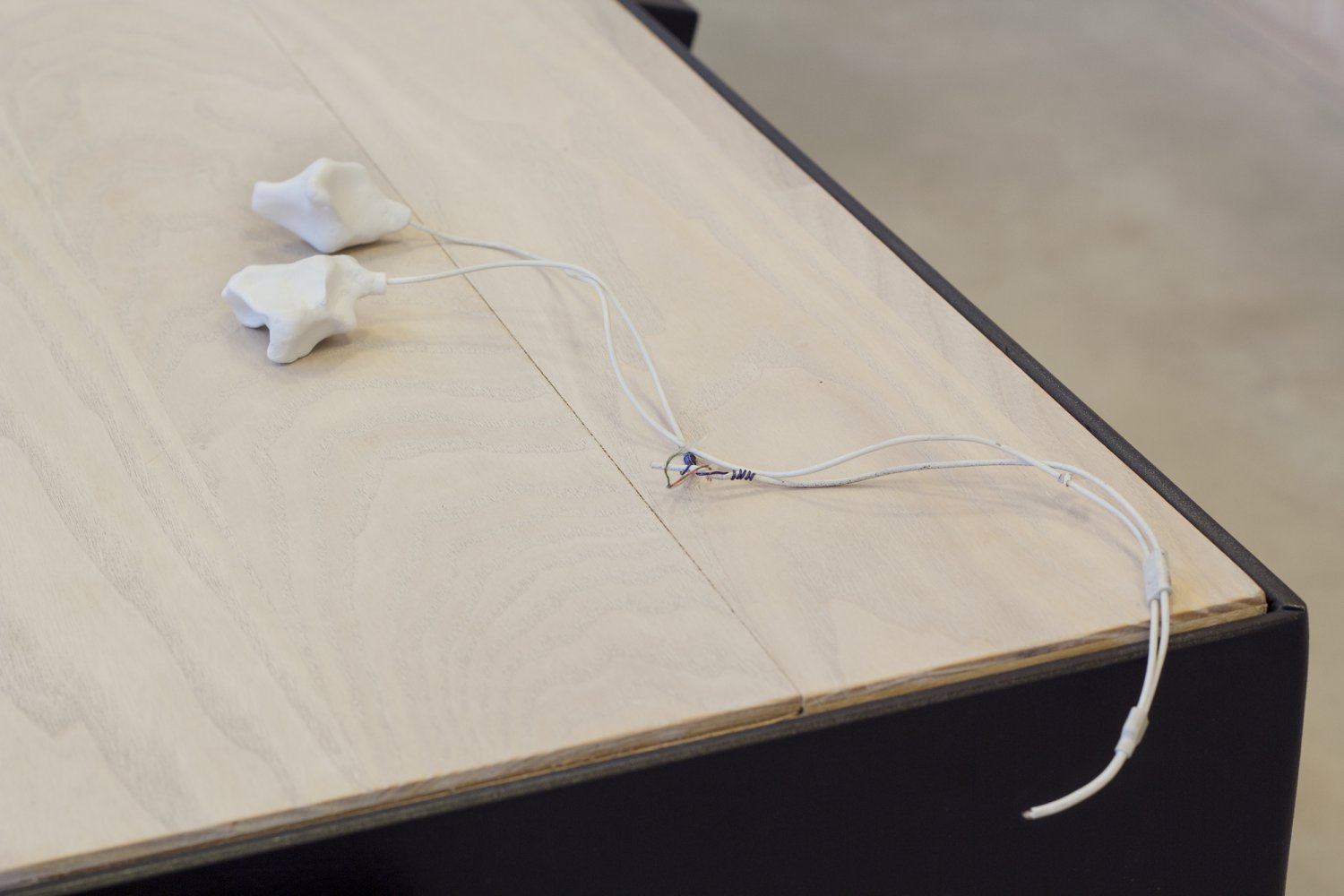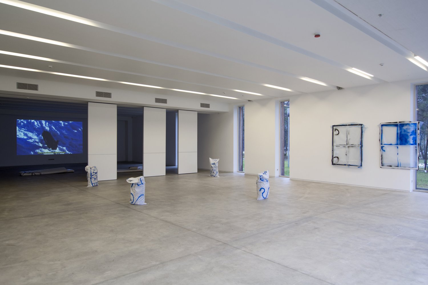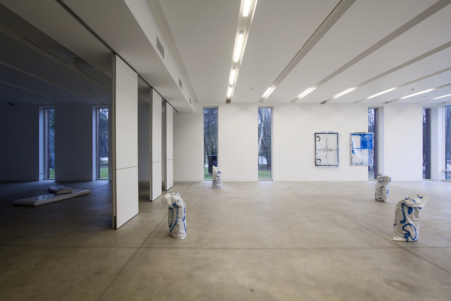 Borrowed pieces of foam from the stripped-down couches of Rupert’s building are wrapped in transparent sprayed polythene and gathered in one spot, like large slices of wall. Some polypropylene bags are scattered across the room, like upright oversized pillowcases with faces scrawled across them. Blueish pieces of tarp hang loosely on frames. A couple of pendants hang on suctions cups, reminiscent of adolescent lucky charms. A flatscreen TV hangs above a dining table, with a short looped video of an artist kicking one of his own works then falling to the ground in a tragicomic manner, and three paintings on paper are wrapped in plastic blown up disfigured earphones.**