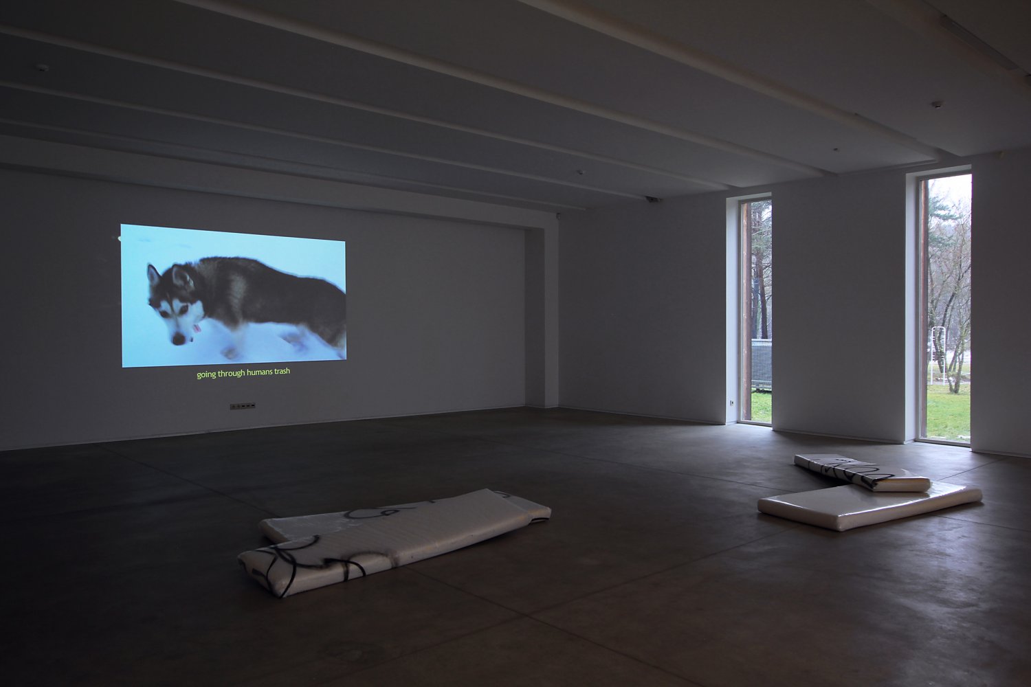 The show presents new works made during Donzeaud’s Rupert residency and develops a narrative intertwining physical locations and fictional characters, both human and animal, virtual and IRL. A video shot on site is told through subtitles to an instrumental hip-hop soundtrack featuring local spots: a restaurant, a frozen river, snow-capped landscapes, houses under construction and abandoned buildings. The story is dehumanized and punctuated by the presence of animals — dogs, ducks, swans.