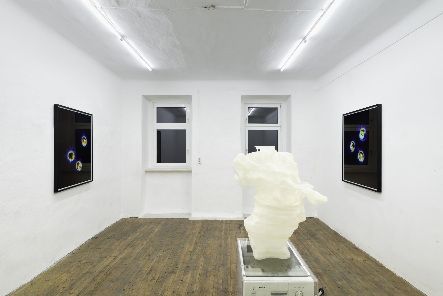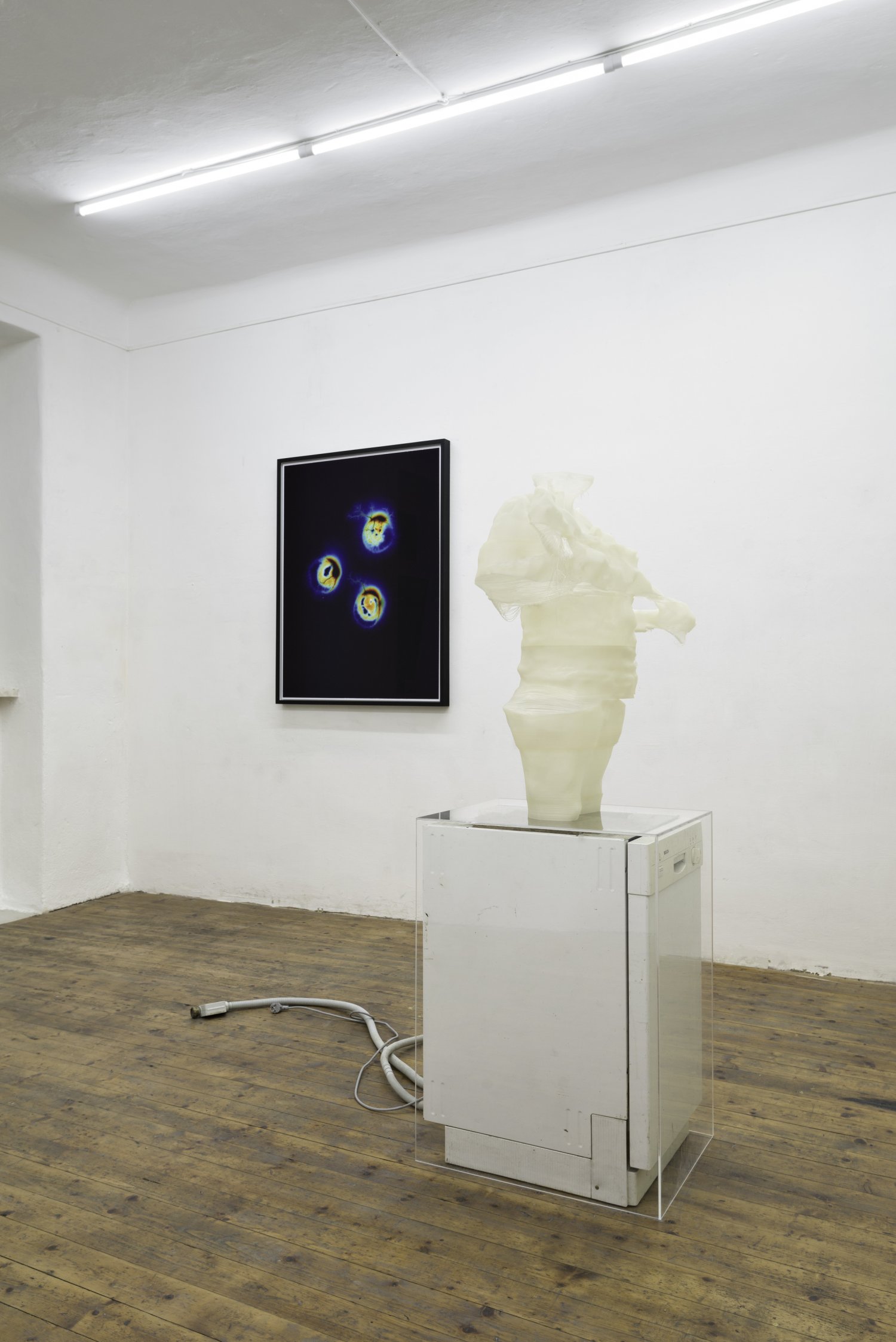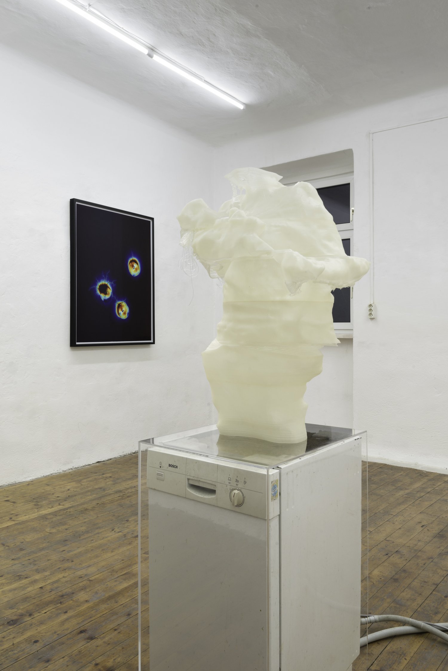 The installation included a range of wall paint, sculpture, video and photography; an assortment of materials from snake venom paint, oyster mushrooms in shipping boxes to 3D printed polythene sculpture on washing machine and a Kirlian polaroid. Staging fabrications within conceptions of contemporary and ancient mysticism, the works brought together challenge the humanist experience and explore thresholds of self and other.
