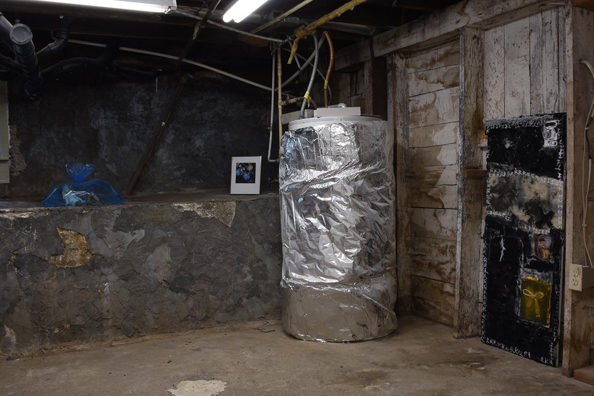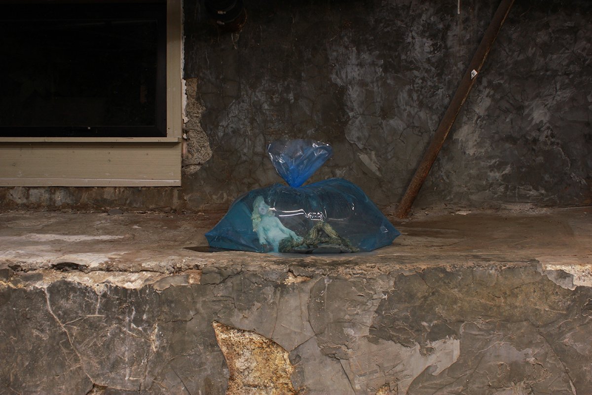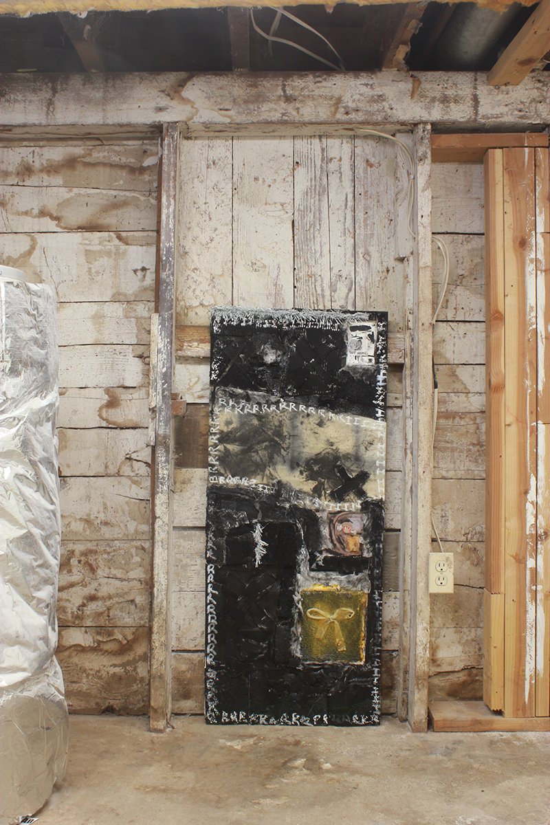 With a range of materials from found objects, ceramics, textiles, and epoxy resin to mixed media drawing, Country Bumpkin exploits the rawness of the unfinished basement as a meditation on liminality. Works in the space coalesce around the ever evolving landscape of crumbling cement and darkness.”**