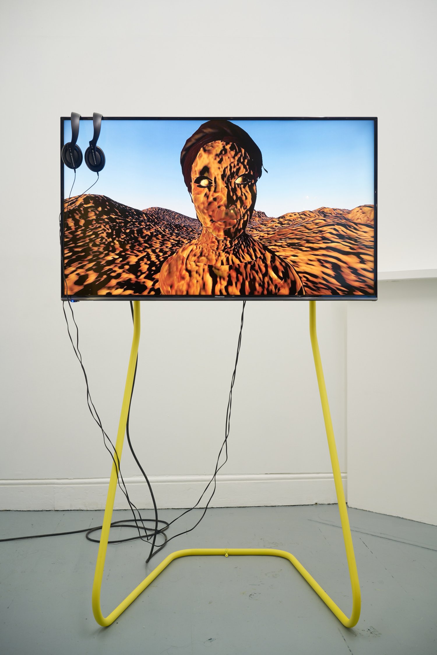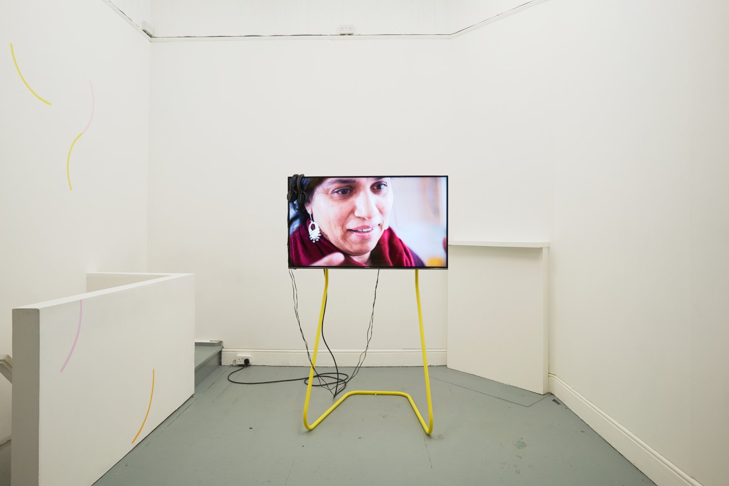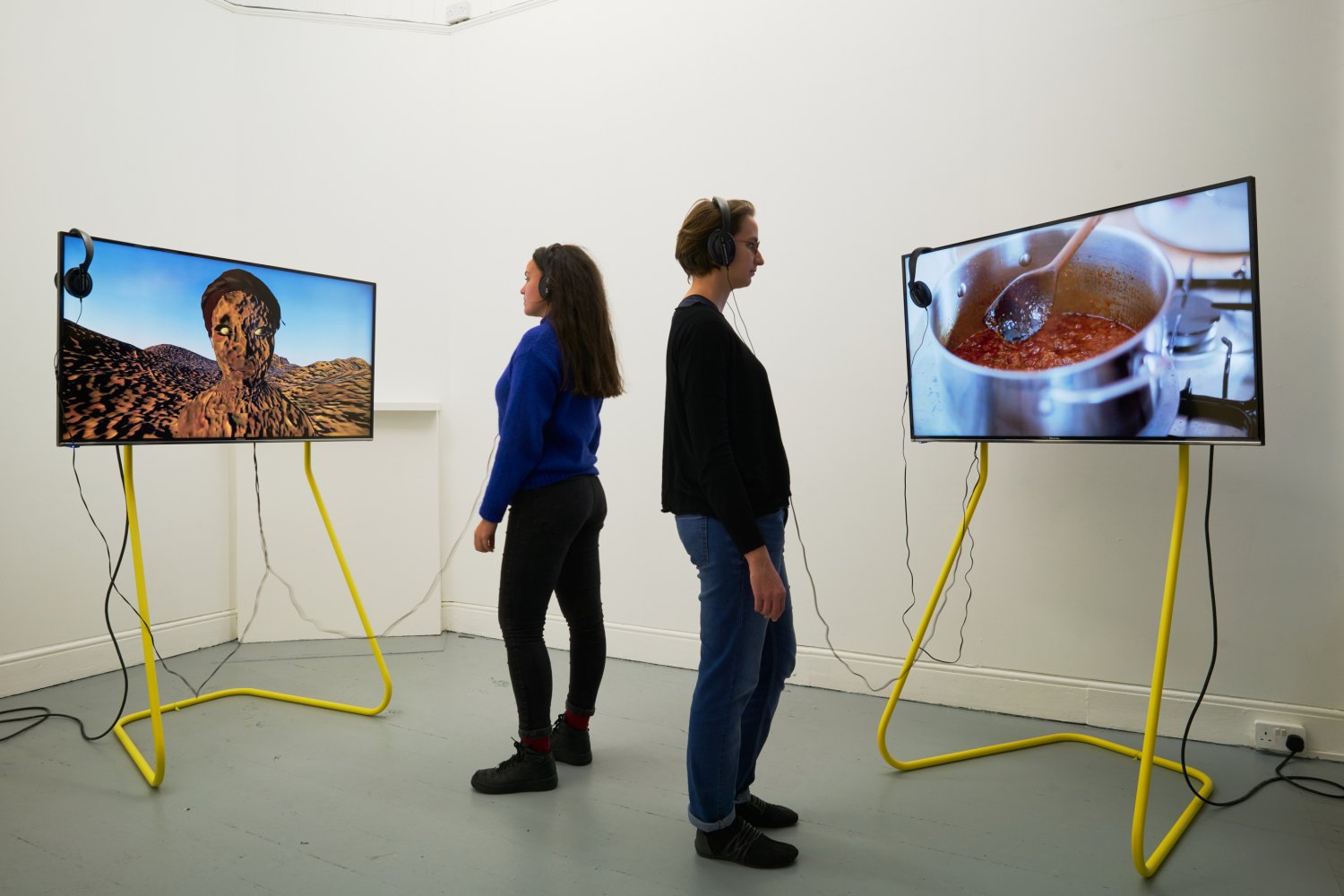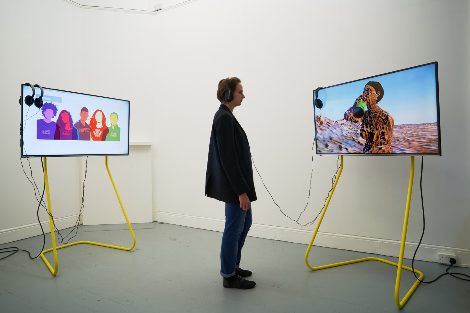 Using both monitors and projections, the installation is an accumulation of “several narrative threads drawing together intimate conversations between the artist and her two sisters, ominous animated visions of a metamorphosing body, e-learning training on Prevent, and staged, performed gestures.”
