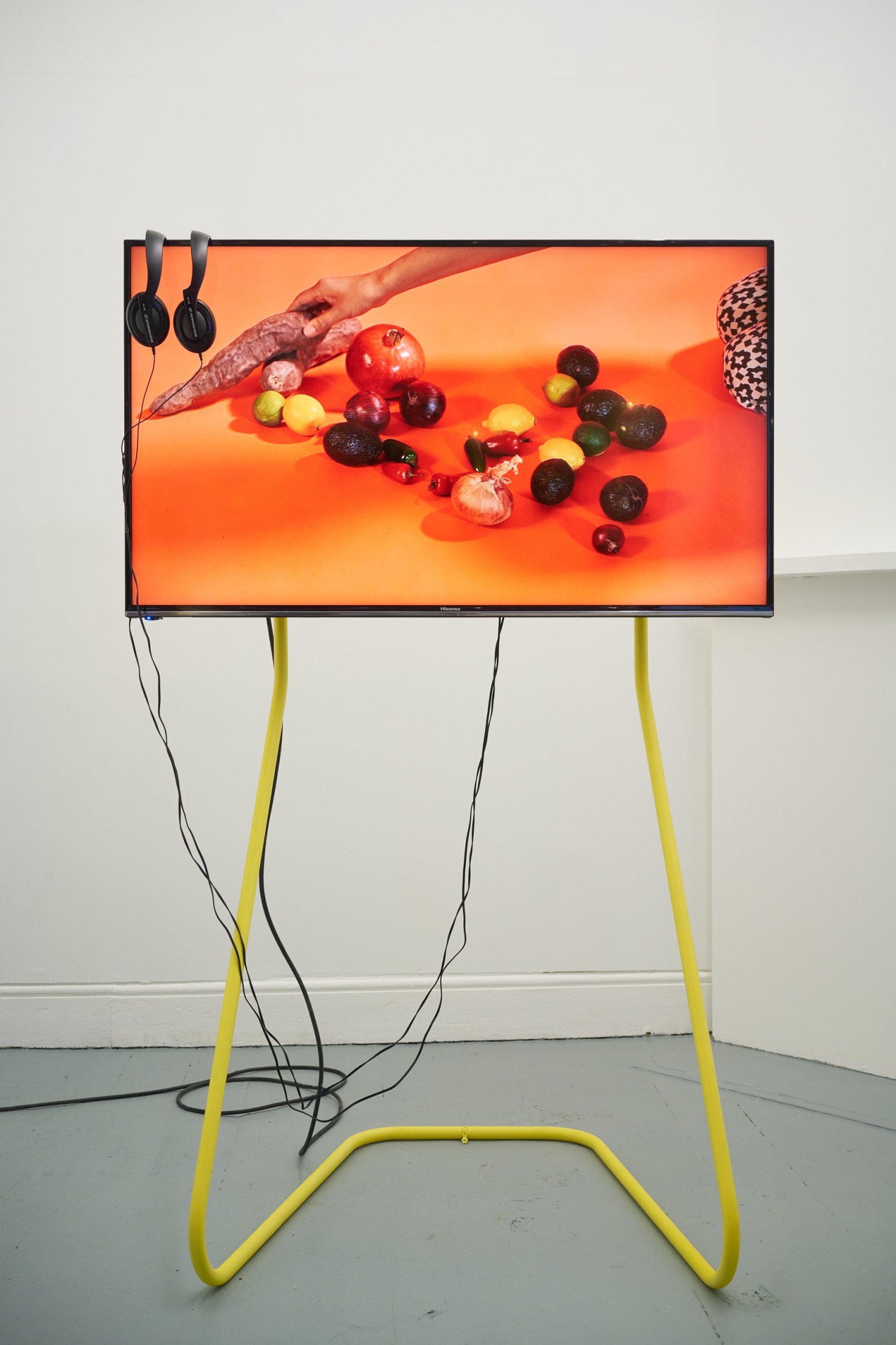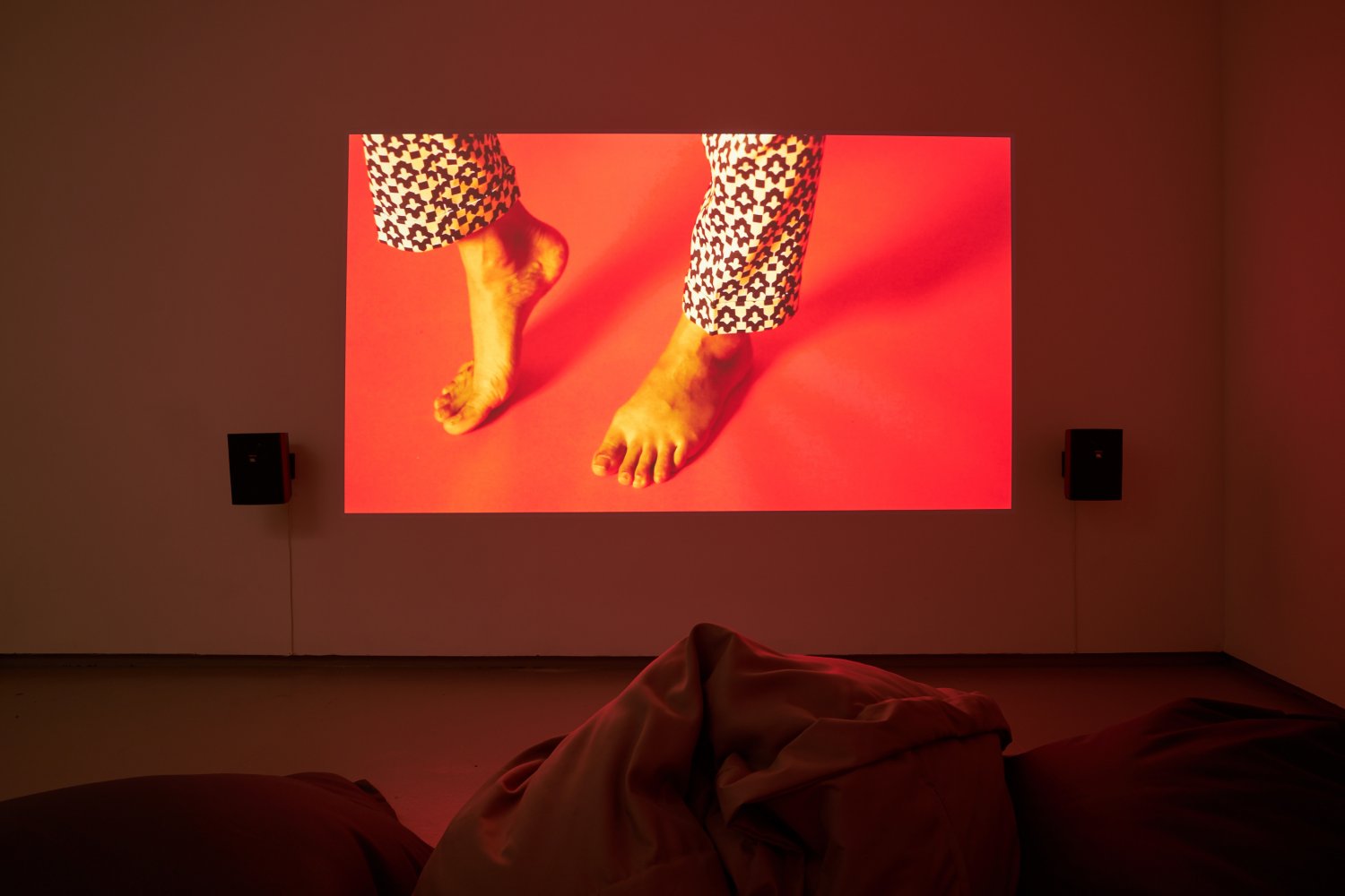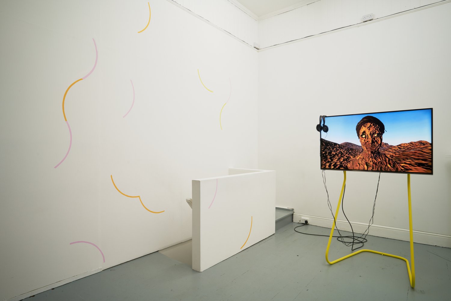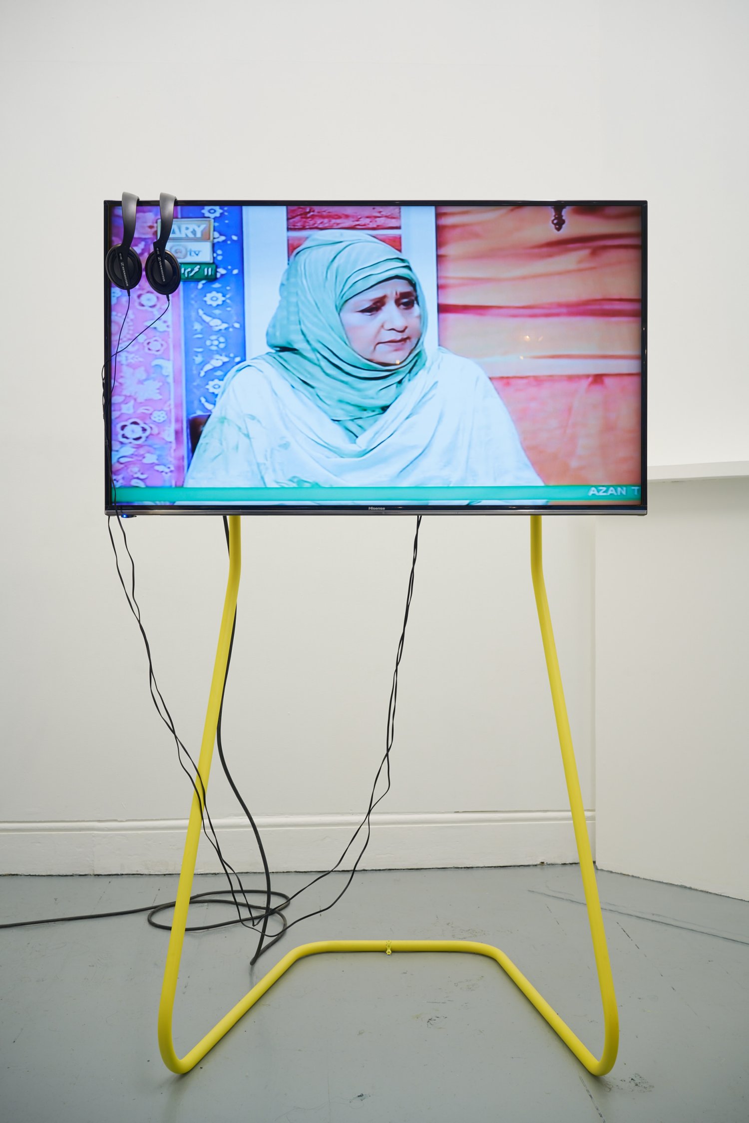 Using both monitors and projections, the installation is an accumulation of “several narrative threads drawing together intimate conversations between the artist and her two sisters, ominous animated visions of a metamorphosing body, e-learning training on Prevent, and staged, performed gestures.”