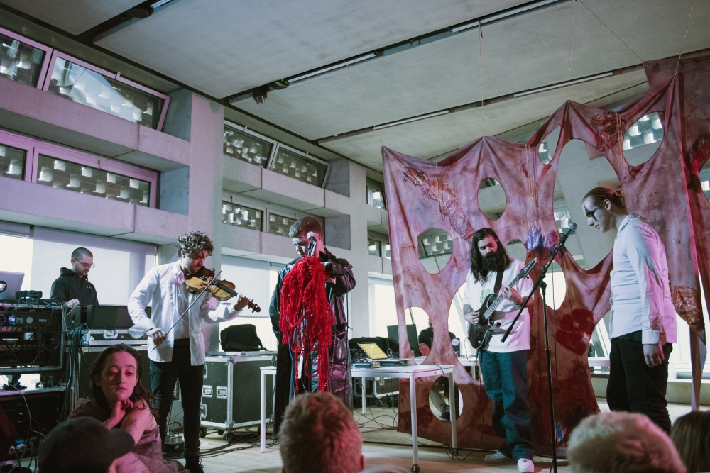 After some confusion from Tate staff on the venue’s capacity before opening the floor to audience members wishing to attend the evening performance, Leandoer appeared in face paint to perform his small catalogue of sparsely composed songs of longing, like the deeply moving ‘Never Again‘ and ‘Hotel in Minsk.’ Better known for his Yung Lean rap moniker, the musician self-released a number of these singer-songwriter sketches on cassette, called Psychopath Ballads, last year, drawing closer to the Sad Boys insinuations of his original crew.