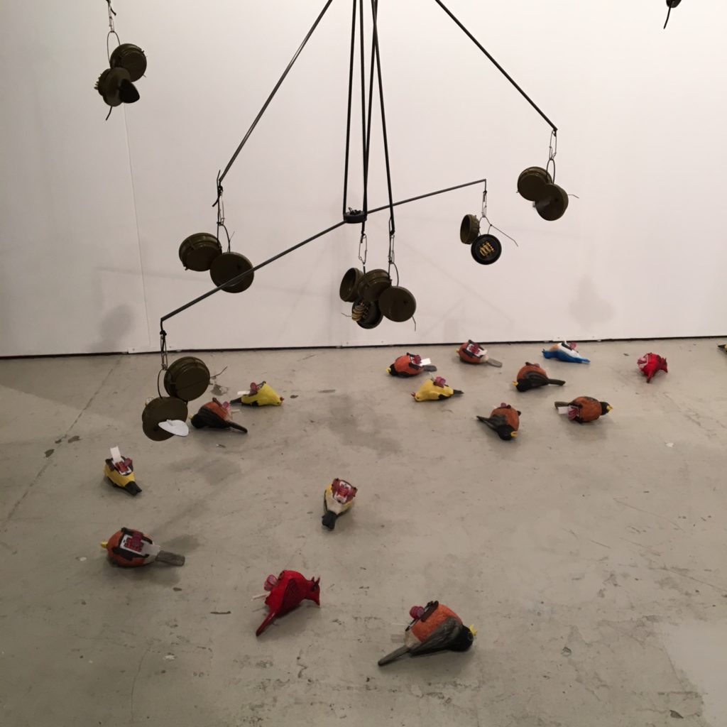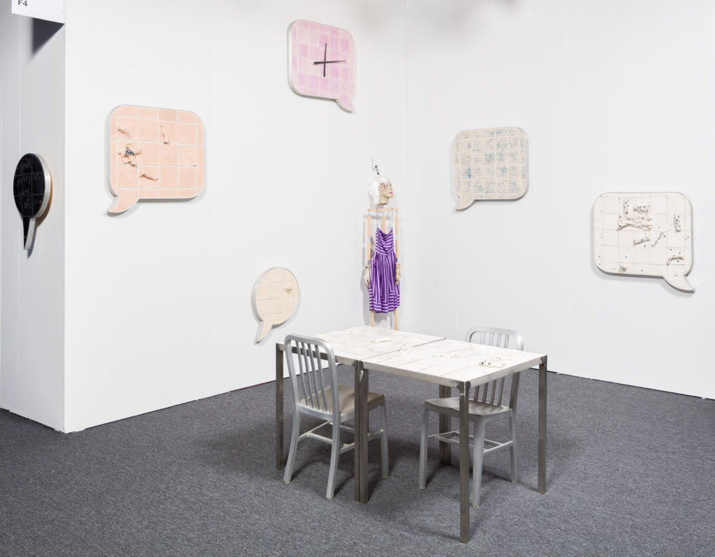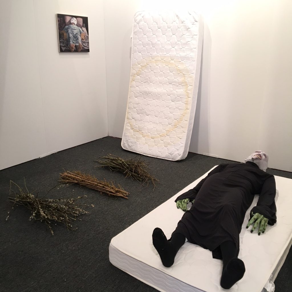 In the Freeways section of the fair, Los Angeles-based gallery Jenny’s exhibited a series of glazed ceramic sculptures by Liz Craft. ‘Mi Vida Loca’ by Craft is inscribed with the phrase “us girls gotta learn computers” is framed around a doll’s severed body. This work feels appropriate, situated in a political moment where Silicon Valley advocates for marginalized people — so long as they surrender their labor to them — in tandem with protest signs seen at recent demonstrations and marches that read “TEACH A WOMAN TO CODE.” Park View, also based in Los Angeles, showed oil paintings by Autumn Ramsey and photographs by Buck Ellison. ‘Upper School Greenhouse, Marin Country Day School, Tiburon, California’ by Ellison is a photo of vegetable leaves with the white stems in the center of the work. The title makes reference to a private kindergarten-through-eighth grade school in Marin County, California, one of the wealthiest areas in America. Queer Thoughts, the only New York gallery in Freeways, exhibited a solo booth by Puppies Puppies, who also contributed a series of performances throughout the fair. The booth showed Puppies Puppies’ oft-used Voldemort character sleeping on a mattress amongst a detritus of twigs and small branches, in similar conversation to his 2014 performance piece ‘Voldemort On Lunesta.’