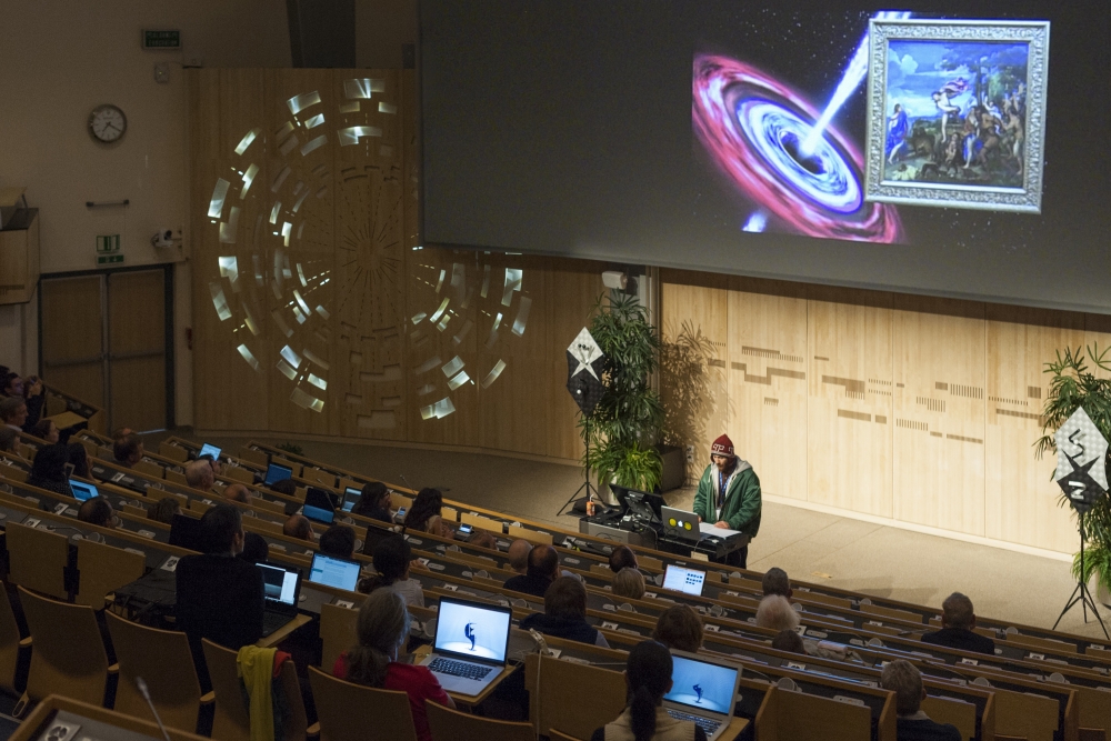 The Fermi programme is an all-day event fostering cultural collaboration between the arts and sciences and is centred around LAT, one of the instruments used at the centre. ‘Blazing Quasi-Stellar Object’ was a multi-media performance bringing together the format of a lecture with visual accompaniments to look at the renaissance painter Tiziano’s ‘Bacco e Arianna,’ focussing on “the complex stratifications connecting this painting to the frontiers of multimessenger astrophysics.”
