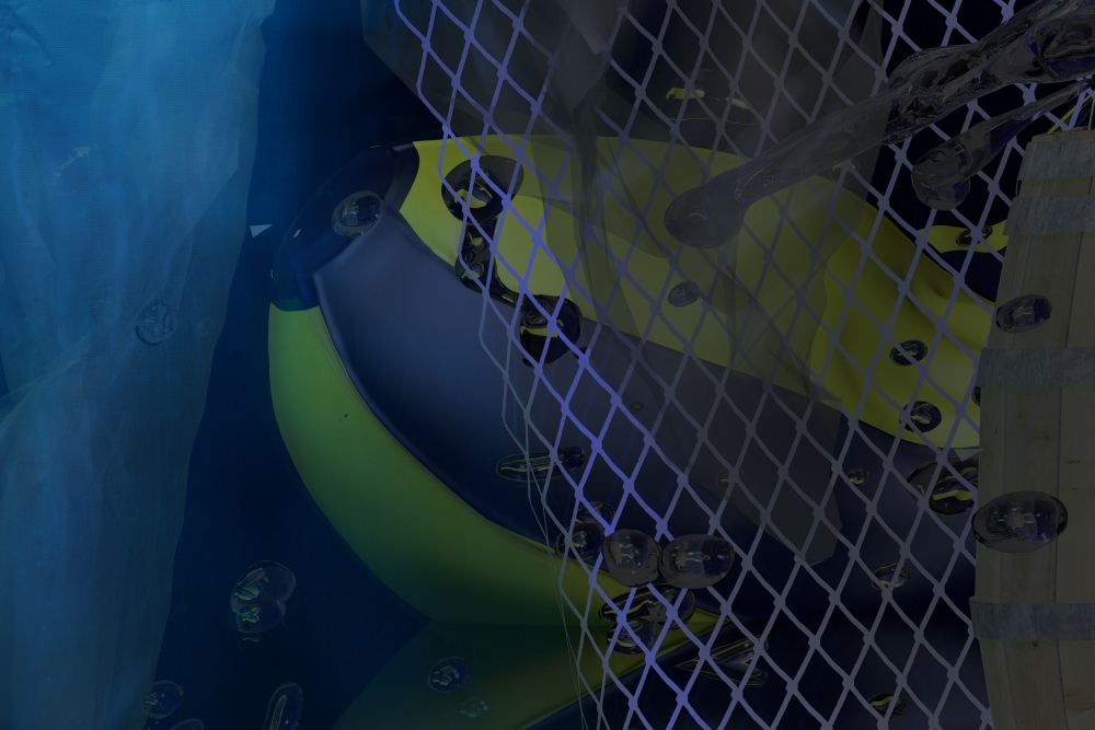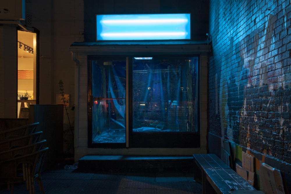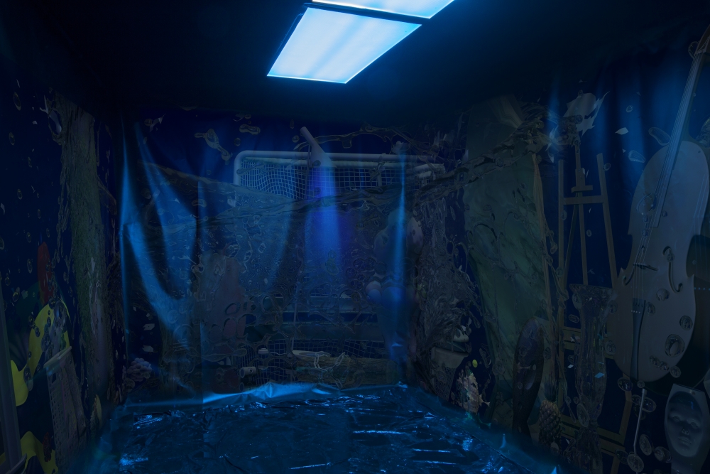 The installation, a darkened blue and immersive space, explores objecthood as it exists both physically and virtually. An accompanying text by Erin Reznick describes her interest in archaeological imagination as presenting, “an intentional collection of things, obscured by darkness, stripped of context and functionality.” Each object, holding its own social relations and pre-existing language, come together to form new arrangements.