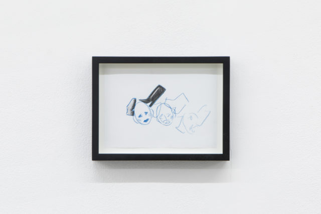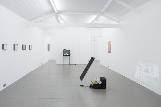 Harry Burke’s series of fragmented moments — poems, thoughts, experiences, and drawings typed in letters and keyboard symbols — is at the entrance. They’re chaotically spread on A4 pieces of paper printed with an inkjet and placed in a pile on a shelf next to the door. They are outtakes from a narrative told by someone, by everyone or by no one. This piece is simple but a compelling conceit: the language creates fragmented desires, intimacy and alienation and reflects upon the ubiquity of social media. Its poetic abject voice is read privately, the spectator can leaf through the sheets, their hands touch the surface of the words and follows the layers of the poem: “NO ONE LISTENS” is written in block letters on top of a longer poem “… cats don’t listen / cats cud cuddle it’s cuute.. [sic]”. Following this flux of words, images and fantasies emerge and disappear into a constant feeling of detachment. Burke is of a contemporary kind of artist using words to represent a post-human stream of consciousness; an abject self at once in opposition and complicit with neoliberal ideas of singularity.