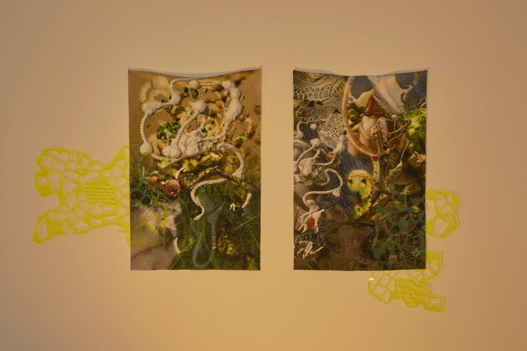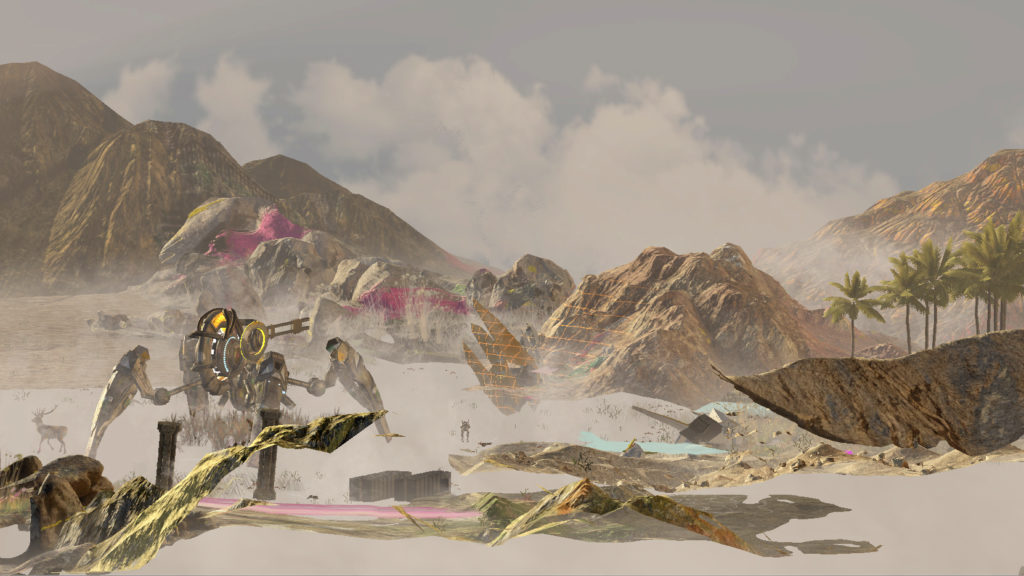 Eva Papamargariti: The main idea of our show is exploring the ongoing interaction between nature and technology. This interaction sometimes is becoming apparent and sometimes is quite subtle, almost as being implied. I believe the connecting mechanism of these conditions is the way we permute the role of human in our work. I find it very intriguing, the fact that in your work [‘Seamless,’ 2017], Theo, the human doesn’t exist at all but the viewer somehow obtains the role of the observer, we slowly become part of your constructed landscape because in a way it feels that our gaze activates it – almost as we are looking at an object.