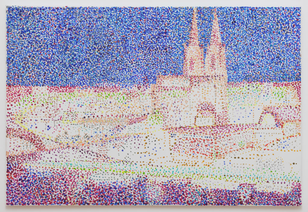 Interestingly, the group behind Spaulings does not have a day-to-day collective practice. They only come together to work on commissions, while having their own individual artistic engagements. In the case of Her and No, the collective had one year to work on the show, which curator Ania Czerlitzki says is a rarity. Normally they meet in an offline, real-time space and collectively develop, paint and critique in a frenzy of speed before the opening only a few weeks before. Each work is jointly created, in doing so contesting the infrastructure that is traditionally applied to the star painter in a neoliberal art world from within. There are other contemporary projects that also spoof this rhetoric — DIS Magazine, for example — but what still holds the enthusiasm of this act in Spaulings’ work is that even when something is as traditionally-ladened and marketable as painting, the cultivation of the solo self is made redundant in the mythical collectivity of her collaborators. One clear abstraction of a once-conventional methodology is Spaulings’ use of pointillism. In the show, various canvases ascribe to this technique developed around the 1880s, which uses small, distinct dots of colour applied in patterns to form an image. In Spaulings’ case it’s the New York Herzog & de Meuron-designed luxury condo skyscraper on 56 Leonard Street, often described as the ‘Jenga building.’ This method of neo-impressionism had a heavy anarchistic flavour to it in its day, which could explain another draw to the craft from the collective. The most prominent pointillist artists, Georges Seurat, Paul Signac and Jean Grave, all attested to anarchist ideology alongside their aspirations toward achieving the unreal through their depictions of microdots as life. What is also perhaps important to note here, is the way in which pointillism also delineated the artist’s touch from the product — there is no signature to a dot, it’s more reflexive than cultivated, one dot on its own is as unique as any other dot. To the human eye, one Spauling’s collaborator’s dots are indistinguishable from another’s, together they mask their individuality in favour of collective production. A key component to the advancement of disorder being due to the absence of authority or a singular controlling system, is perhaps the illicit message in the works.
