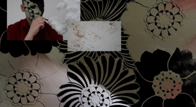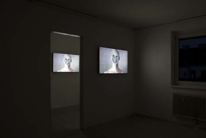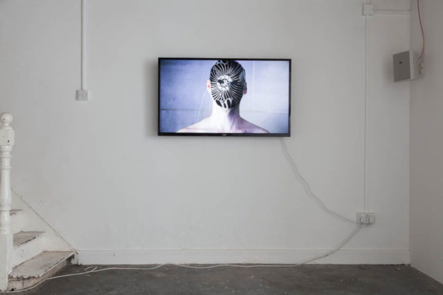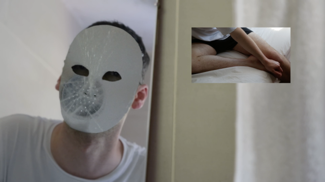 Inspired by real conversations or one’s overheard in public, the words (sometimes spoken, sometimes sung) move through the show with surround sound. Related, but not synchronised, a video plays on a loop; cutting between bedroom and shower scenes, the protagonist’s face is always concealed by a mask of other footage.