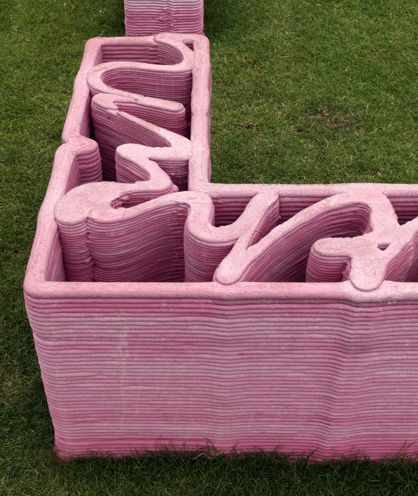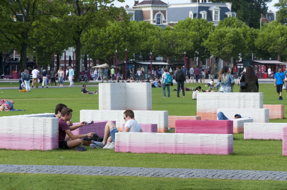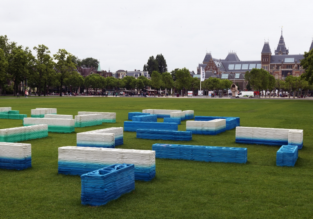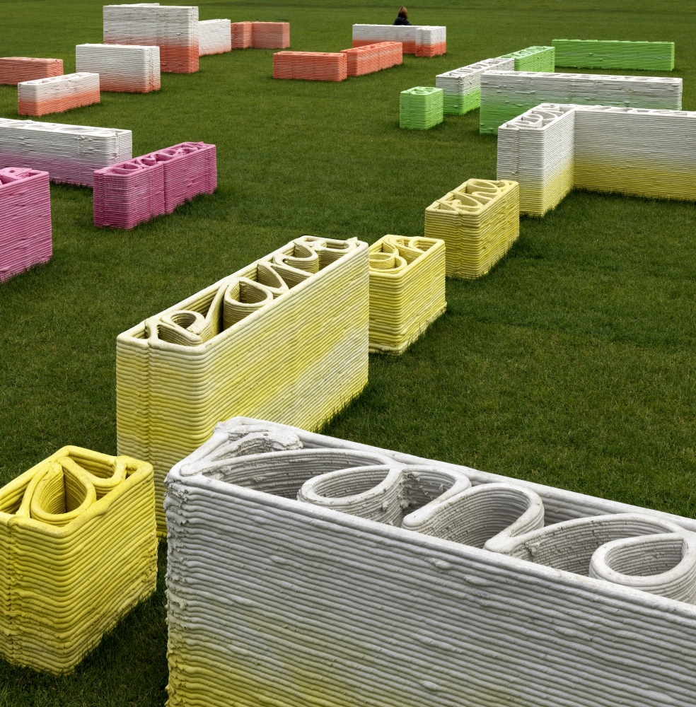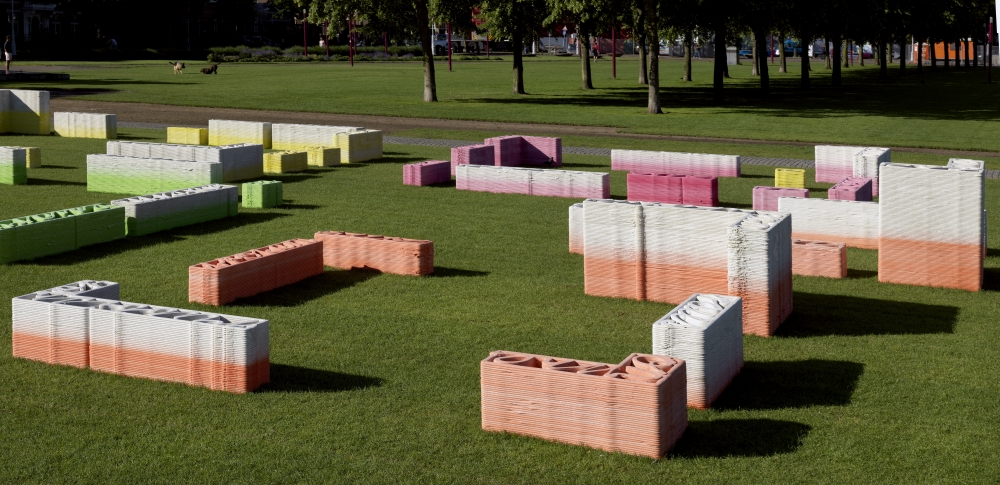 Installed at the site of Museumplein, the work sprawls across the green open space; free and accessible, the 3D printed concrete forms create a landscape of rooms. A comment on the contemporary housing situation, the collective explore, “issues connected with the global housing crisis, mass production and the relationship between public and private.”