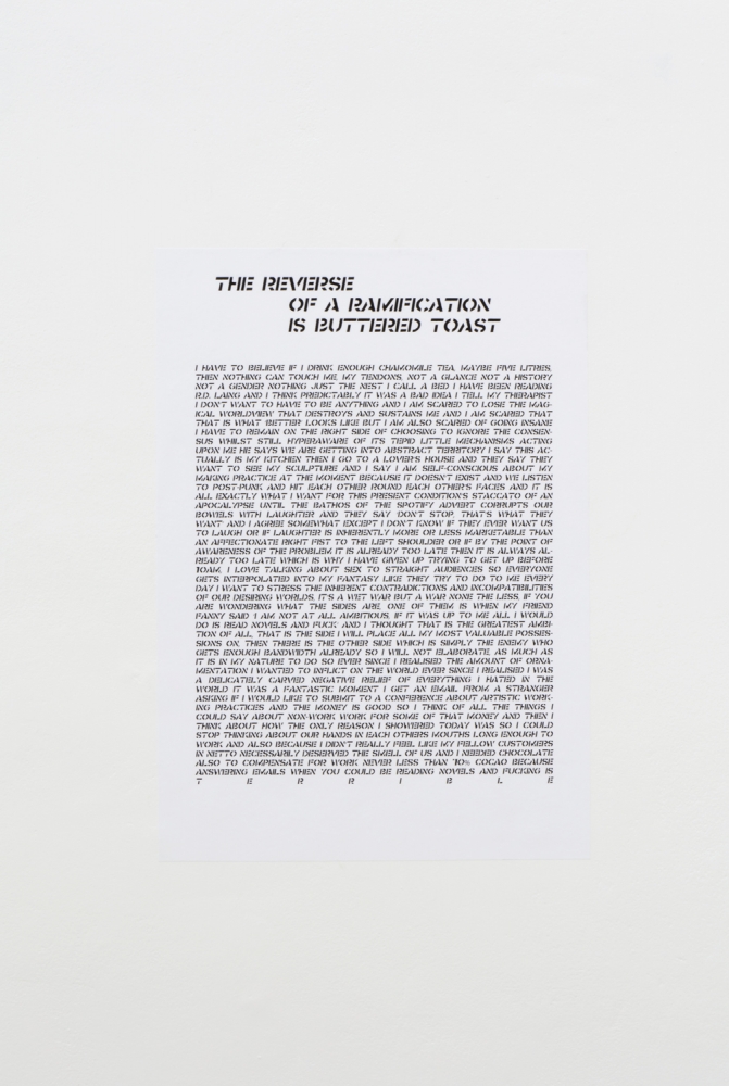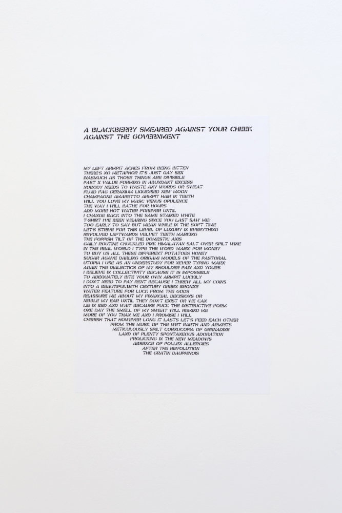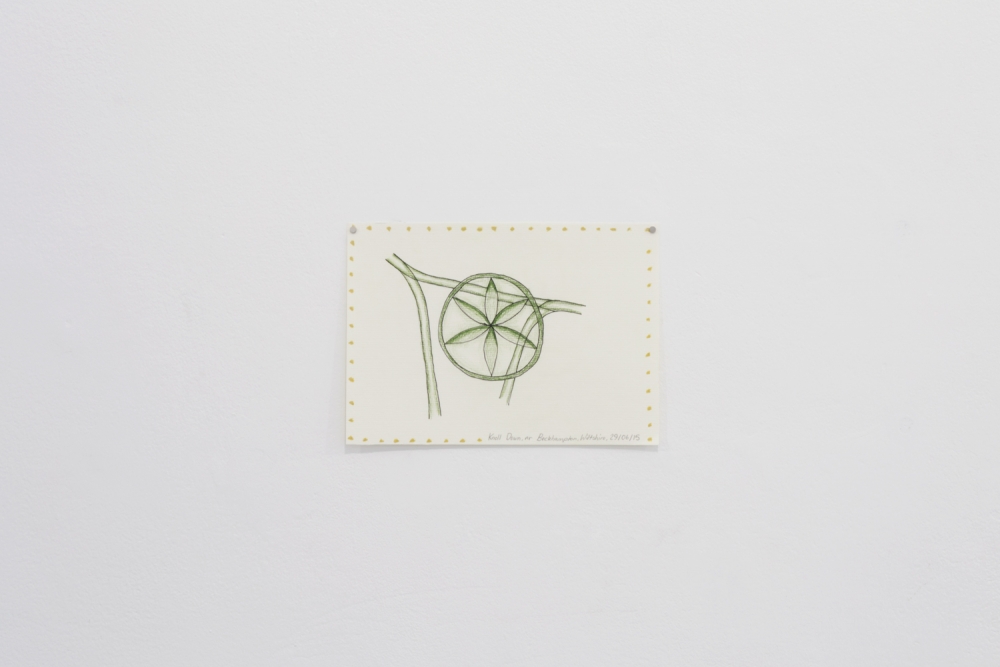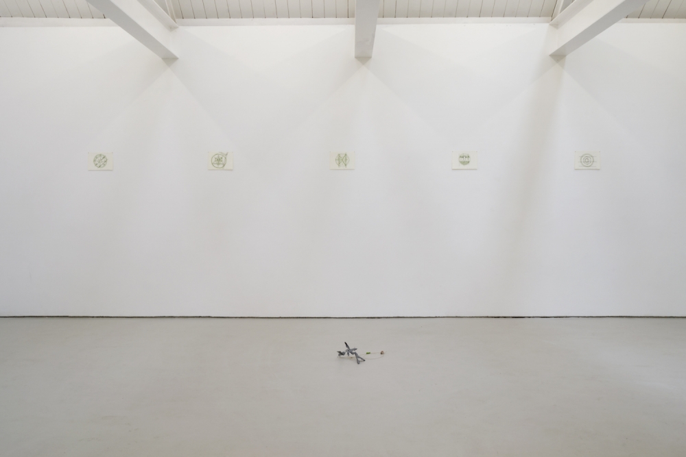 Heavy and light physicality’s play out in the almost-bare room, which includes a number of crop circle drawings, love poems and appropriated then re-purposed toy police vehicles, which attempt to explore the in-between of spaces, like panic attacks, making out and dairy intolerance, among many others.