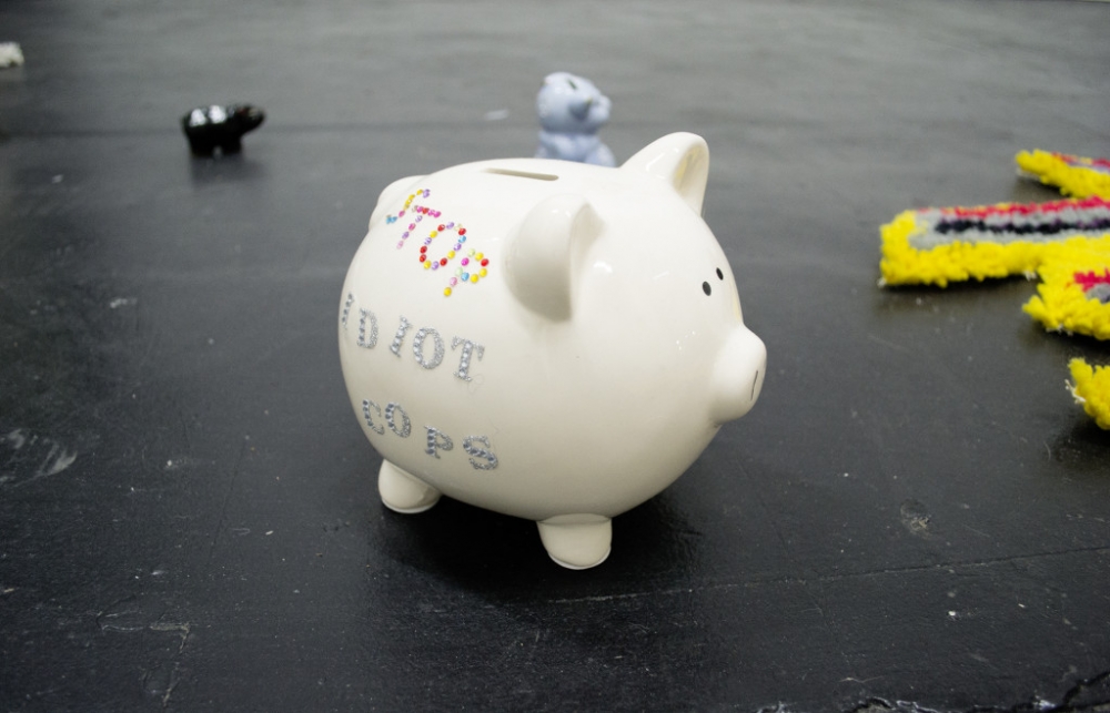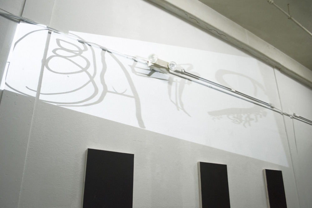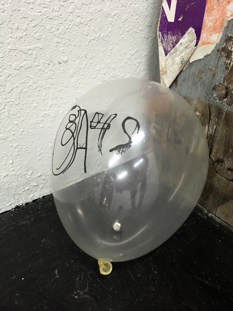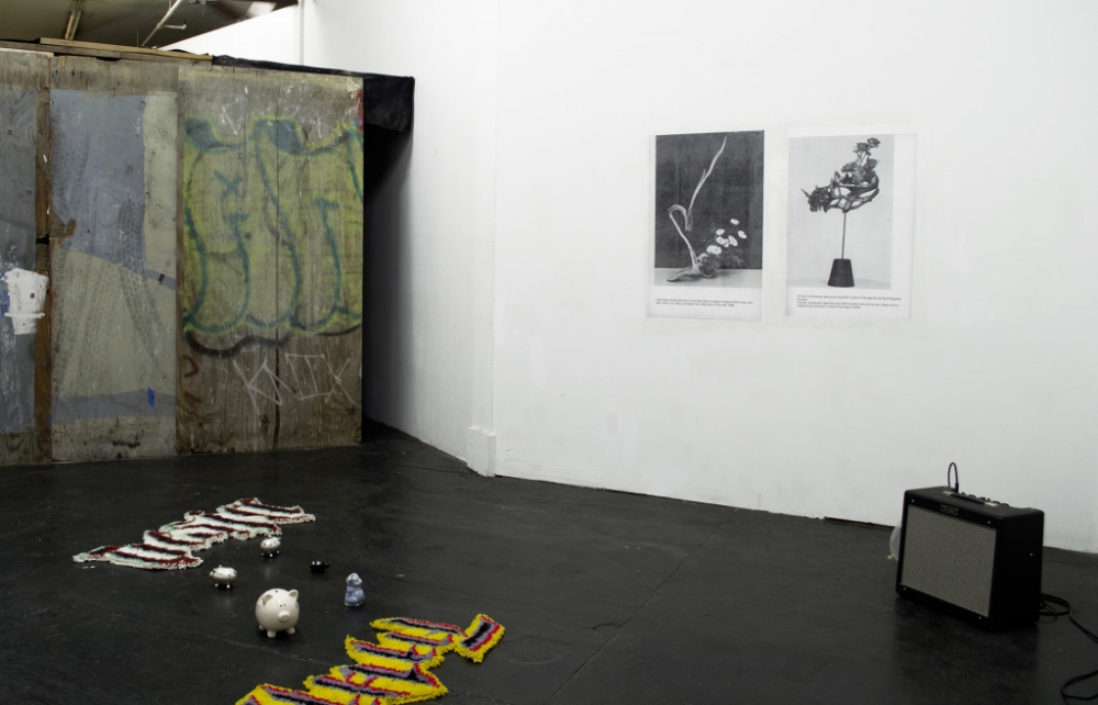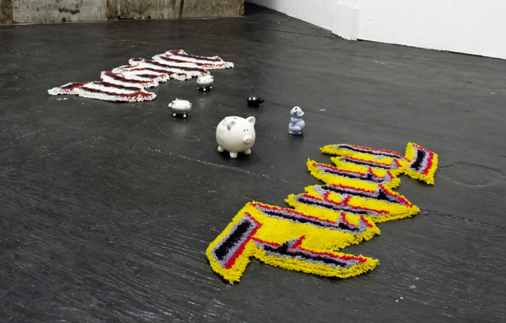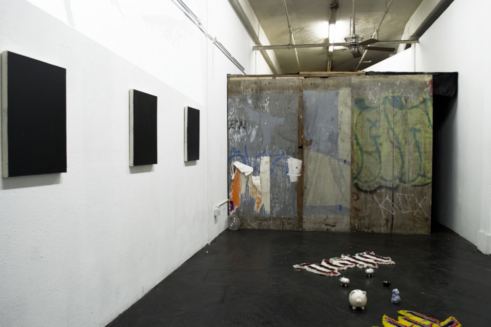 Curated by Flynn A. Casey, the show included works by John Knight, Rebecca R. Peel, Oa4s and Andrew Norman Wilson. The installation brought together a number of mediums, including sound, projection, paintings made of charcoal, enamel, latex and polyurethane, wheatpaste, rugs, ceramic piggybanks and balloons, as well as an HD Video.
