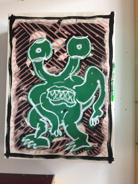 Aurora Sander: Our practice definitely takes its cue from everyday situations. We spend our days and nights scrolling as the world slowly crumbles around us — a lot of it thanks to monsters? Memes and monsters are everywhere. In this case or work, it’s a series of bathroom closets we made where the mirror has been exchanged with a painting of a monster. Maybe you’re also a monster? Remember this John Carpenter movie called They Live? The aliens aren’t here yet and we’re not providing you the sunglasses, but maybe the situation today is not entirely different.
