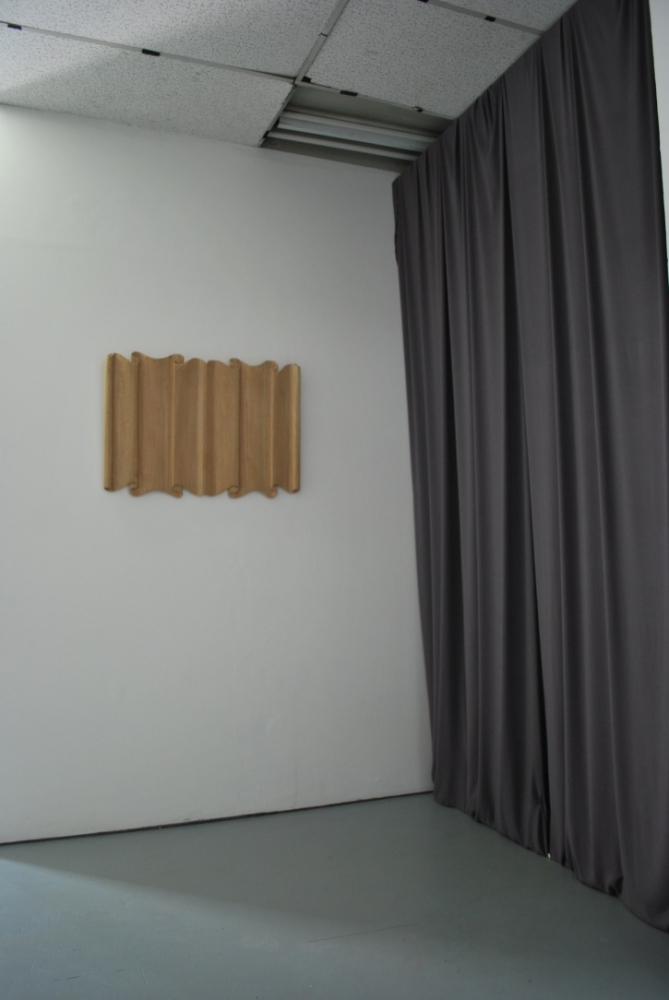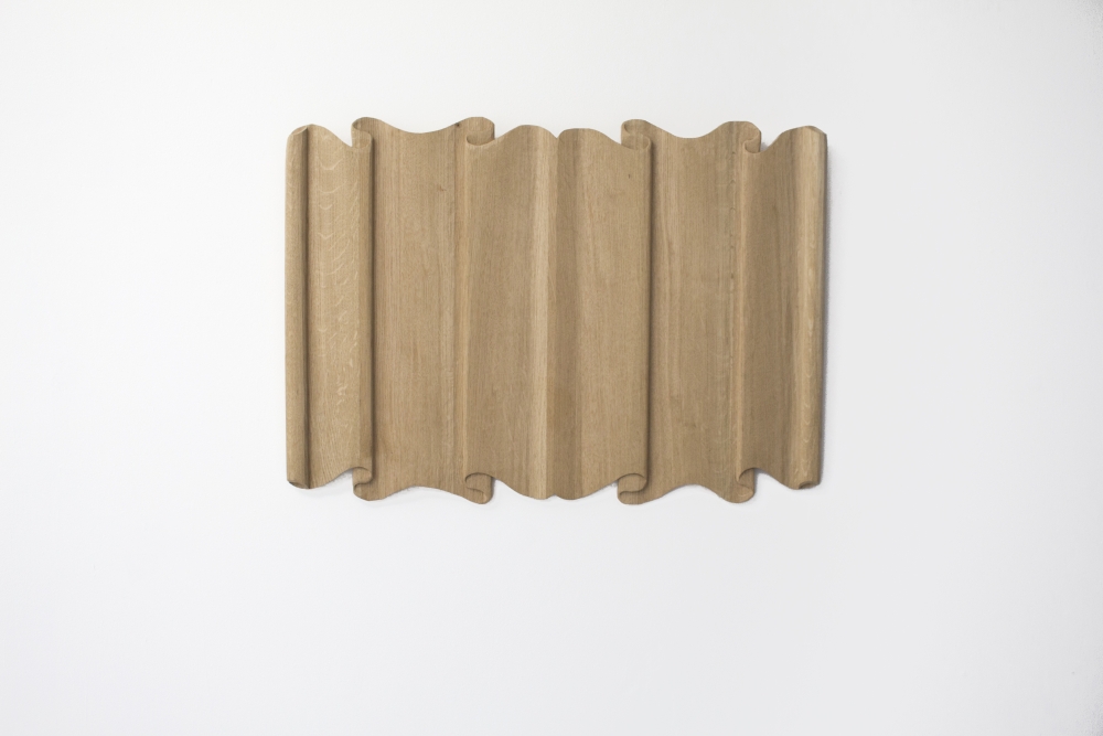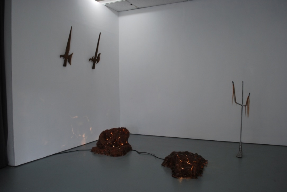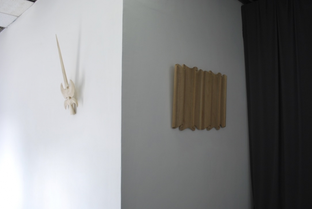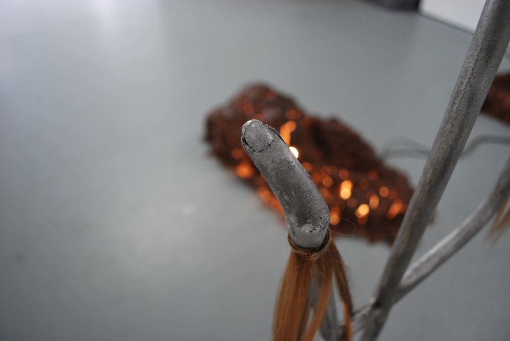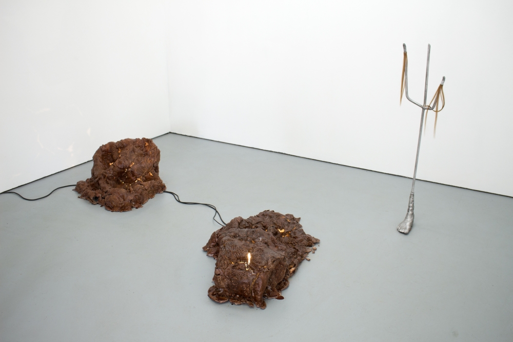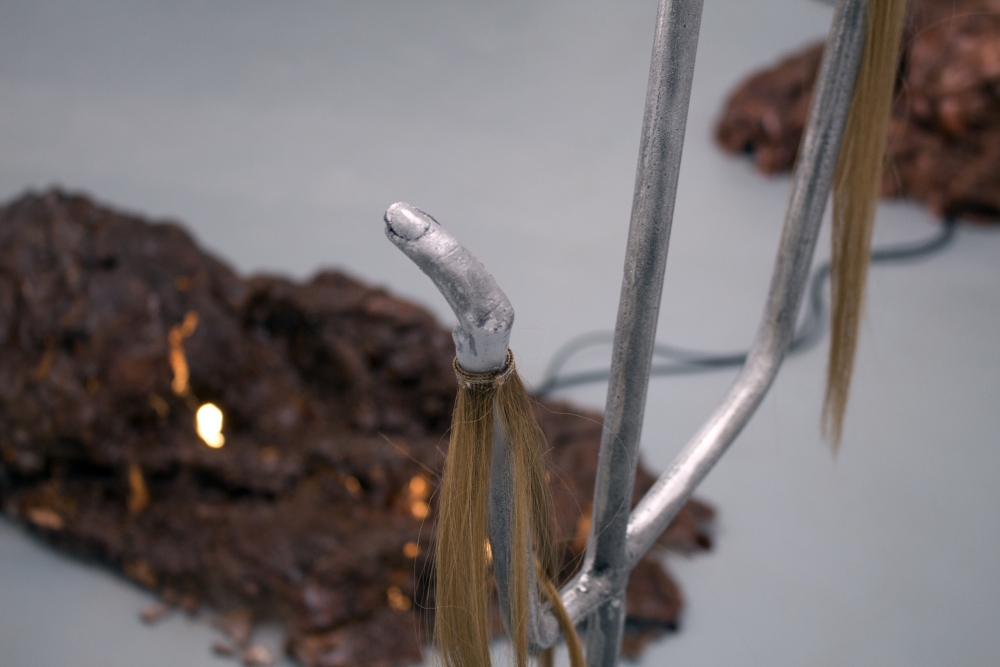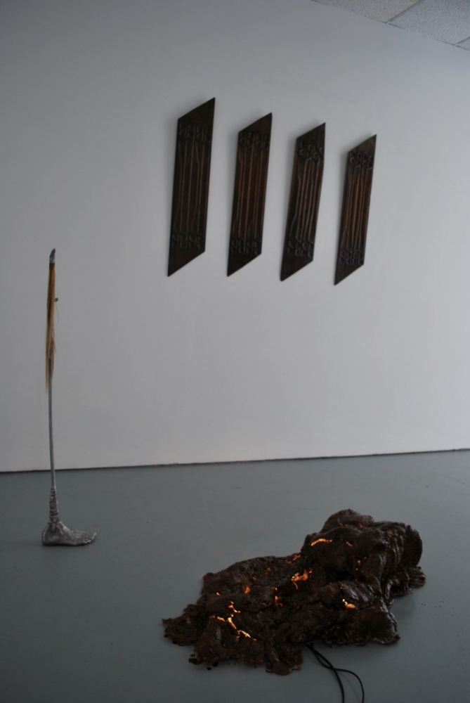 The installation used a number of materials, including walnut and poplar carvings, unfired terracotta, baby powder, light fixtures, synthetic hair, earthenware ceramic and appropriated 18th Century Linenfold.