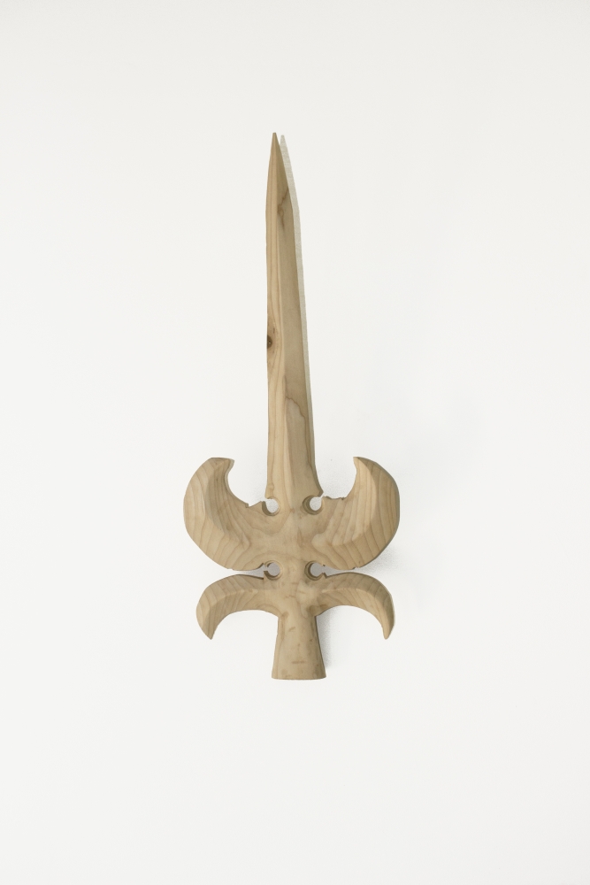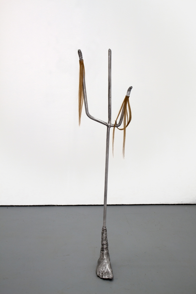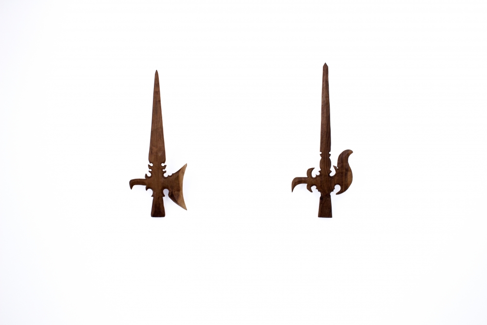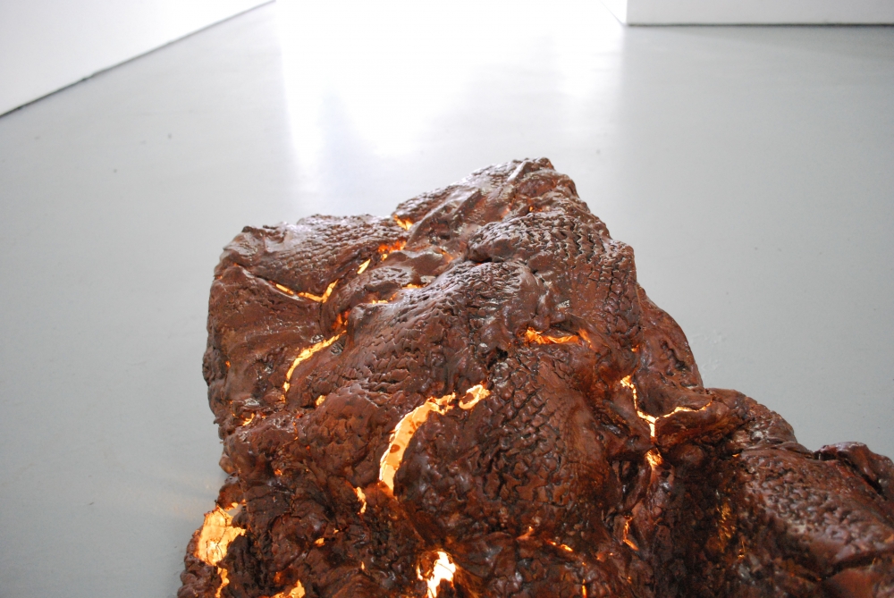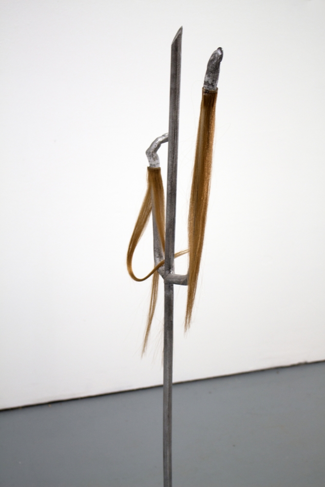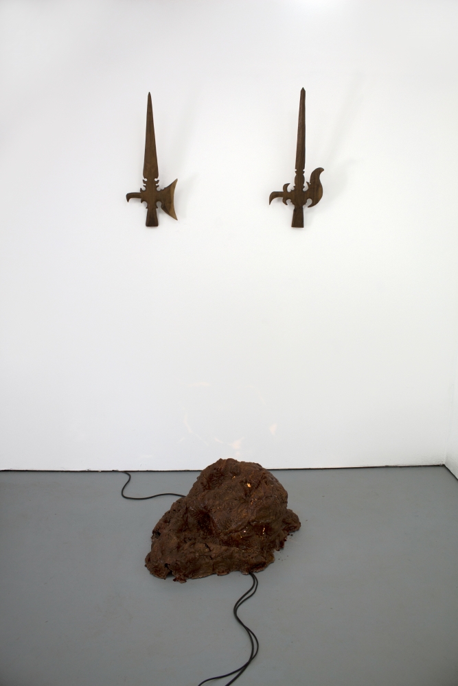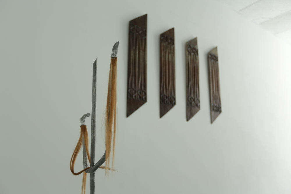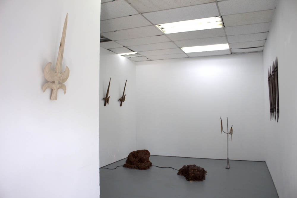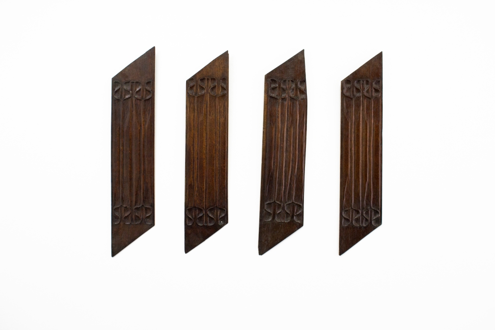 The installation used a number of materials, including walnut and poplar carvings, unfired terracotta, baby powder, light fixtures, synthetic hair, earthenware ceramic and appropriated 18th Century Linenfold.