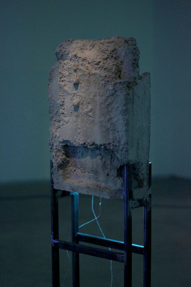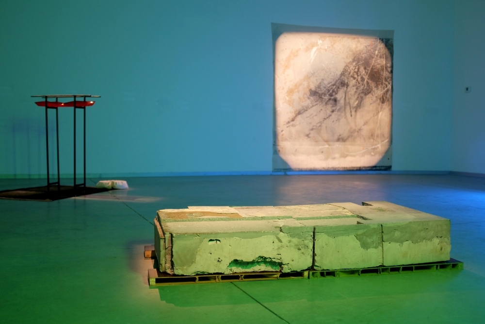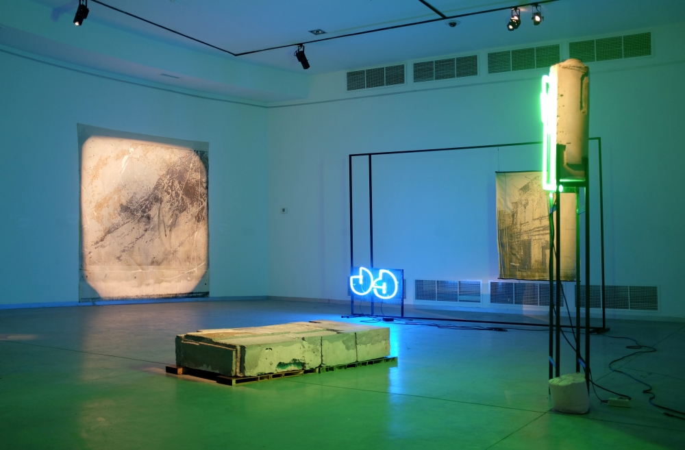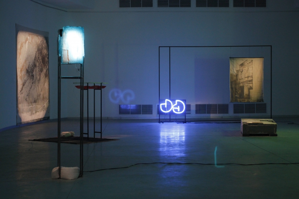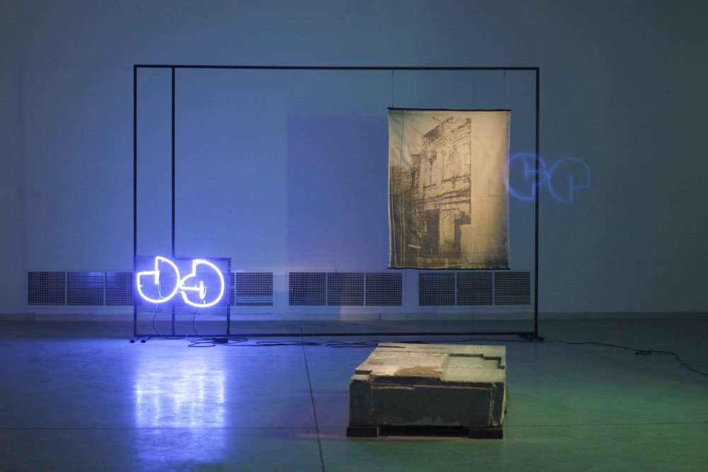 The installation consisting pigmented plaster sculptures, neon lights, woven tapestries and large-scale painting, addresses the Tbilisi-born, New York-based artist’s central concerns in the “transitional state of today’s world” of an as yet unknown future and fragility of “all possible paradigms, notions or values are conditions.”