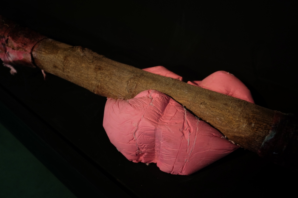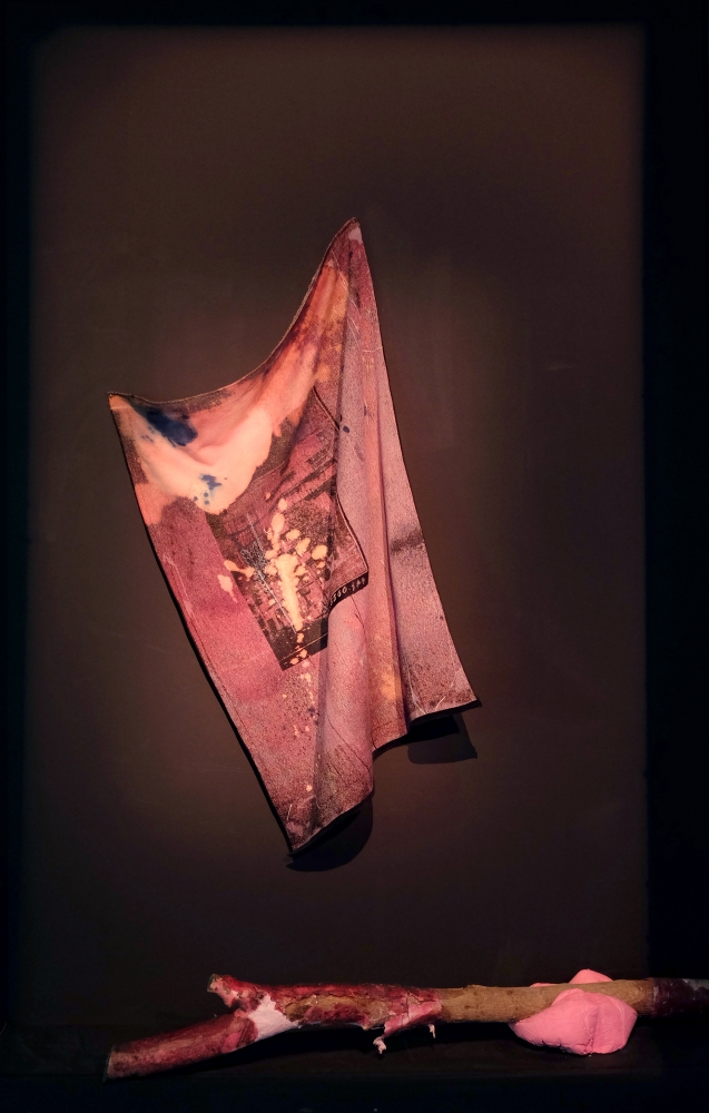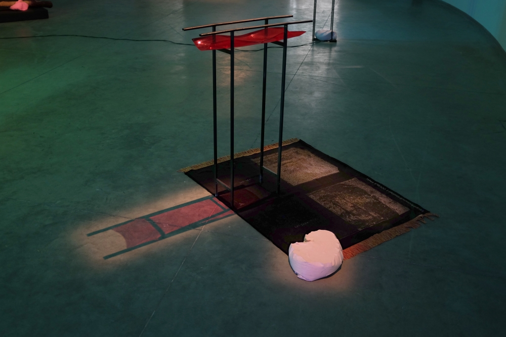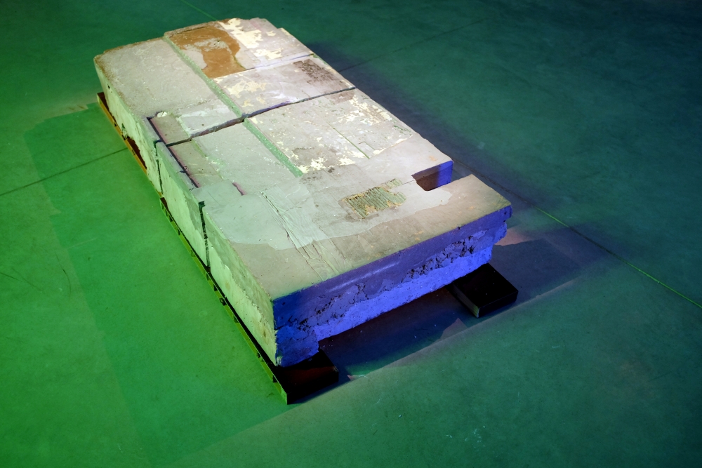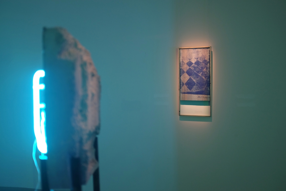 The installation consisting pigmented plaster sculptures, neon lights, woven tapestries and large-scale painting, addresses the Tbilisi-born, New York-based artist’s central concerns in the “transitional state of today’s world” of an as yet unknown future and fragility of “all possible paradigms, notions or values are conditions.”