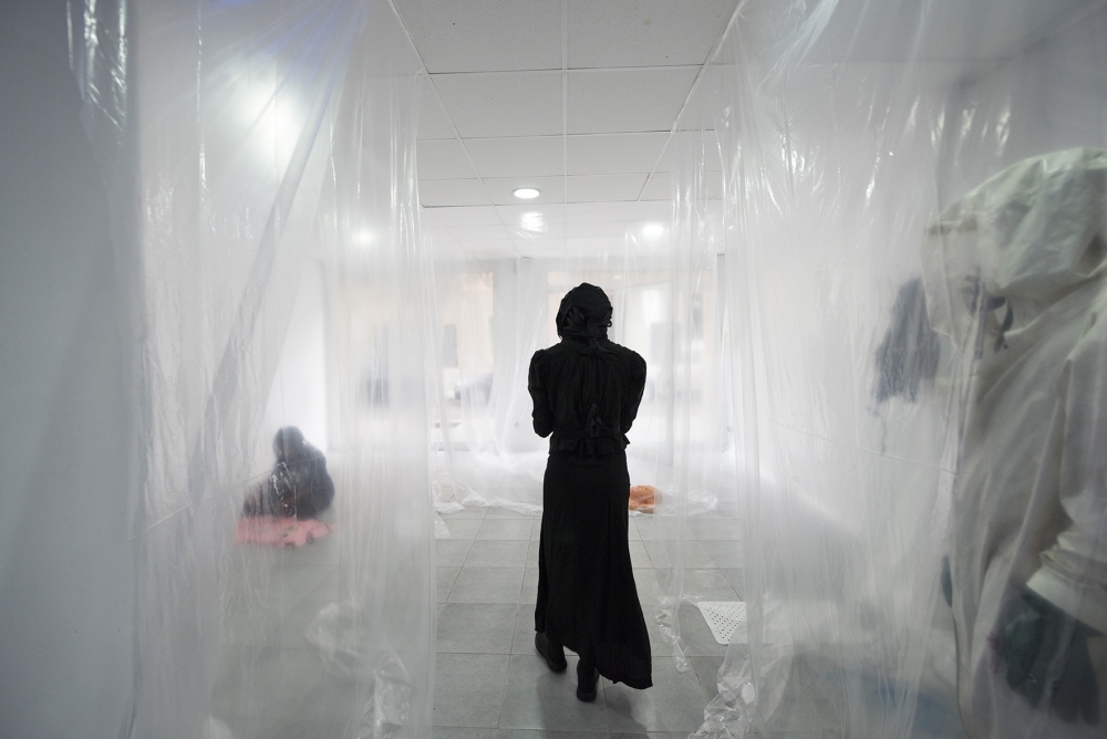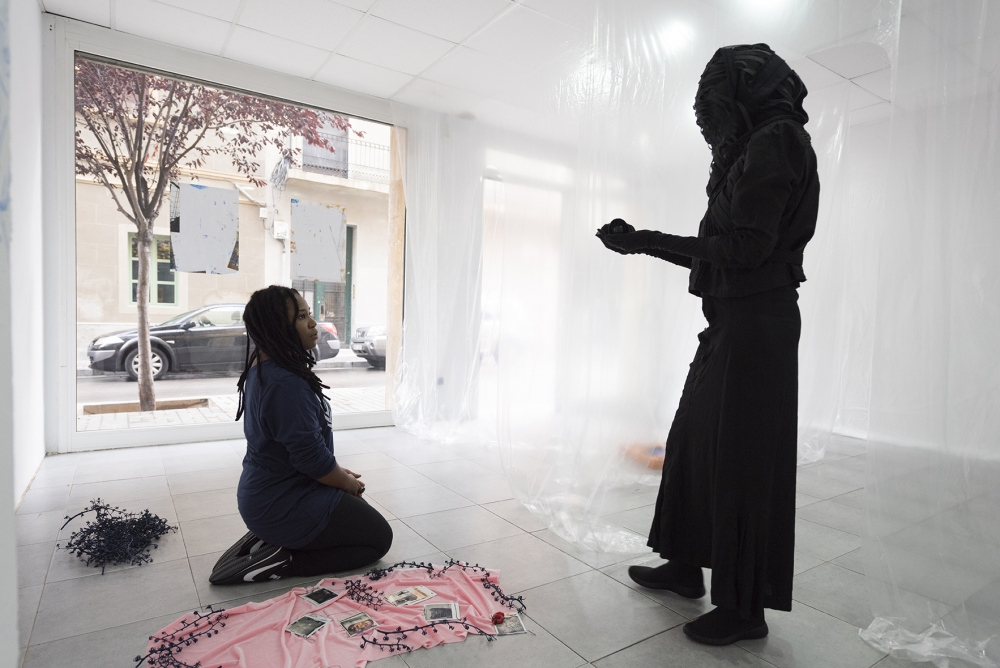 The exhibition included an installation and performance informed by “current geo-political conflict, environmental disaster, fantasy, film, and science fiction,” which orchestrated a narrative between three characters and their relationship to the sculptural elements around the space: a scientist, a time-traveler, a ‘human’ wearing a United Nations-like t-shirt.**