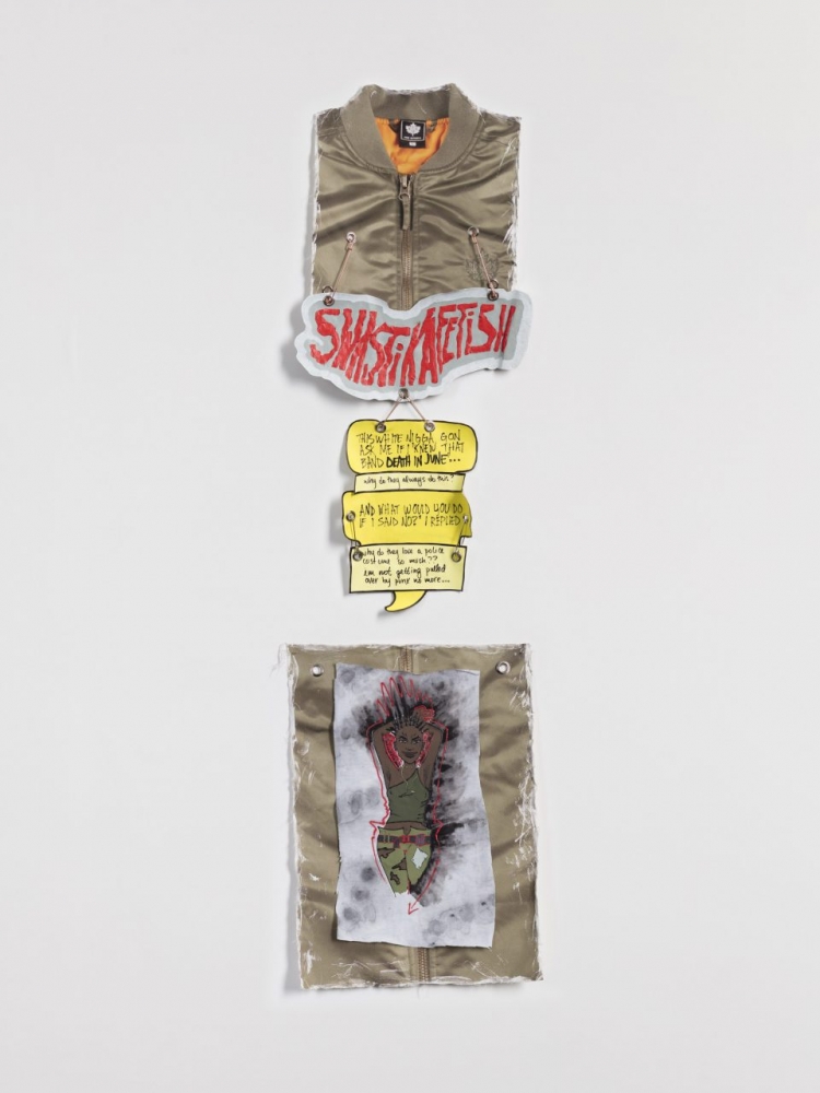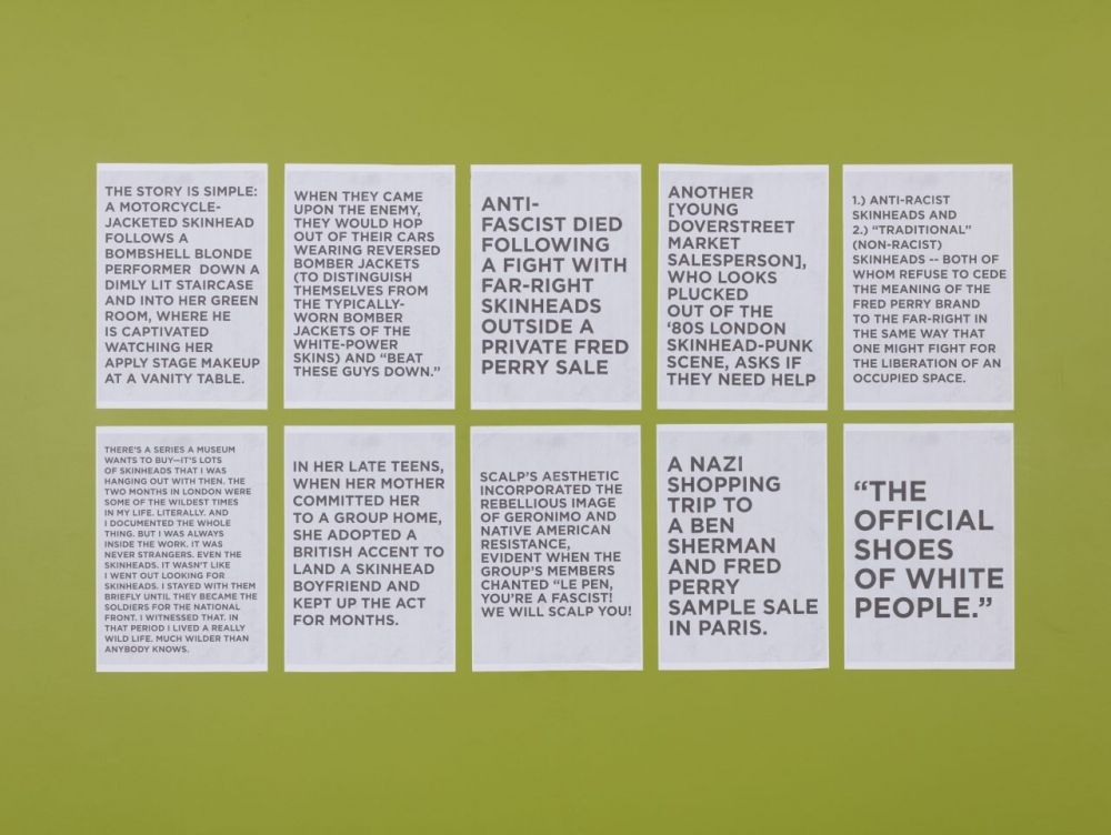 A number of posters are plastered onto a painted green wall that move between a language of newspaper headlines and more personal notes or twitter captions, such as ‘THE OFFICIAL SHOES OF WHITE PEOPLE’ and ‘…SHE ADOPTED A BRITISH ACCENT TO LAND A SKINHEAD BOYFRIEND AND KEPT UP THE ACT FOR MONTHS.’