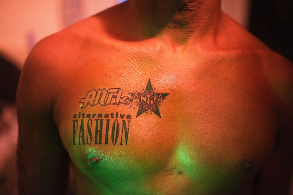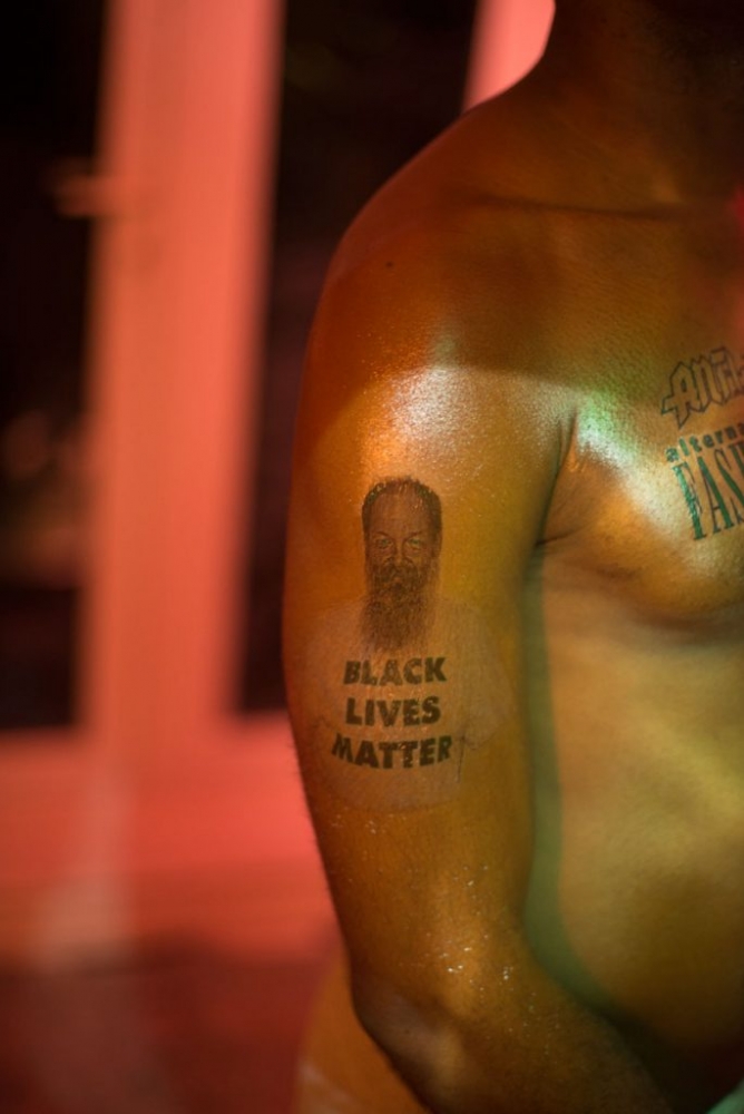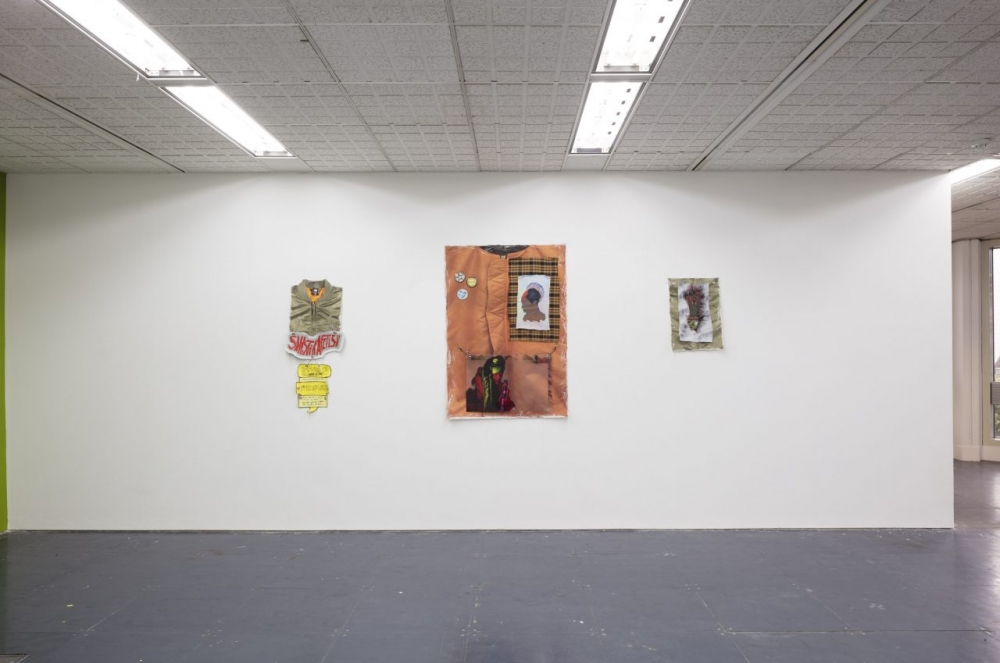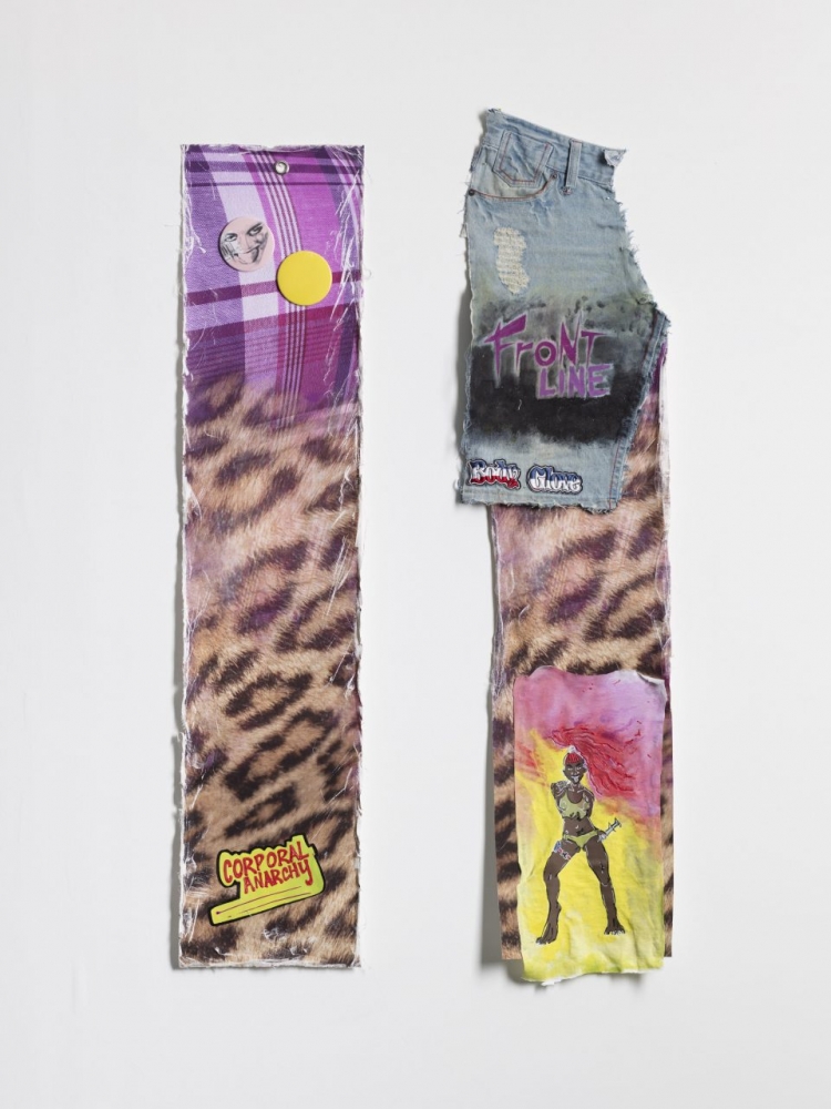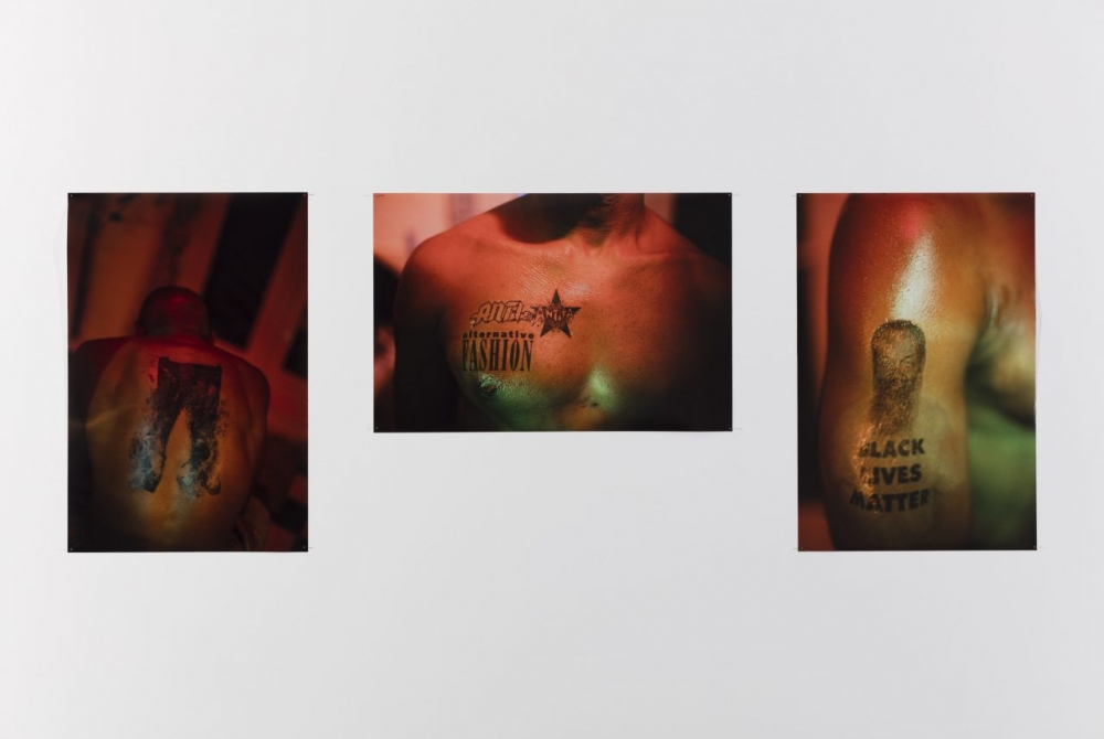The installation is an assemblage of fabric, posters and photography, where slogans and words crop up inconspicuously, rubbing against each other in their own conversation. ‘Black Lives Matter’ and ‘Anti-Antifa’ appear tattooed on the same man’s body, badge and other punk insignias read ‘Ska & Rocksteady,’ ‘Corporeal Anarchy’ and ‘Rock Against Racism’ and ‘SwastikaFetish.’ Intertwined is another layer of imagined conversation through a dialogue taking place in speech bubbles.