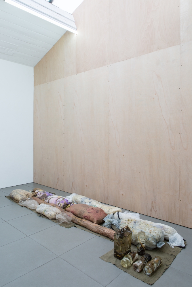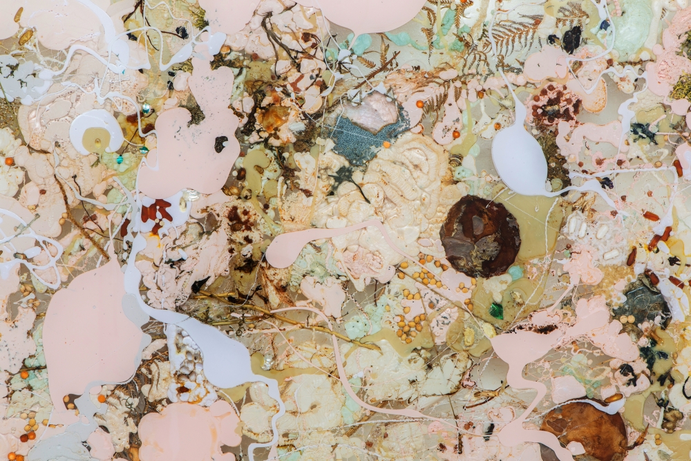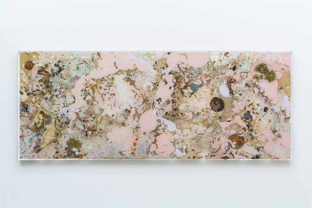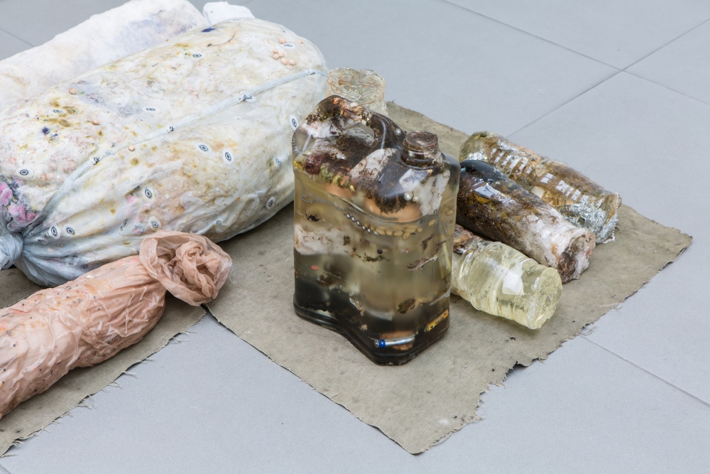 The installation ‘appropriates dead and living matter’ that the artist has collected, foraged and hoarded over time, including both elements of nature and detritus in an effort to articulate and ‘make sense of the world.’ Algae, lichen, mentha, kombucha, Diet Coke, marbles, wrapping, hair removal wax, lactation or tranquillity pills are some of the many items selected for their ingredients.