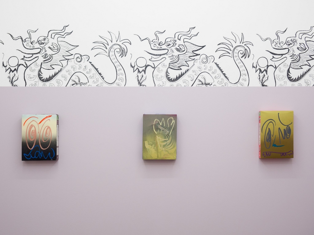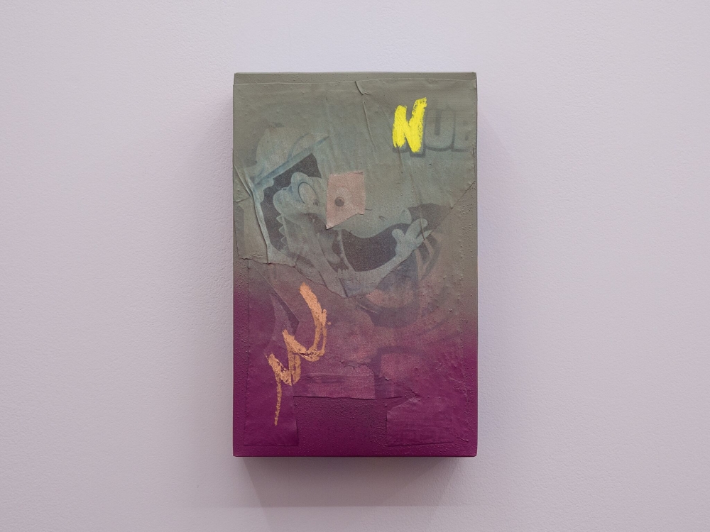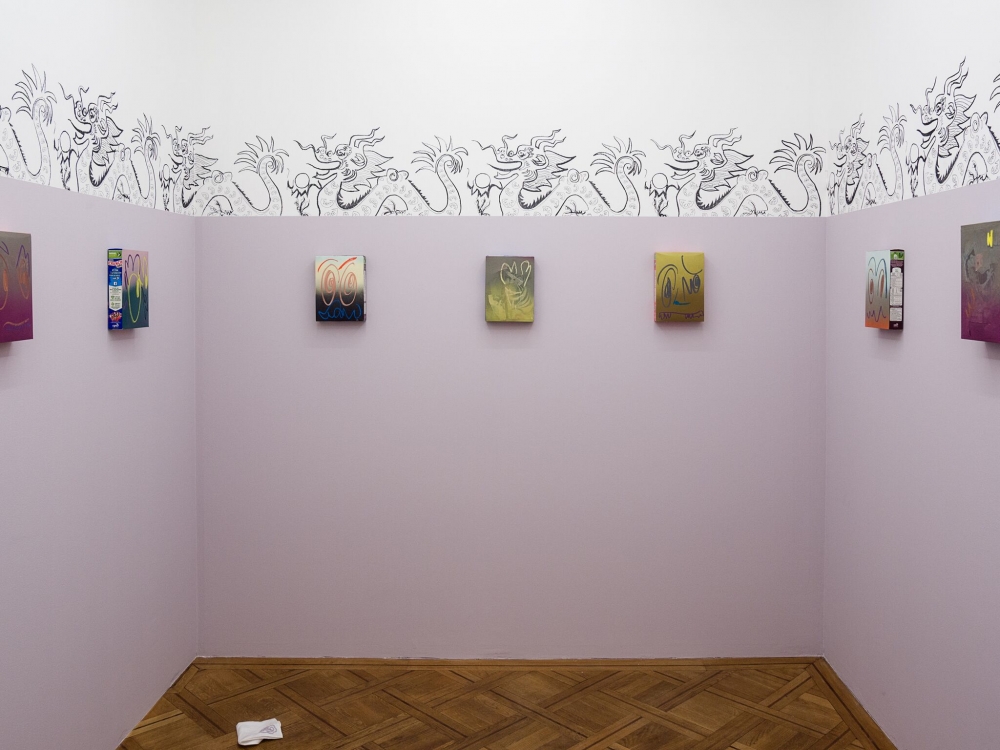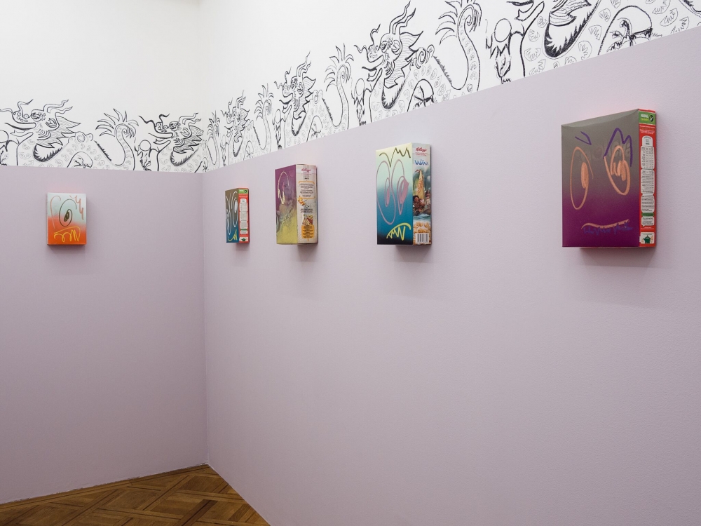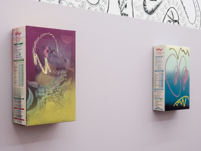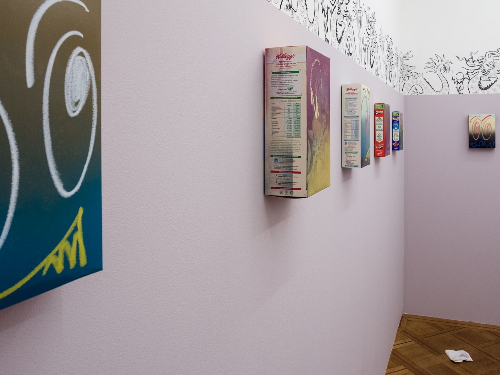 The installation brings together wall based paintings and painted cereal boxes against the backdrop of a light violet painted room. An accompanying text by Jérémie Gransenne lays out a comically complimentary meeting with Coullard described as a moment when “small unforeseen miracles happen in the sinuous course of life.”