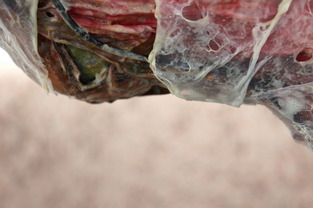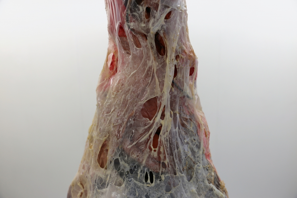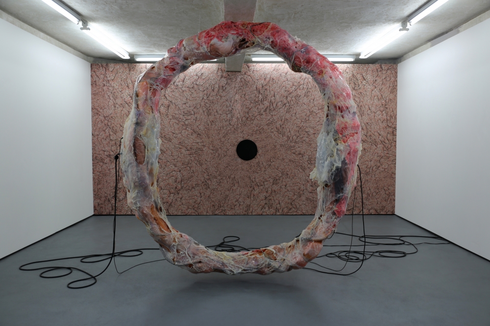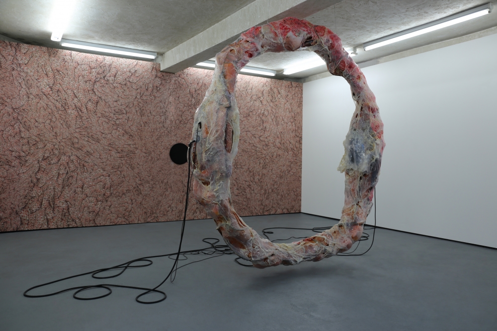The installation presents a mix of sound works played through a sculpture described as an ‘evolving wormhole’ and includes contributions by over 30 artists and musicians including Carl Gent, Brood Ma, Choc Ly Tan, Endgame, Sarah Duffy, Joey Holder, Pacific Drift and Sophie Hoyle among many others (see below for full track-listing). The circular structure has undergone a process of layering, stretching and melting together of various materials including fabrics and plastic.