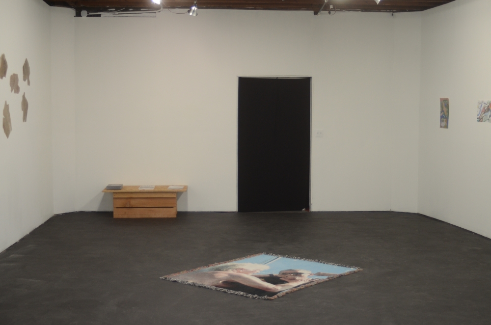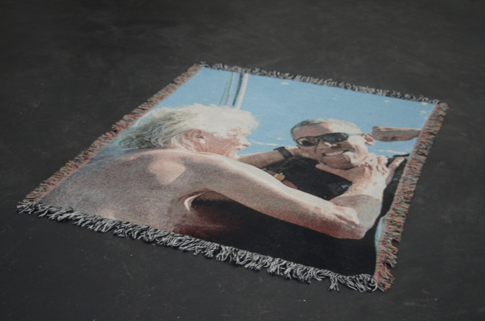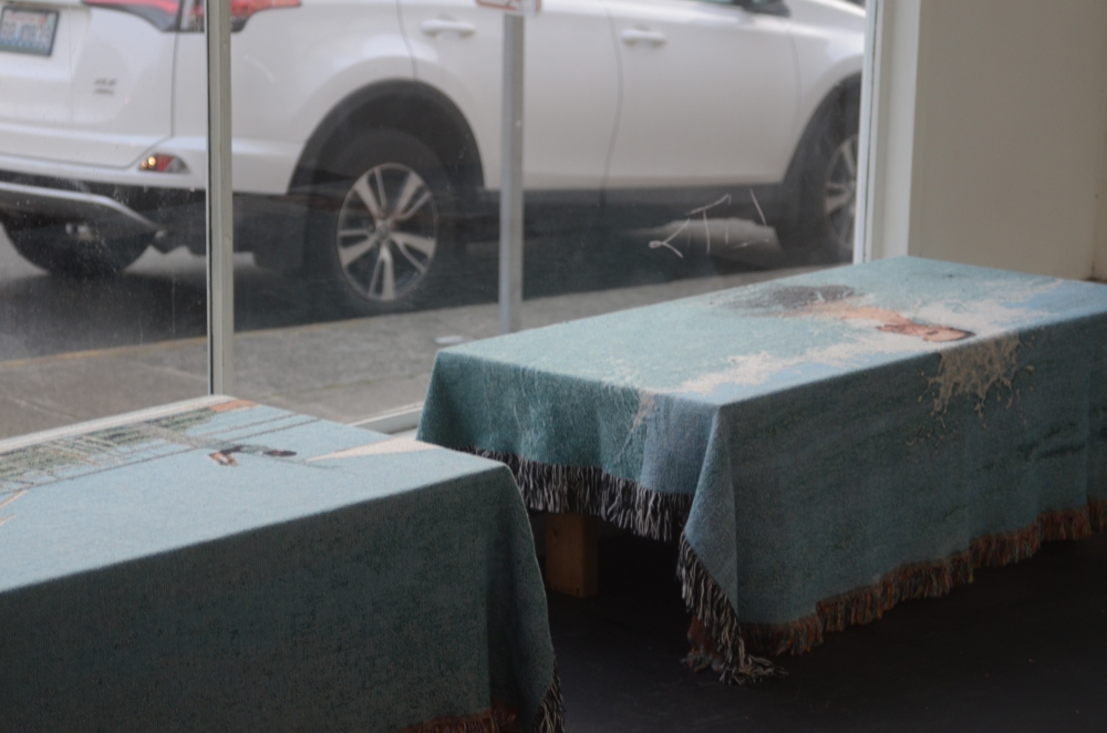 The installation includes machine-woven blankets, digital paintings, graphite portraits and other materials “without the need for power cables or WiFi access.” Images of tabloids, presidents, ancient Egyptian symbology, make up tutorials, nature and emojis present themselves as ‘fragmented artifacts’ or a ruin somewhere between archeology and the future.