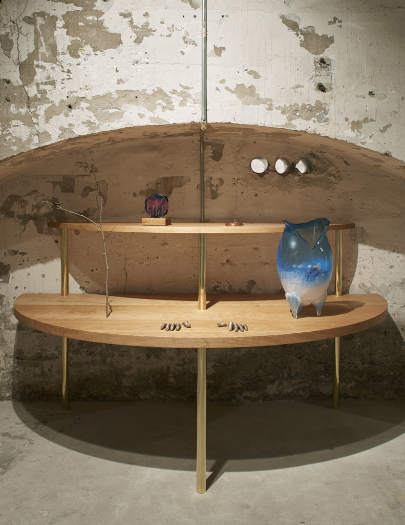 The moveables, or structures that utilize the language of domestic furniture such as shelves and tables, specifically build off of the versions from my last exhibition, Being as a Thing. There, the moveables developed with a vocabulary that I borrowed from bed frame, table, shelving, screen, and sandplay design. For Long Exposure, I wanted them to further blur the boundary between object and display mechanism, and allow the arrangements to be examined without privileging any one perspective. This is what lead to the rounded and curved cherry wood planes — each one builds off of an interaction with a circle, whether elongated or divided or perforated.