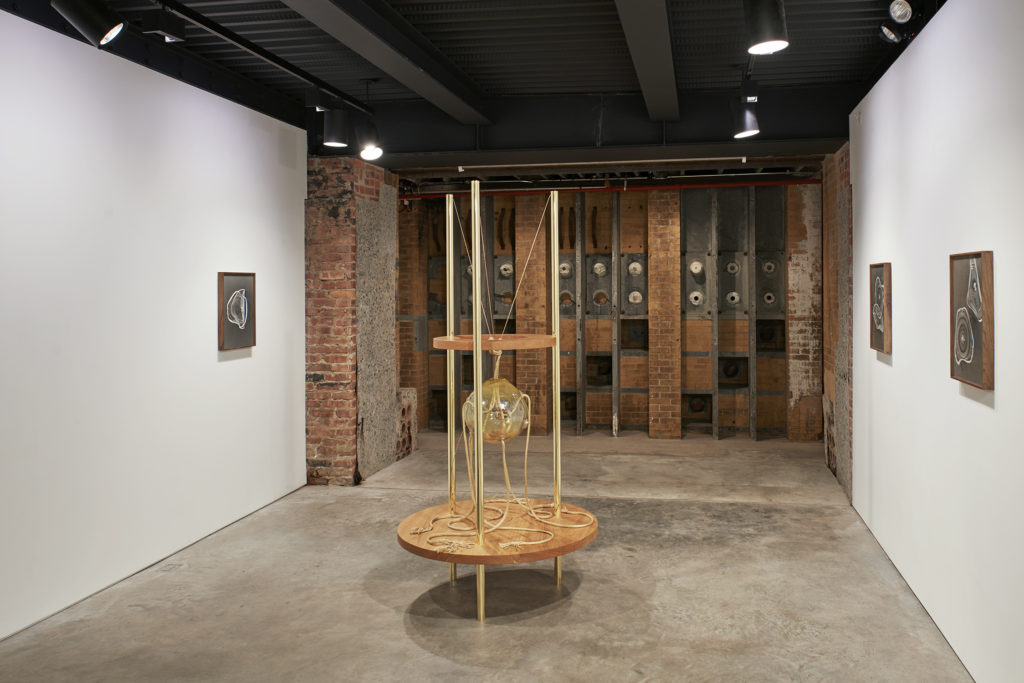 KA: In SculptureCenter’s basement, I was drawn to the most geological and impacted parts of the space: the patina of the concrete walls, the jagged broken concrete nooks, the arched cutouts carved into several dividing walls. I wanted to embrace these characteristics and allow them to become a framework, to have a conversation, not an interdependency, with my objects and images. The lack of natural light seemed especially useful for projections and allowed me the opportunity to produce a film work that operated as a lighting device for a screen (‘Shadow Film’). I then used the only window, a stairwell skylight, to create a contrasting work that accumulated sunlight through solar panels, which periodically illuminated a glass object that hung below.