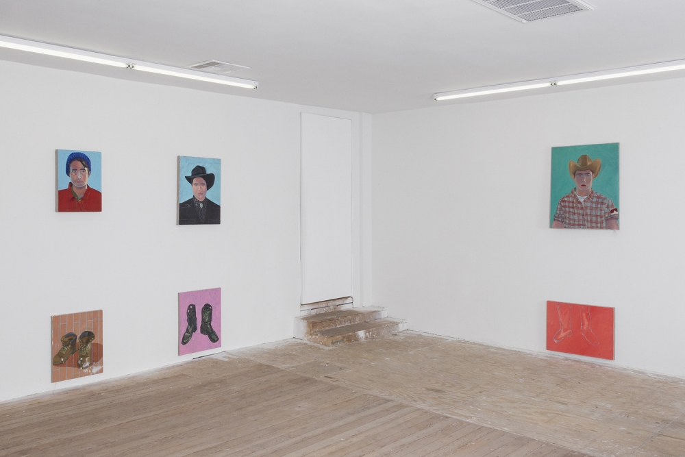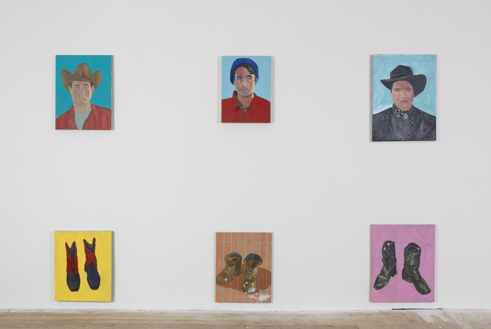 Mexico City-based Segovia de Fuentes looks at masculinity and absurdity in Boys and Boots, where a series of small paintings of cowboy heads and footwear are mixed and matched.