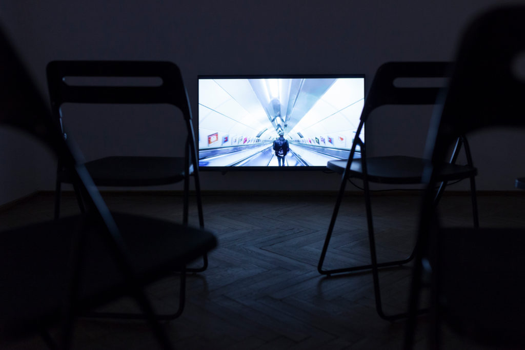 Kareem Lotfy soundtracks Slides, setting the tone of eerie somnambulance that accompanies the characters’ movements through empty tube stations and buses, a BMX track, down a darkened street wearing a pair of light therapy glasses that simulate the sun for sufferers of jet lag. “The film is definitely inspired by my own experience of being in China in 2016,” Kohout says about his time spent on a two-month residency at I: project space in Beijing. “I was 11 hours ahead of Berlin and I was communicating with my girlfriend at the time, mostly by recording these voice messages. Walking around somewhere I would feel, ‘wow this is crazy, it’s really something I need to share’ and I would describe it in an audio message. In the film, this is like a detail but a lot of the time they speak to each other while making these audio messages. They say, ‘look!’ They tell the other person to look, which is of course nonsense, in a way, but somehow I feel like it does make sense, it’s not totally out of place. So the film is inspired by me having not only temporal distance but spatial distance between me and the person I want to be in touch with all the time.”