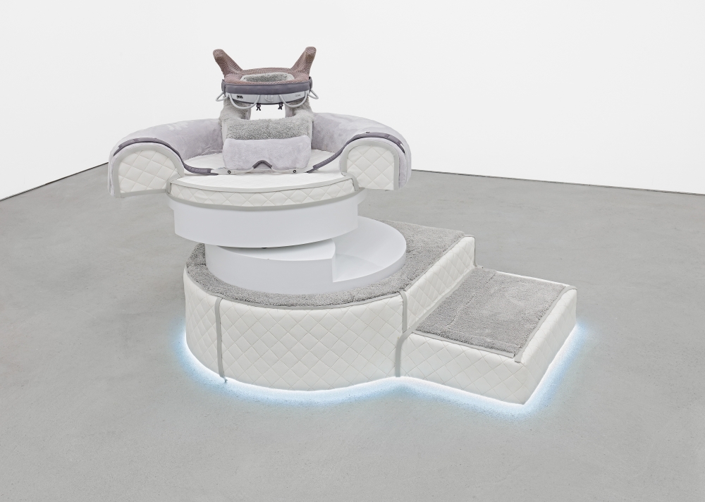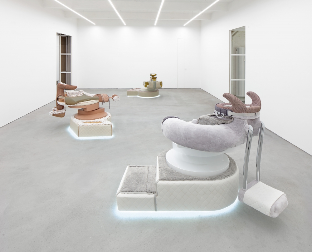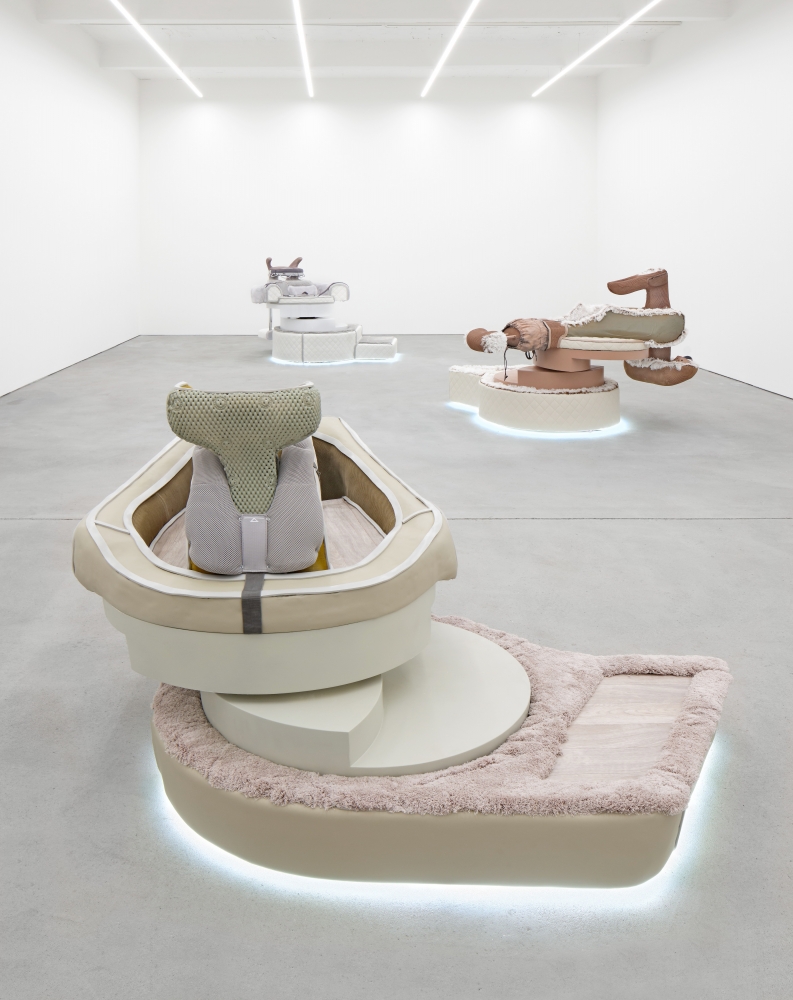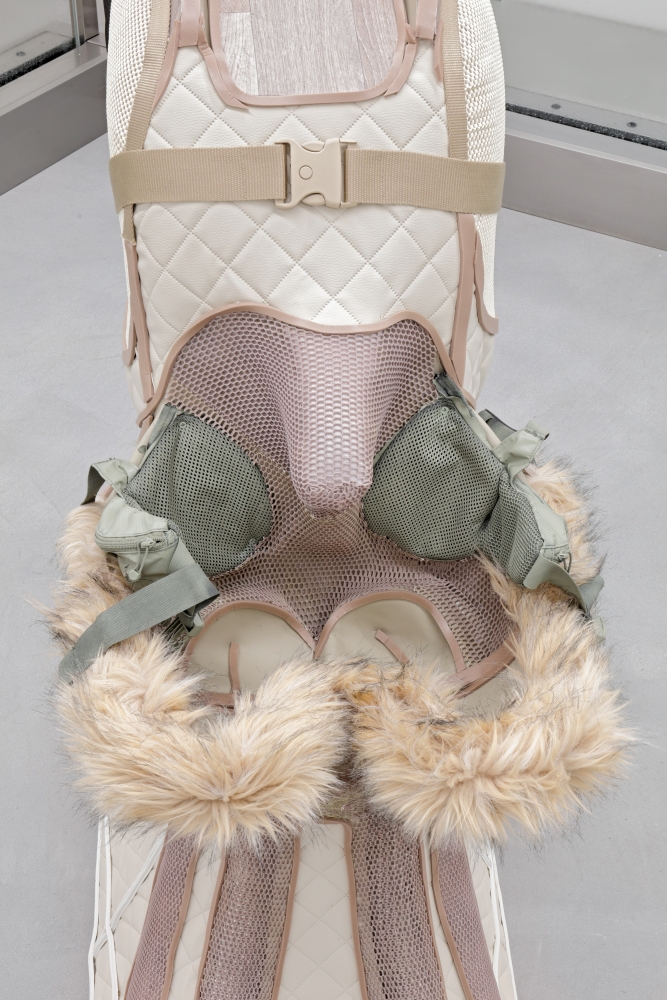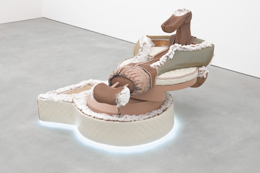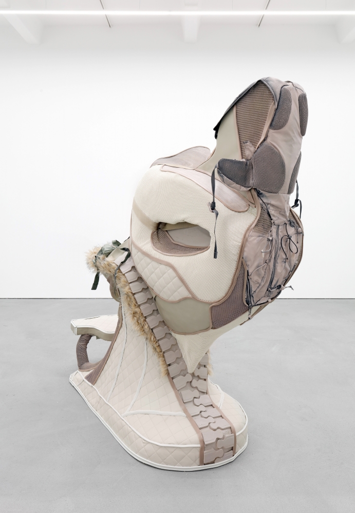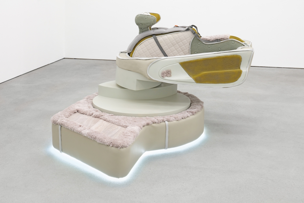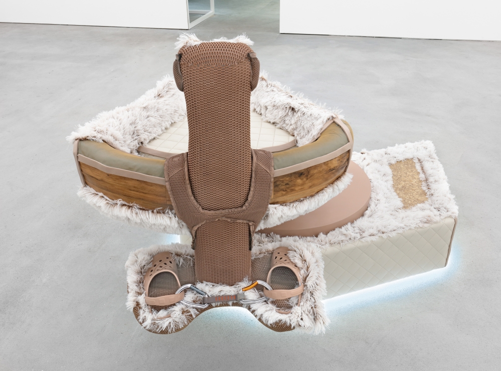 From styrofoam, acrylic resin, fiber glass, coffee tables and car interior elements, to hiking backpacks, crocs shoes and aluminium climbing, Uddenberg appropriates a large amount of material into “quasi-functional objects” that create “unexpected scripts for the bodies that might occupy them.”**