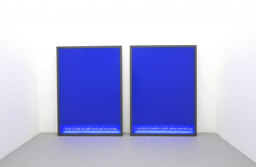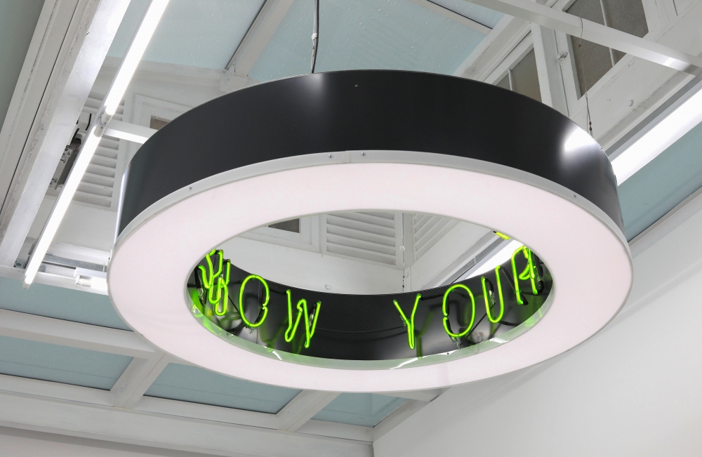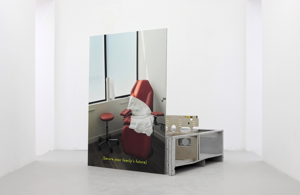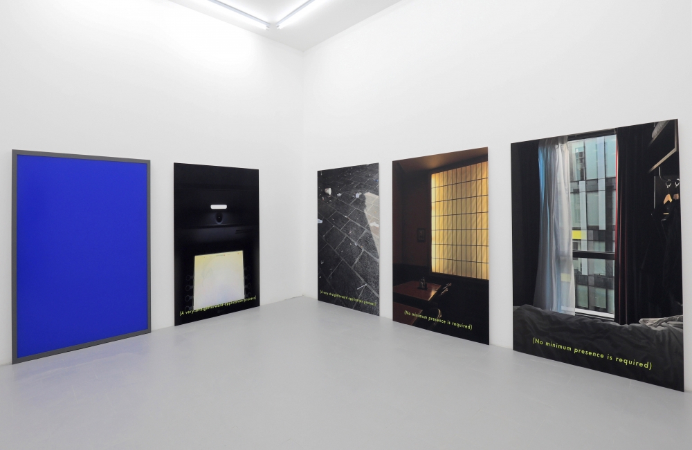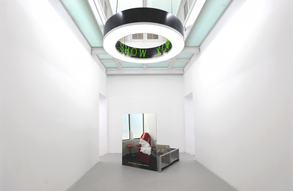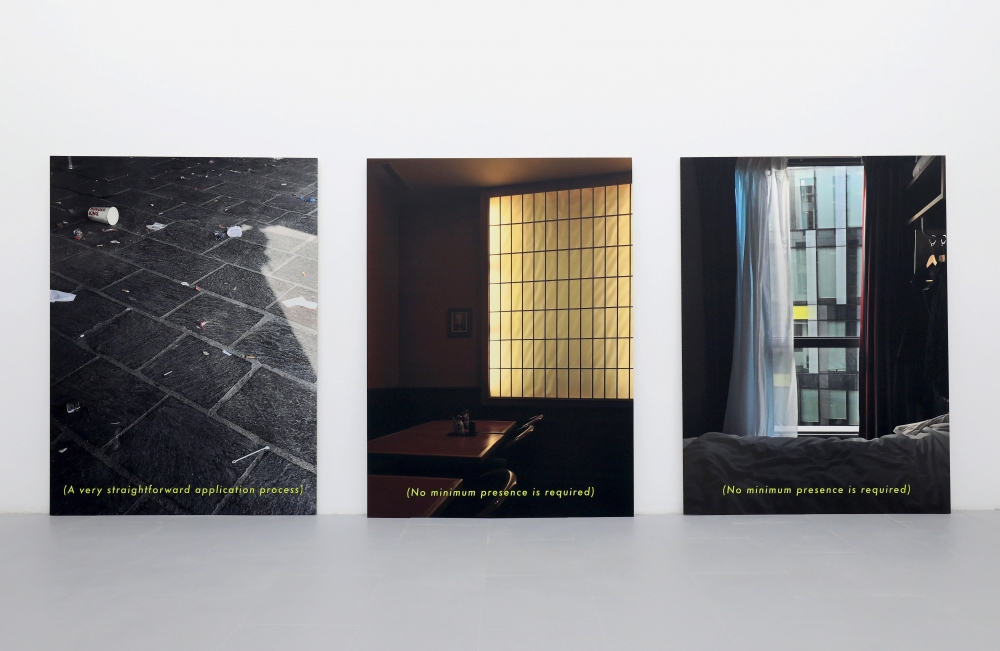 Familiar sentences and slogans are scattered throughout the space; a circular sculpture hanging like a light fixture reads ‘Show Yourself Out’ in neon writing, ‘(A very straightforward application process)’ and ‘(Secure Your Family’s Future)’ are written at the bottom of a series of large C-prints. Efficiency, communication and orientation begin to break down and lose their original meaning, and “proclamation longs to dissolve into something bigger than itself.”**